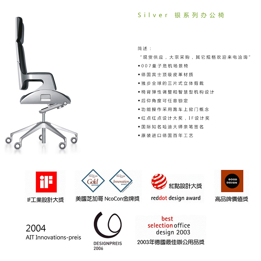 Silver以21世纪第一张座椅,让人再2004年Orgatec(德国科隆国际办公家具展)上为之震惊。呈现未来,主打术简风格,国际知名建筑师Hadi大师秉持“产品设计是微缩建筑“的设计理念,追求一种完善的包浩斯理念,即一切风格统一。是Hadi专属的功能和情感的结合,Silver 是我们对建筑的应答,而建筑本身激发了全新的灵活办公环境视野。