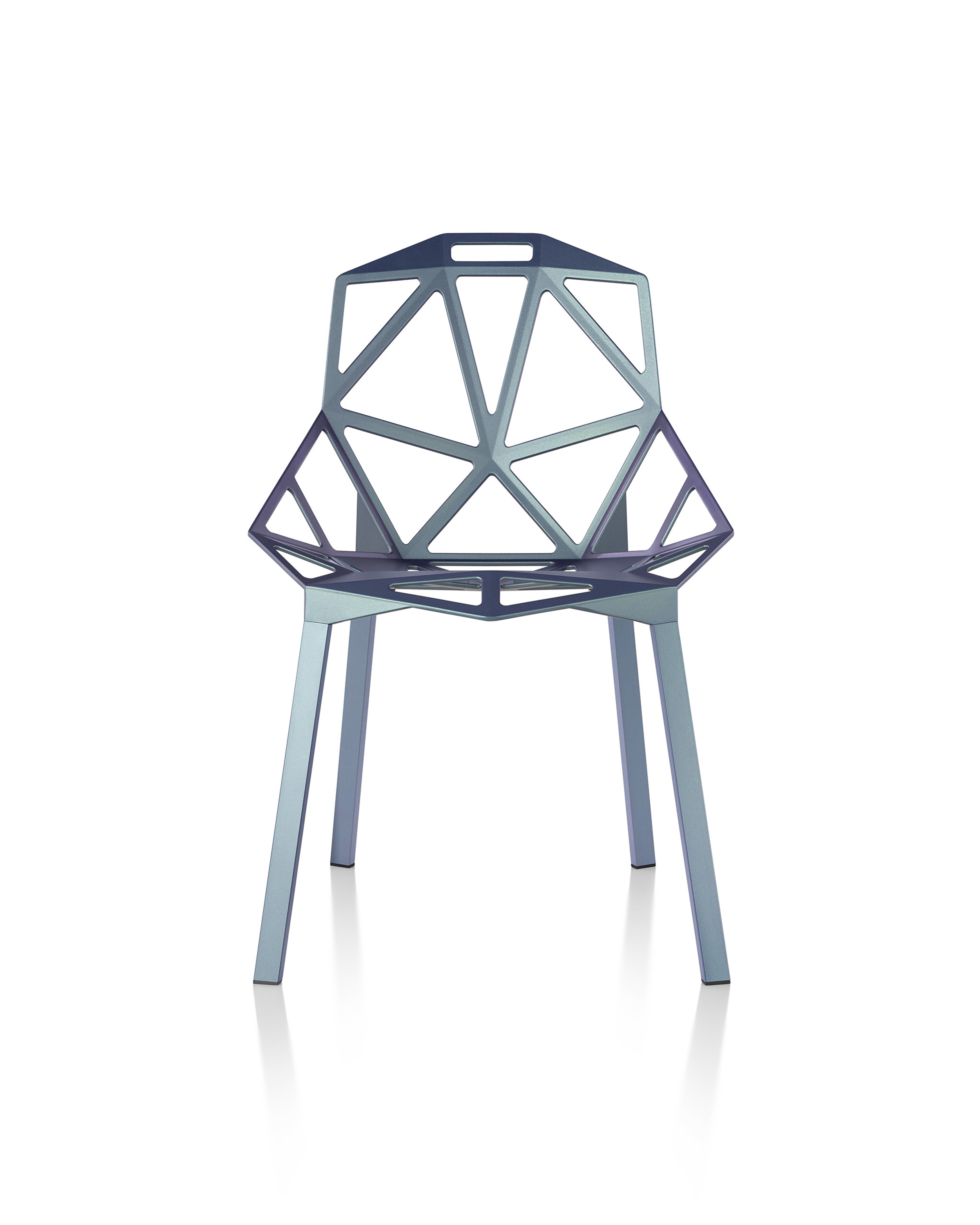 最受瞩目的德国设计师Konstantin Grcic 应邀为MAGIS 设计的Chair One(几何吧椅),是设计生涯中最具有标志的产品之一。办公椅体为模铸铝合金结构,经过氟化钛镀膜与塑料粉末涂布。椅子具有阻燃性、抗腐蚀性。适合室内及室外使用。以铝金属与钛金属制成的 Chair One,以多个平面以不同角度组合而成,建立起立体的外型。多个中空的三角型组合而成的座椅,不但令为用家带来强而有力的承托结构,而且还能在简单设计之中带出不一样的风格。这把椅子的惊人形象难免使人对它的舒适度产生疑问,但当你真正坐于其上,你会发现它实际上非常舒适,那些稀疏的网状结构能够极好地支撑不同体型的人体,后背上的把手也非常实用。当你知道Chair-One最初是被当作户外用椅而设计的,你会更加佩服Konstantin Grcic的缜密用心:极少的表面可以杜绝雨水,并且减少灰尘堆积,夸张的形态则令它能够在街道、建筑或自然的环境中拥有自己美学上的存在,而不是被环境所吞没。Konstantin Grcic花了三年时间设计Chair One,自2003年诞生以来,堪称Grcic精简主义风格的代表作。2006年,Chiar One为Konstantin Grcic赢得了德国政府的设计大奖。