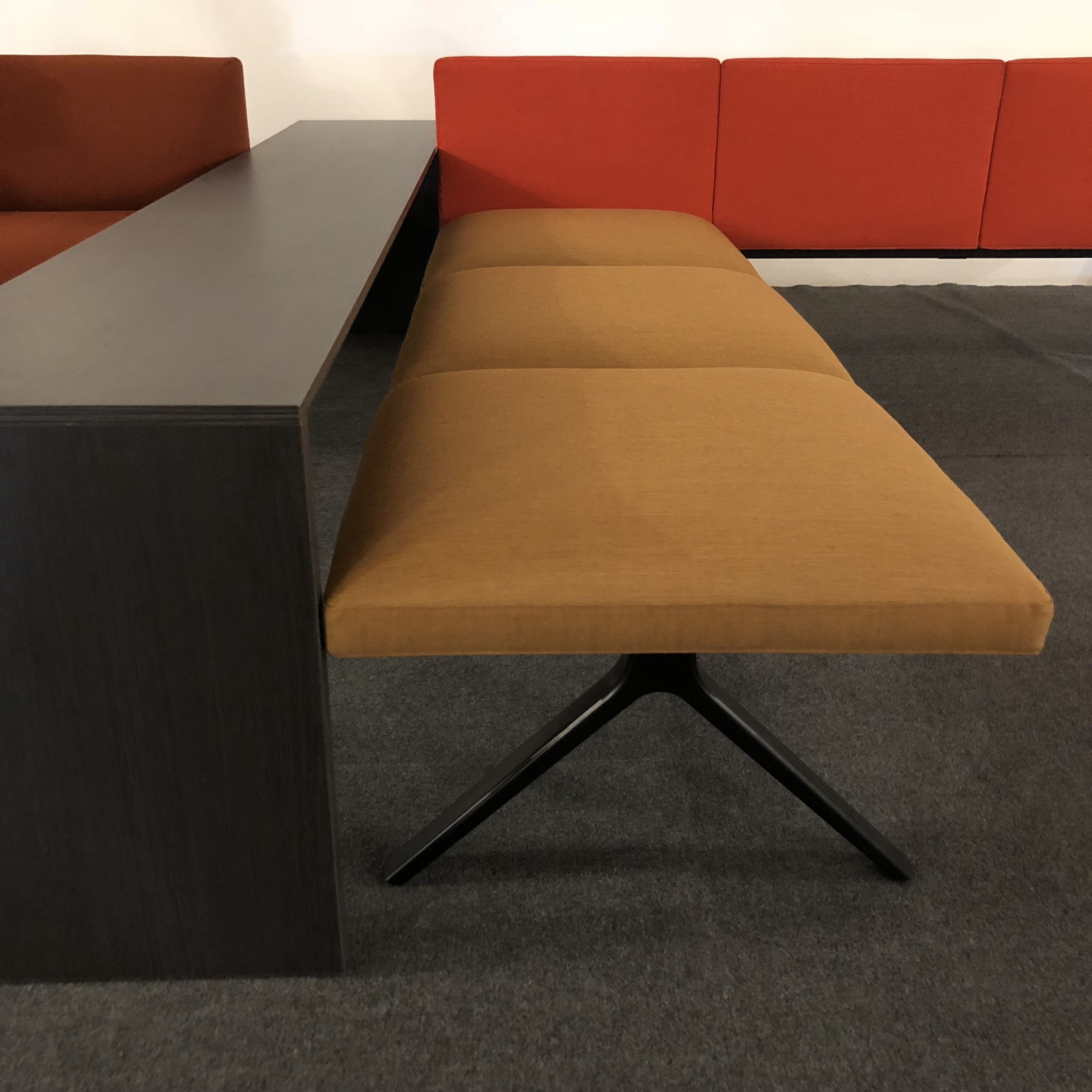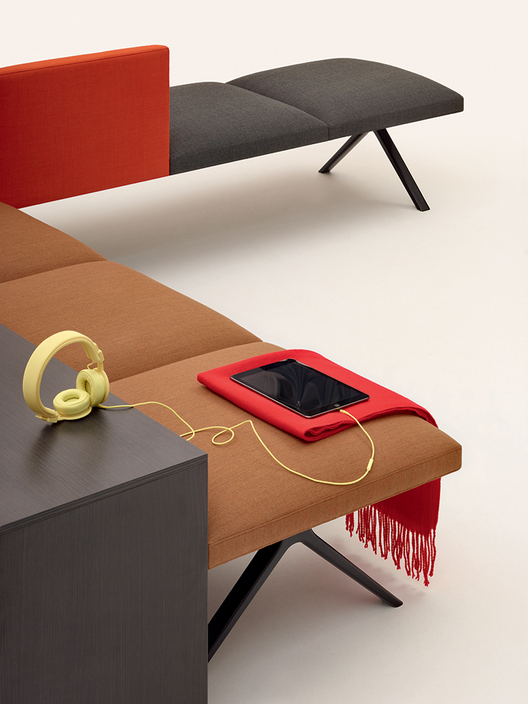 Kiik是一个模块化系统,由各种尺寸的框架组成,可与垫子结合,可提供或不提供63x63 cm靠背,座位高度为45 cm。Kiik桌子有不同的形状和尺寸(矩形、方形、三角形、四分之一圆形),因此允许线性和L形模块(120°和90°)。该系列的补充是一个控制台与252x40厘米的三个高度顶部:58,72 e 105厘米,和126x157.5厘米的座椅高度36厘米的搁脚凳。