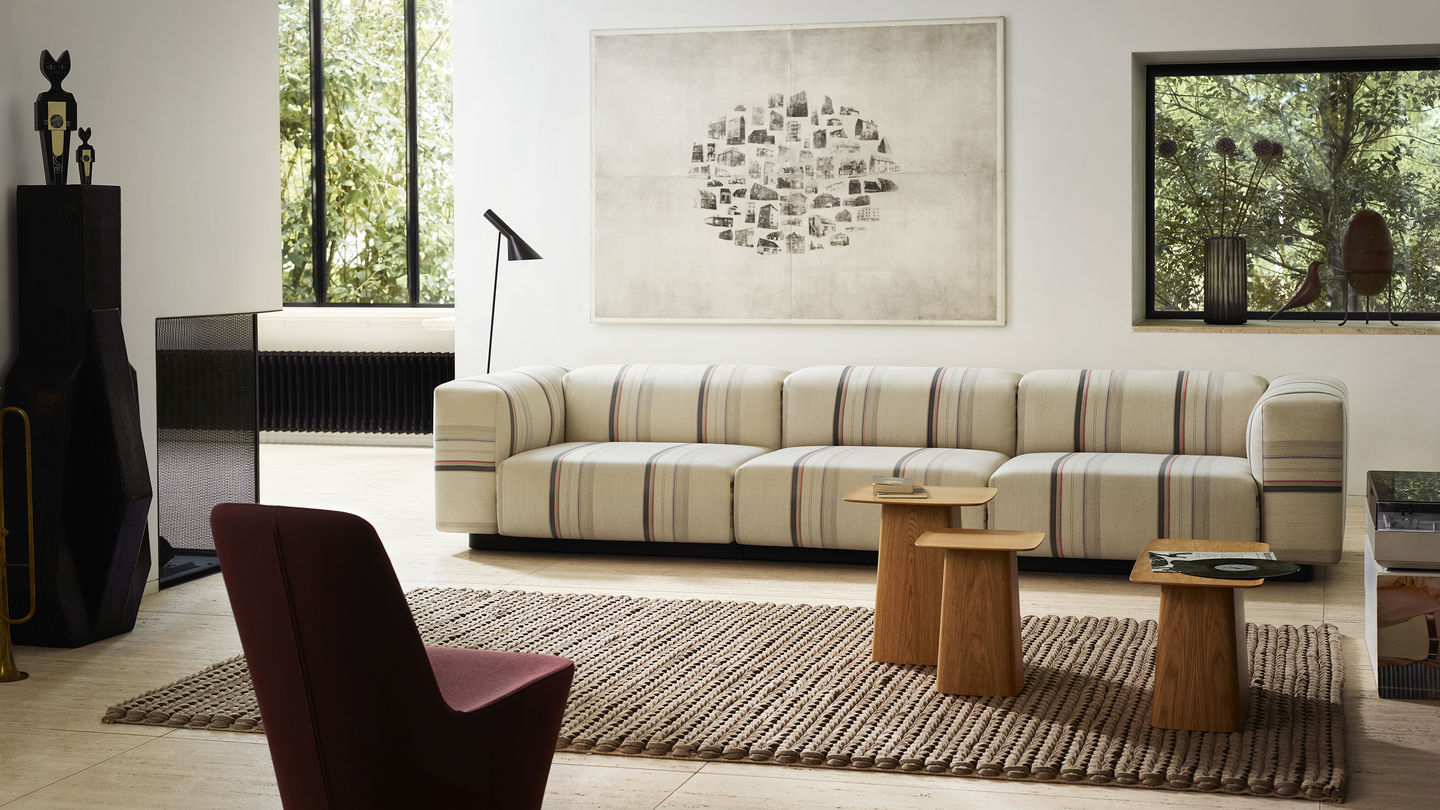 Aura Stripes是一种新的条纹面料,唤起了光影的俏皮效果,被英国设计师选中,以强调沙发在许多可能配置中的简洁线条。 Aura Stripes采用彩色大理石制成,从2018年9月1日至2019年12月31日,Vitra作为Soft Modular Sofa的覆盖面料独家提供。