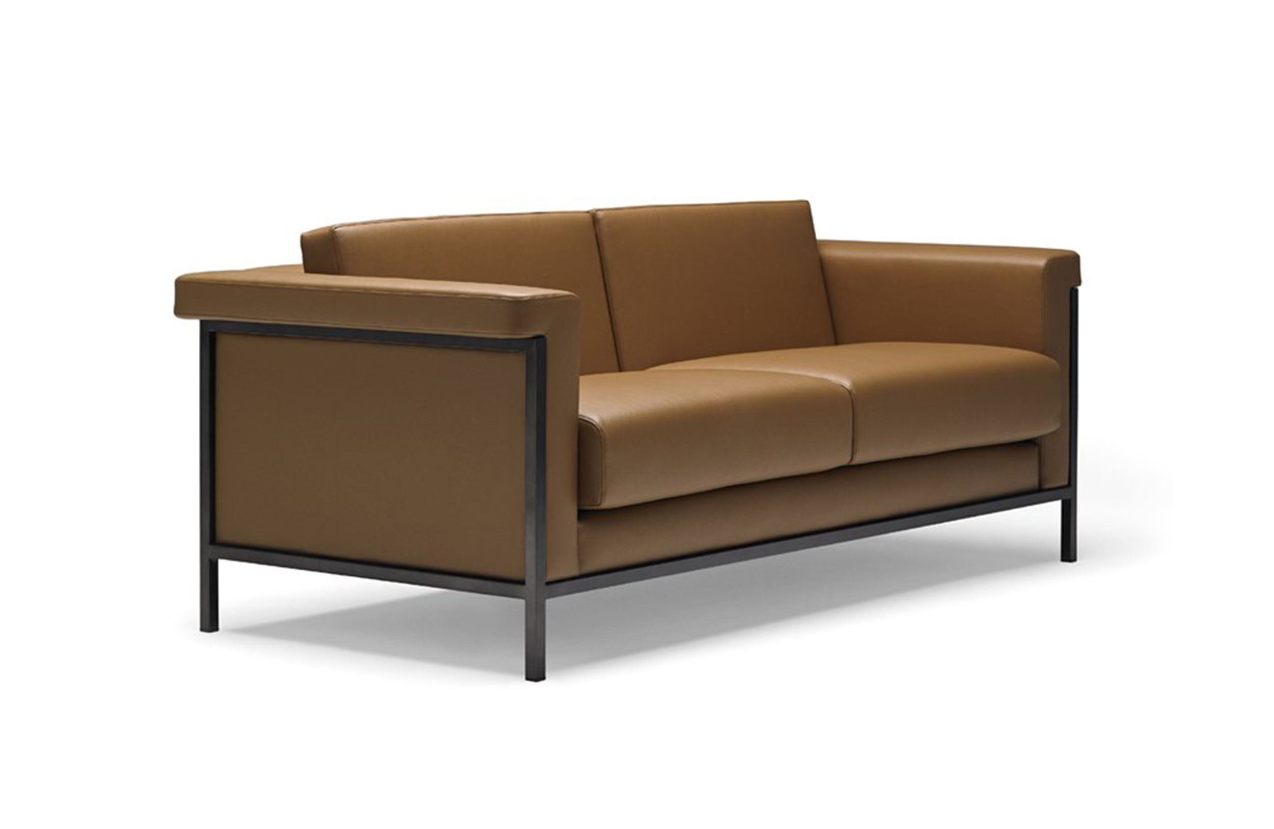 安装在黑色漆金属无框架上。一体式框架,无接头。低靠背与扶手齐平。可拆卸座椅和靠背垫。