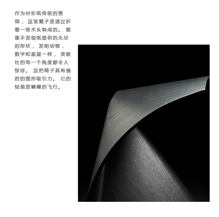 作为对折纸传统的赞颂,这张凳子是通过折叠一张木头制成的。就像手发现纸提供的无尽的形状,发明动物,数字和星星一样,美联社的每一个角度都令人惊讶。这把椅子具有强烈的图形吸引力。它的轻盈是蝴蝶的飞行。