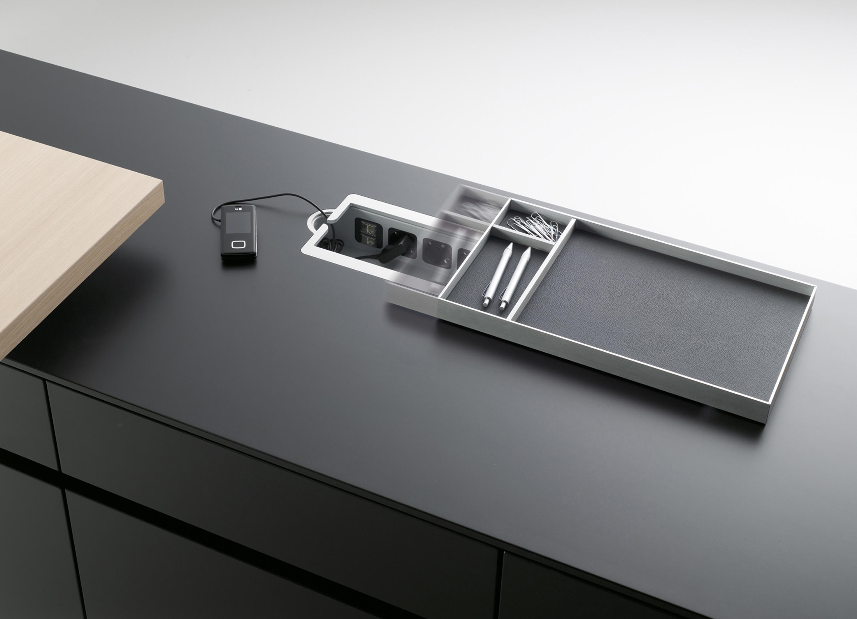 桌面带滑动真皮垫,内部隐藏了笔盒、纸盘及走线等功能