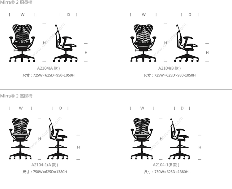 Mirra® 2 职员椅 系列尺寸/示意图
