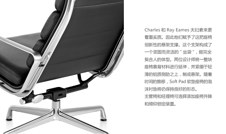 Charles与RayEames夫妇是20世纪最有影响力的设计师,卓越的设计涵盖了家具、建筑、影像与平面设计。他们从二次世界大战中美国海军的实验计画中学习经验并发展可谓是现今工业中使用模铸胶合版的先锋,这对设计界的超级夫妇档自1940年参与了由MOMA举办的有机家具设计大赛,自今已有近百件他们的作品被各大博物馆所永久典藏。Eames® Soft Pad Executive Chair(伊姆斯软包大班椅)是夫妻俩1958年设计的,是在全铝系列的基础上发展的另一系列Eames产品。舒适系列在全铝的椅架上增加了皮革制的柔软坐垫和靠背,高级铝合金制作,压模五星脚,可旋转。背垫和坐垫,采用西皮,具有透气性强,内部填充高密度定型绵,不易变形,不老化,依人体坐姿,符合人体工学,耐水及对人体无害等优势。椅子扶手选用优质电镀铝合金扶手,手感舒适,永久不生锈。转椅底盘为多功能底盘,可以保护使用者长时间坐用腿部健康,且作为高度可多定位调节。气压棒采用的气杆是正规厂家出产的外贸气杆,每一根气杆都有钢印,经过严格SGS检测的才可出厂,旋转、升降自如基本无声响,使用寿命长,可承受250kg,可升降数万次,将椅面调至与膝盖同高时,使用者坐下后双脚跟可垂直平放于地上,且大腿与地面平行,最符合人体工学理论,使用者长期久坐,也不想疲惫。办公椅脚为铝合金材质永久不生锈、承受能力强,安全更放心。椅子脚轮采用优质电镀片脚轮,耐用而美观,可以随意变换位置,贴心更方便,具有防震及防松脱,让椅子的安全性能更加可靠。