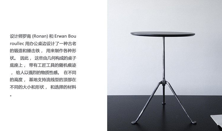 设计师罗南(Ronan)和Erwan Bouroullec用办公桌边设计了一种古老的锻造和锤击铁,用来制作各种形状。他们的目标是“利用这个古老的制造过程,给它一种新的视觉语言,”Erwan说。语言具有真实性和思想性。罗南指出:“通过对那些赋予它们形状的工具的随机、机械痕迹的反射,这些东西给工业计划带来了一股清新的气息。”