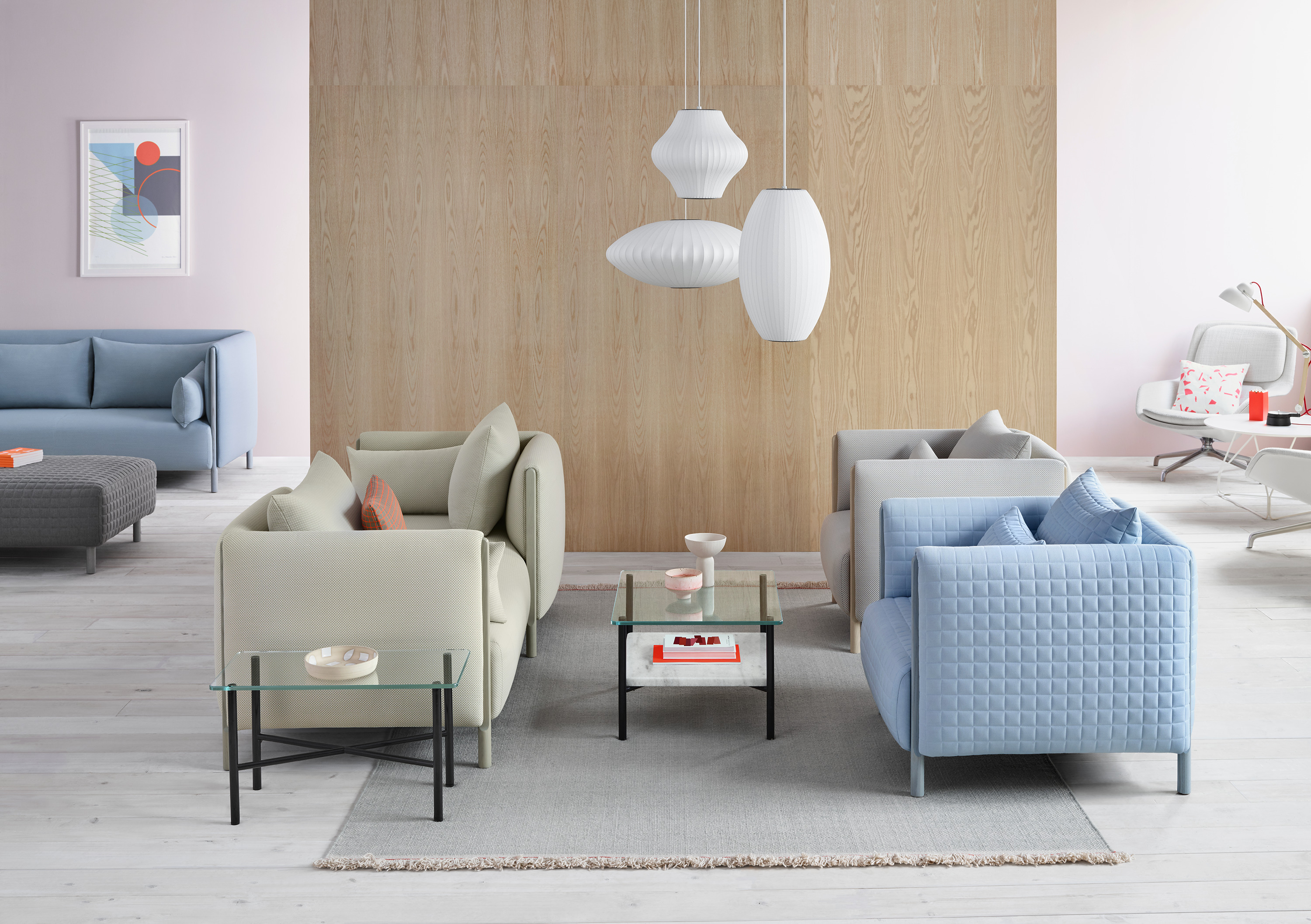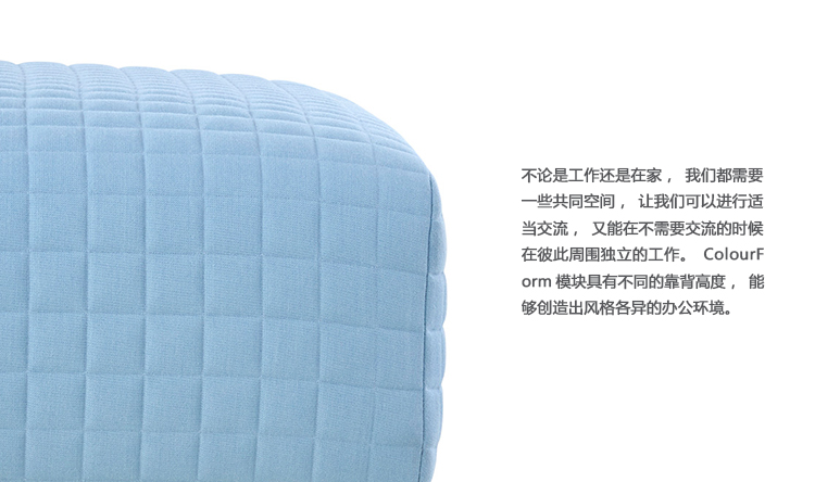 不论是工作还是在家,我们都需要一些共同空间,让我们可以进行适当交流,又能在不需要交流的时候在彼此周围独立的工作。ColourForm模块具有不同的靠背高度,能够创造出风格各异的办公环境。在需要隐私的时候,可以利用高靠背的独立组件隔断周围的环境,又可以用低靠背的模块创造出促进协作的配置。二者结合在一起,可以开创出各种有意思的地形或者引领客人穿过优雅的空间。
