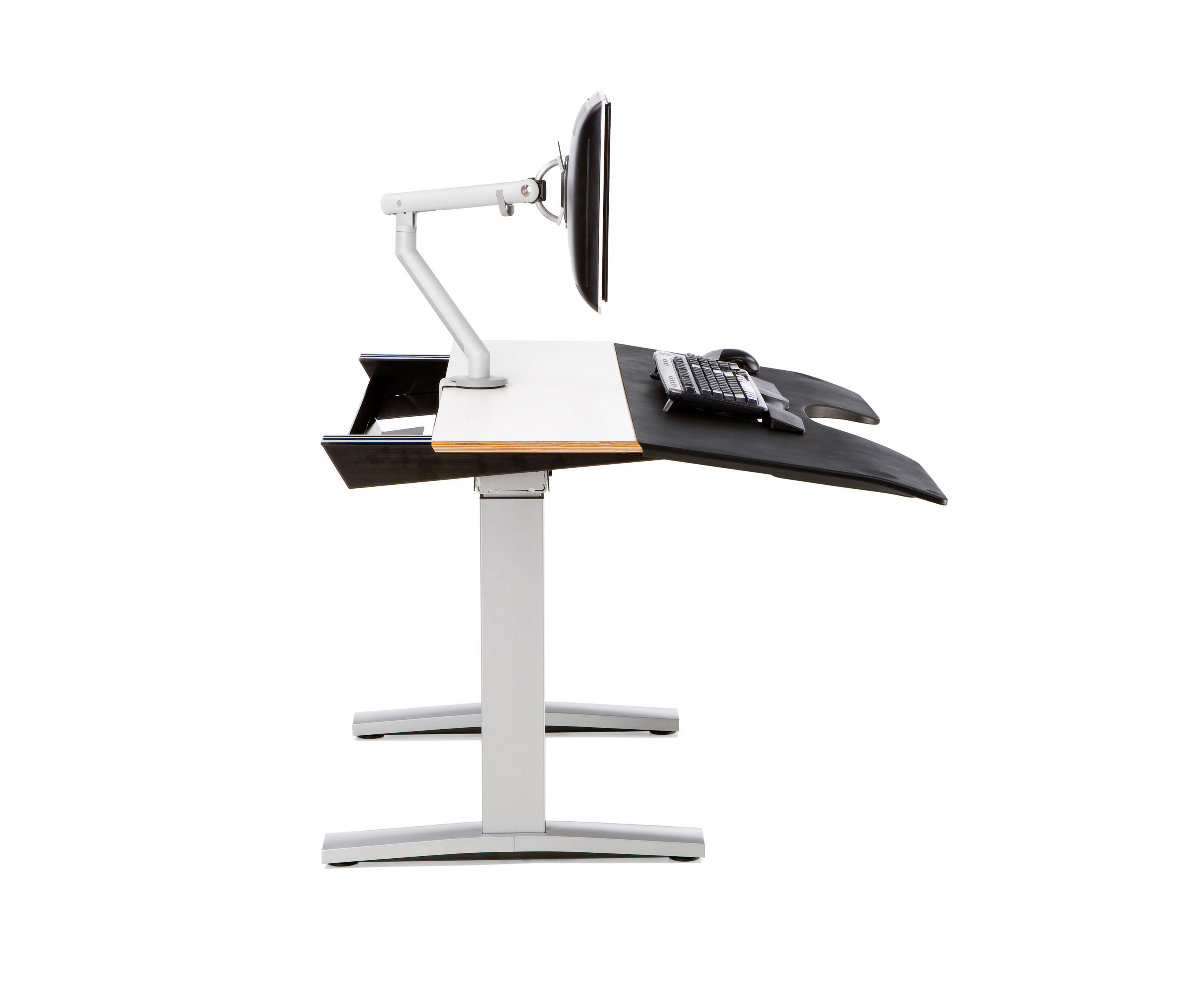 人会动,座椅也会动,为什么桌子就不能动呢?Envelop有着灵活的工作台面,在工作时可以滑动将您包围,是首款帮助您、座椅、工作台面和您的技术协调工作的办公桌。可使用标准销轴高度调节或坐姿-站姿高度可调桌腿,Envelop可以全面支持健康的坐姿与站姿。
