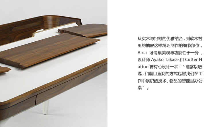 从优雅的木材和铝材组合到精心制作的细节,如软木衬里抽屉,Airia将美观与功能完美结合。 设计师Ayako Takase和Cutter Hutton的动机是设计一个“智能桌面,承认技术和我们在工作时积累的东西,但是以微妙,集成和直观的方式进行。”