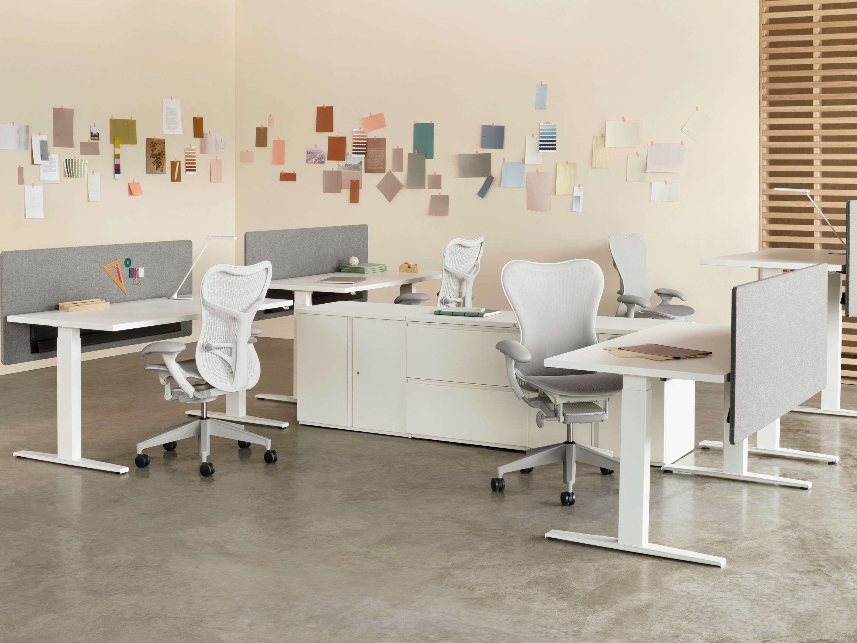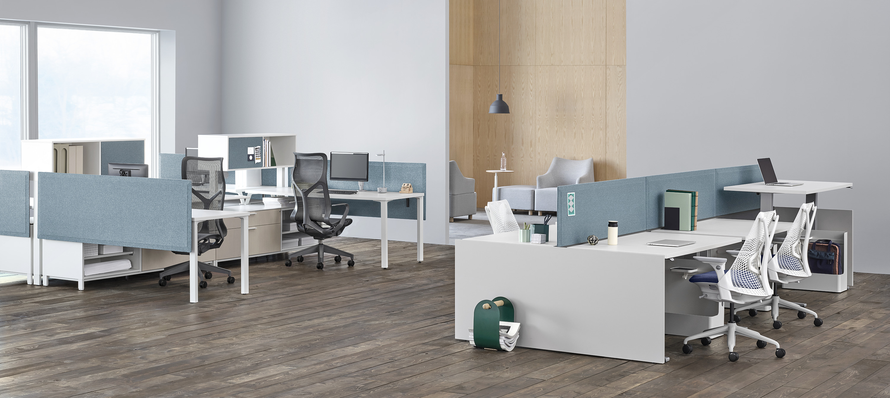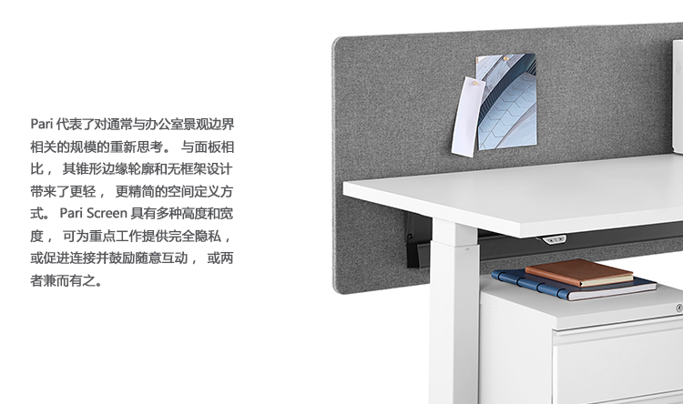 Pari是一个屏幕系列。 有些版本是独立式的,有些版本是贴在表面或框架上的,所有版本都是可粘的,并且共享无框架,薄的外形。 它们一致的细节和互补的颜色有助于美学的连续性,因为它们描绘了空间并提供了隐私。 Pari Screens与许多Herman Miller产品兼容,可在办公室环境中进行设置。 使用Pari Screens,组织可以压缩工作站并在较低的墙壁高度进行标准化,而不会牺牲员工所需的隐私,以便他们可以集中注意力,或创建个人空间的边界让他们感到舒适。