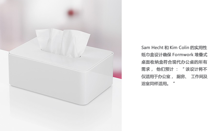 Sam Hecht和Kim Colin的实用性纸巾盒设计确保Formwork堆叠式桌面收纳盒符合现代办公桌的所有需求,他们预计:“该设计将不仅适用于办公室,厨房、工作间及浴室同样适用。”