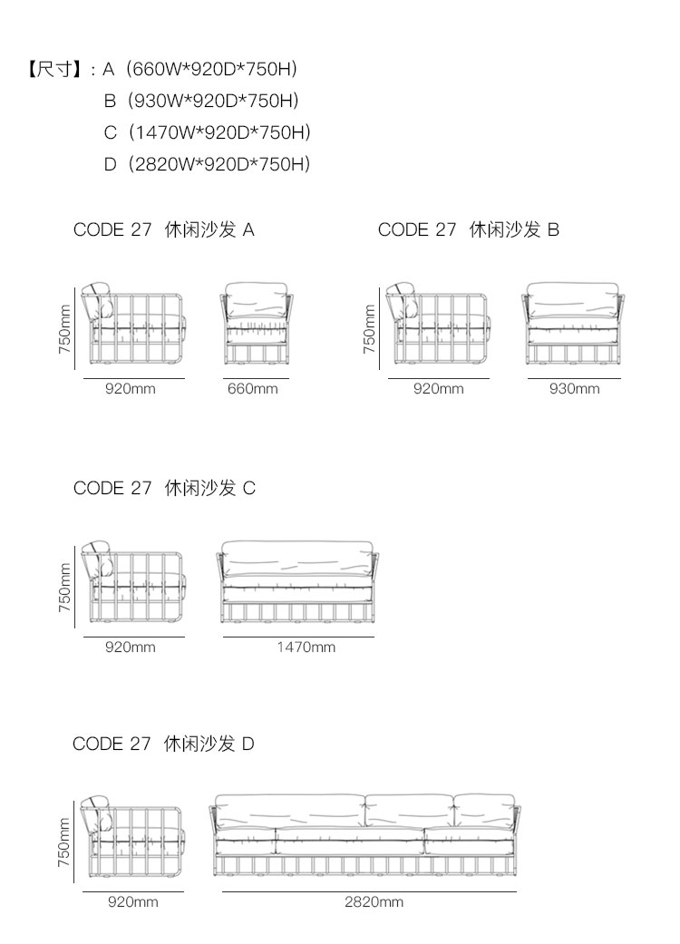 CODE 27  休闲沙发 系列尺寸/示意图