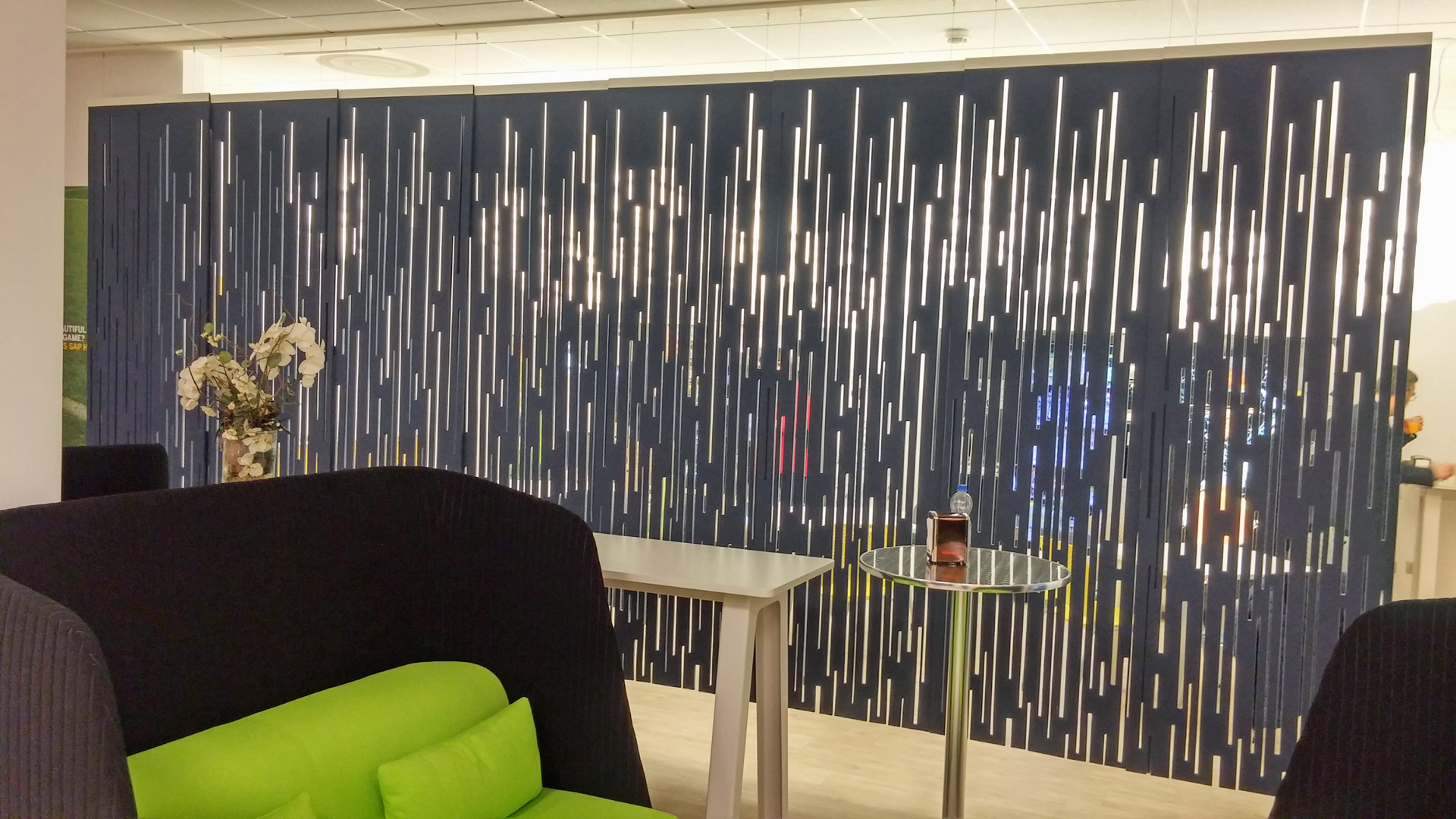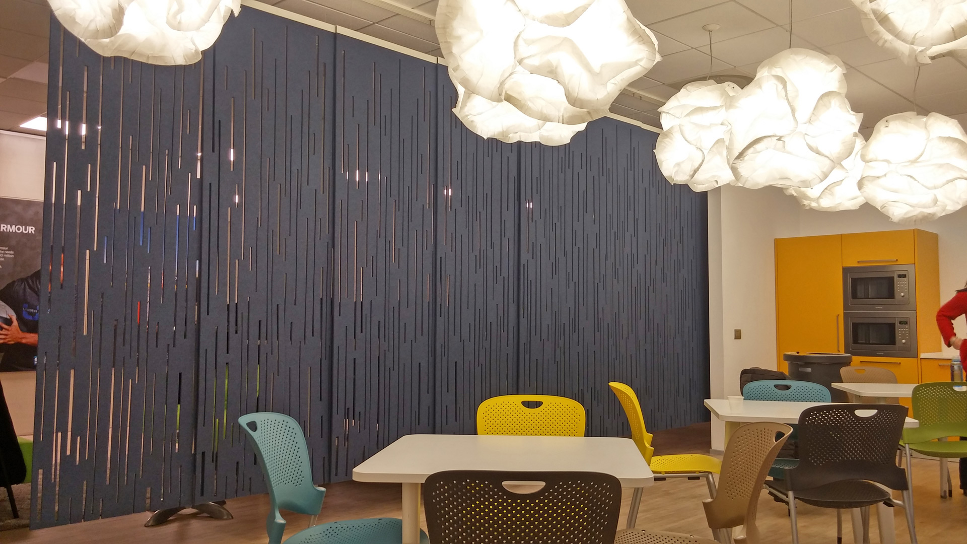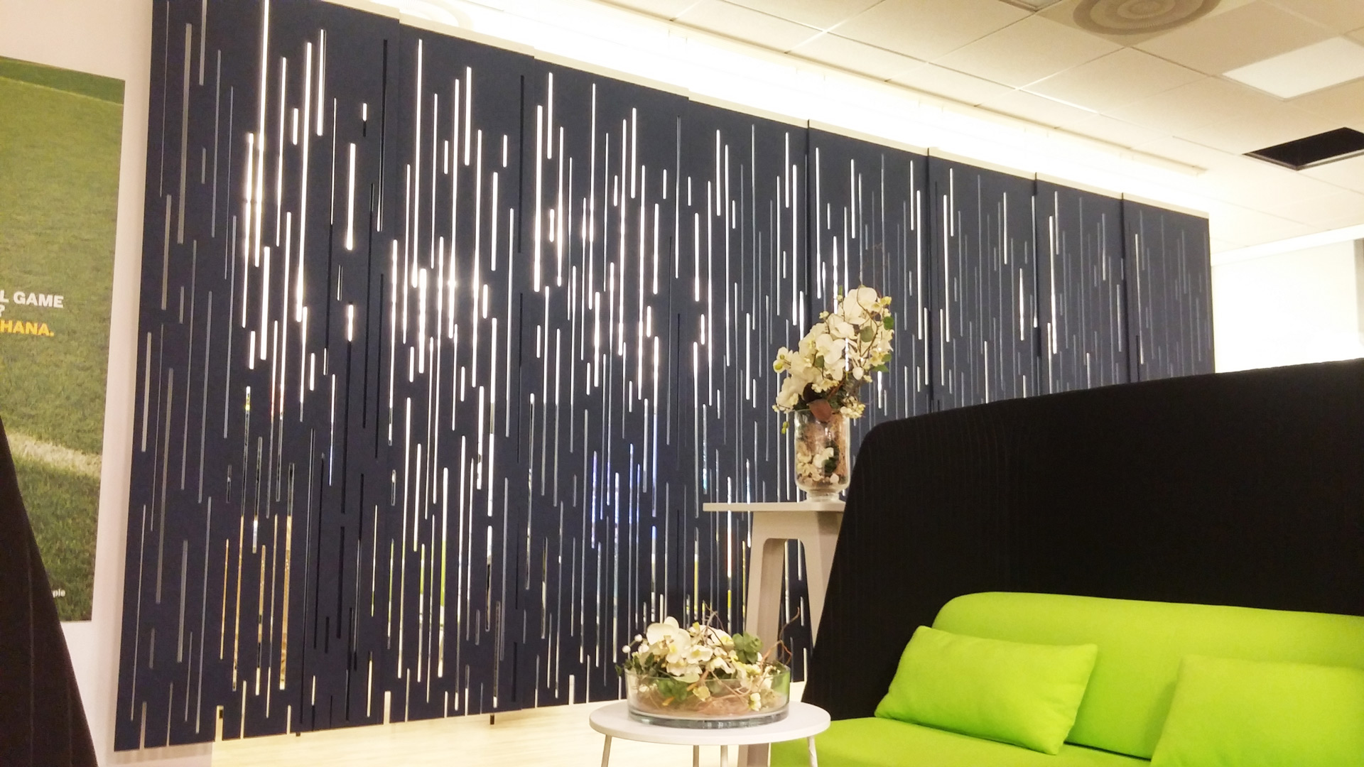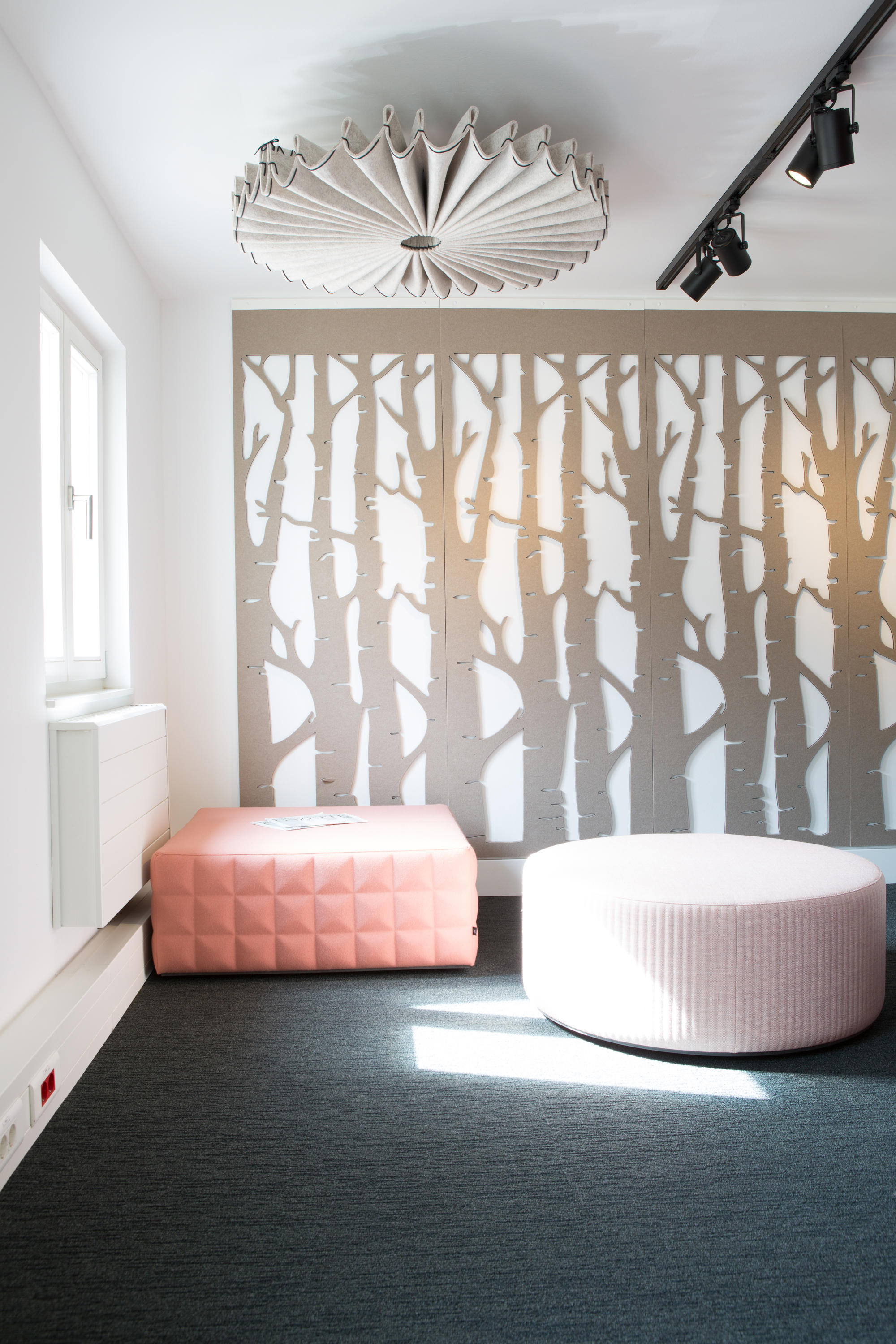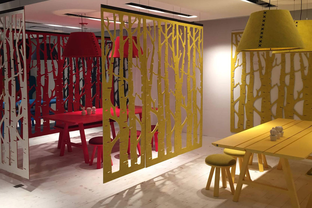通过这种浮动的装饰面板集合创造一个隐私层,这些面板提供具有声学优势的艺术风格。它们将有助于减少声音的传递,并减轻诸如铃声之类的高音以及键入和点击的声音。它是一种优雅的元素,可将房间划分为一体。这些吸音板由双层BuzziFelt制成,采用大胆的图案进行精确切割,并具有一系列亲生物和几何图案。 您可以选择将BuzziFalls安装在墙壁或天花板上还是悬挂在上面。BuzziFalls Rail是另一种选择,它可使面板轻松滑动-创建可移动的房间隔板,从私人空间转移到公共空间。 面板在一条三米长的轨道上运行,面板从左向右滑动。通过为导轨安装两层平行轨道来创建滑动门的效果。 使用可用的新材料选项BuzziFelt Printed将BuzziFalls提升到一个新的水平 。如果您无法决定自己的喜好,请从10张照片中进行选择,并选择一张或两张照片的组合来选择不同的外观。 吸音毛毡结构可确保从正面到背面都具有充分的声学性能。它减轻了区域之间的声音传递,并吸收了高频音调,例如同事的颤音,敲打声或铃声,这使其成为开放空间中的理想空间分隔器。