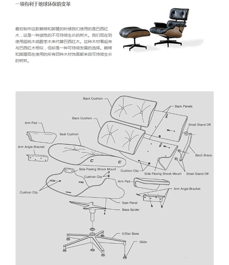 一眼就能看出这是Eames经典的躺椅。被选为主要美术馆的永久珍藏品,也被作为纪录片和书籍的恒久主题,给您的住宅提供优雅的风格和豪华的舒适感。