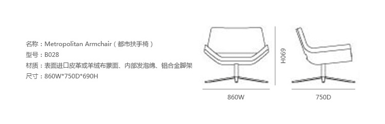 Metropolitan Armchair(都市扶手椅)是由Jeffrey Bernett为B&B Italia设计的经典款扶手椅。Metropolitan扶手椅发表后,不仅成功引起在地与各国际市场的迴响,而且广泛地被世界顶级公共空间专案所採用。因为工业设计师Jeffrey Bernett坚信,「设计,就像是生活经验里的电影、艺术和建筑创作,是经过一连串反射镜与折射透镜的交互作用,并细细记录变化过程后的点滴结晶;对每个设计师而言,重新延伸并再度以较长时间累积后的经验,又一次诠释同一经典作品;自己与品牌一同在这过程中探索、尝试全新材质与製程,并理解到哪些过往的细节可以再被进化,真是种饶富趣味的挑战。」因此,在 2014 年米兰家俱展再次推出另外两种组合,无论是以人体工学设计的低背或高背结构作为头枕,并巧妙地用隐形腰部支撑让整体作品变得越来越薄,且外型的线条更强化原创性流动感的设计语汇;量身定制的接缝突出某些关键领域和座垫,这是不沾边了,全然地一体成形。乍看之下, Metropolitan’14低背扶手椅的面貌,像极一个温暖人心的「微笑」表情,亲切友善地邀请每个人慢慢坐下,享受稍息片刻的休憩;相反地,高背的 Metropolitan’14扶手椅可提供人们想要暂时与世隔绝的生活需求,并可以绝佳舒服的姿势窝在这小小避风港里头,自在地平静致远。高背与低背两种都可再加上脚凳或旋转功能扶手椅的选配。
