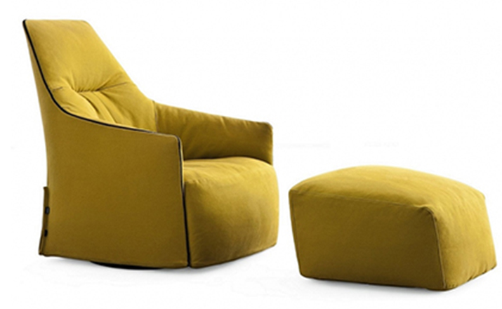 "The Santa Monica Lounge armchair,characterized by a unique design,is a project conceived by the French designer Jean-Marie Massaud,and it is produced by Poliform,a leading company in the made in Italy furniture manufacture.The Santa Monica Lounge armchair on sale in our showroom is matched with the Santa Monica ottoman.Both the items are covered in fabric,yellow colour,with iron coloured stitches."