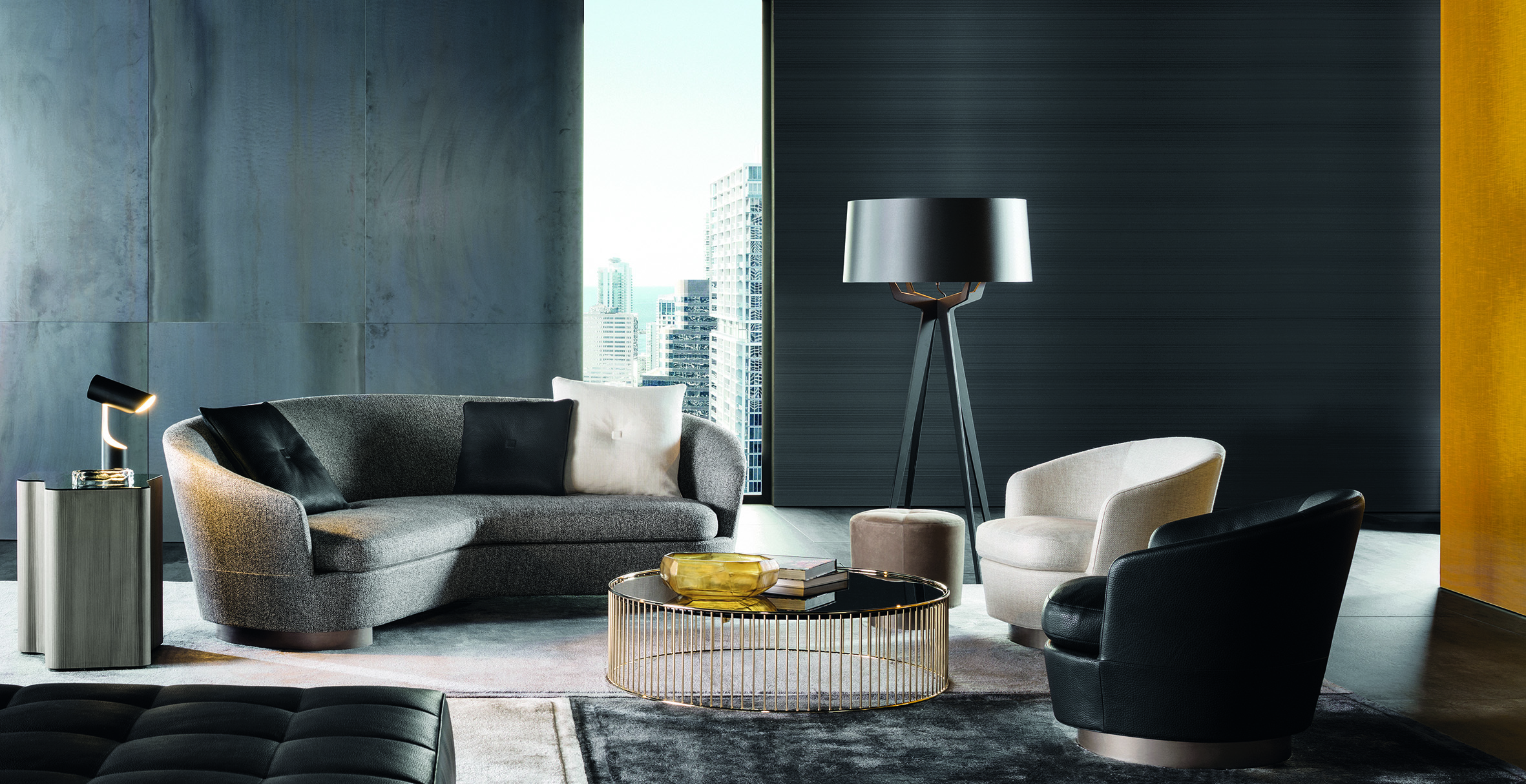 柔和的造型、紧凑的比例和具有视觉冲击力的细节呈现出精致的美学语言,金属基座采用淡铜色的表面设计。