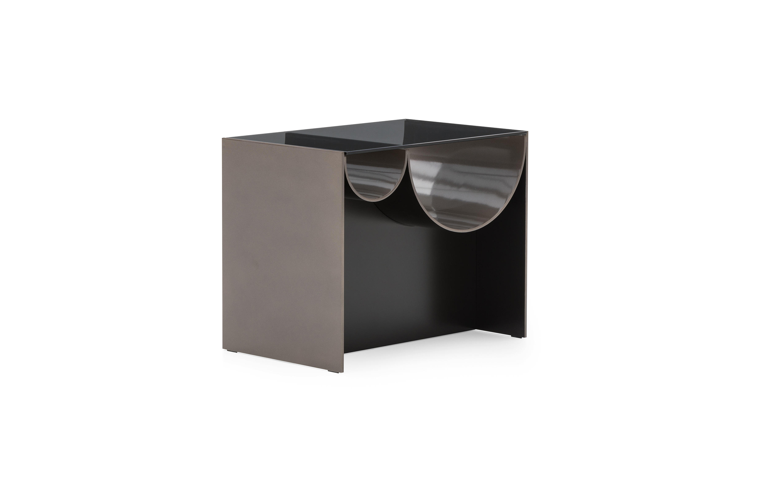 波浪咖啡桌是由一种烟熏的灰色玻璃制成的,它由一种漆成的铝结构支撑着,外面是一种沙子或浅青铜色的色调,里面有一种淡黄色的色调。