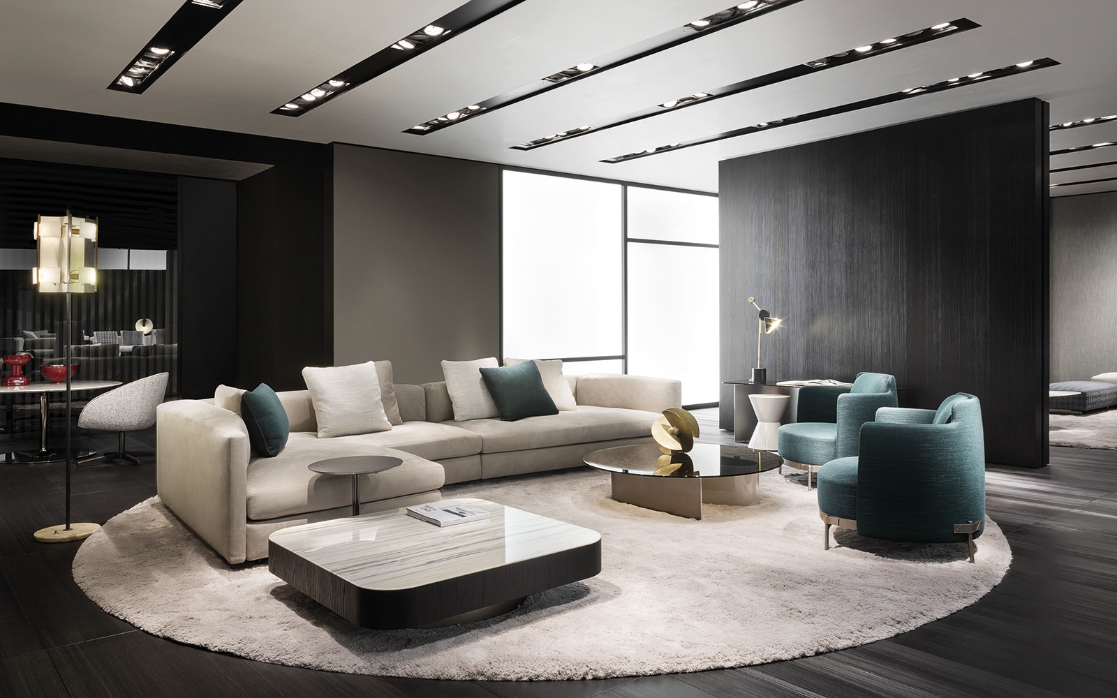 由悬挂的几何体积和较低的高度相结合形成的,在圆形、方形、矩形和梯形的版本中都有米尔顿的侧表。这些几何图形被圆角的圆角所软化,这让人想起了亚历山大“下降”座位系统的蜿蜒曲线。它们的特点是对70年代的线条进行了更为现代和装饰性的重新诠释,展示了珍贵材料和有机几何的完美结合。