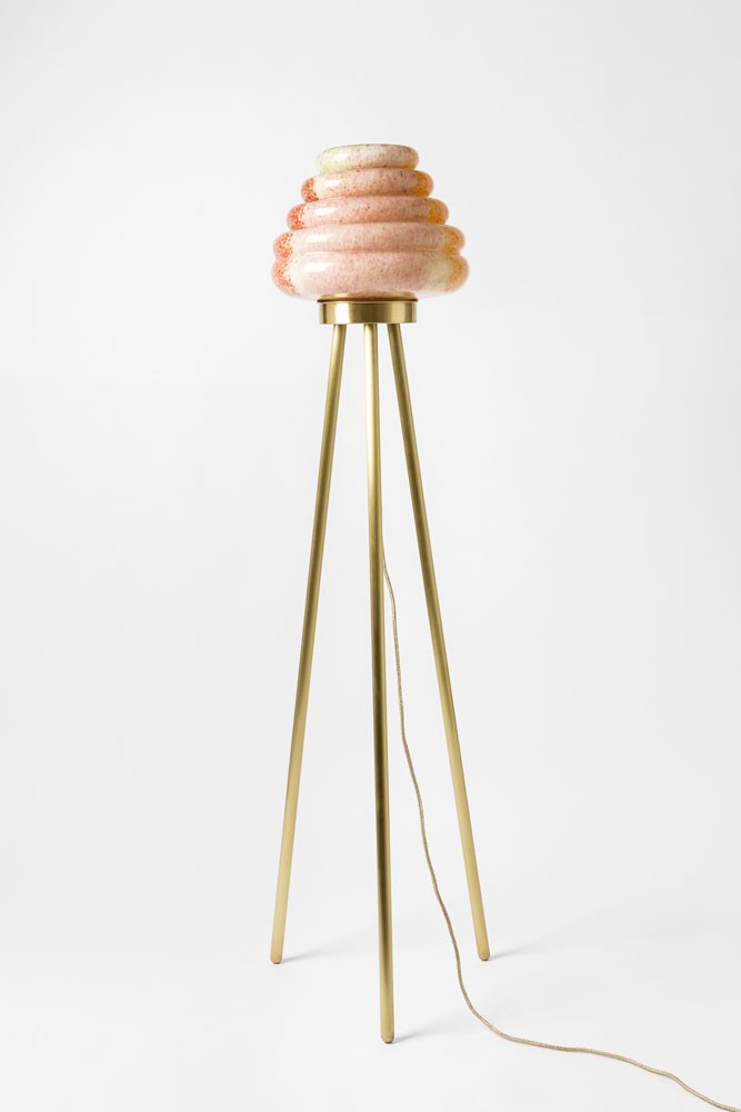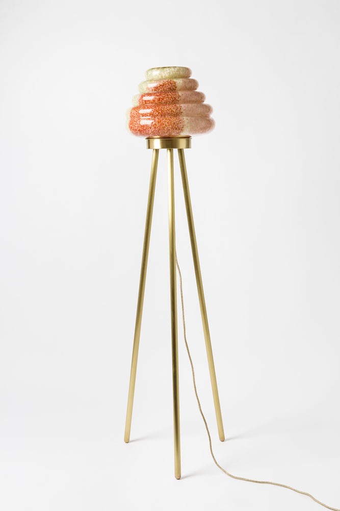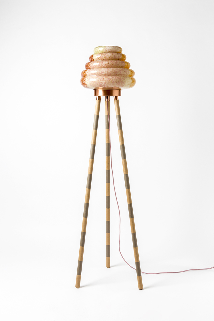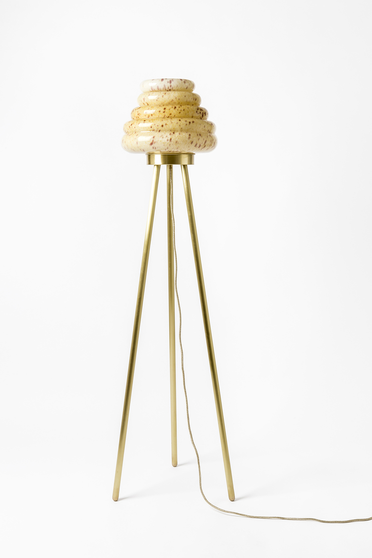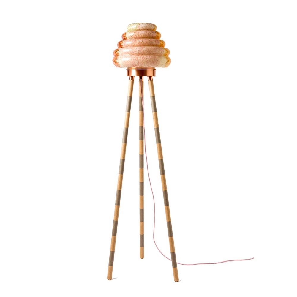这款蜂巢式落地灯包括混合彩色手工吹制玻璃灯罩以及木质贴面腿和铜的不同组合。 第二个版本的Colmena有点缀图案的玻璃罩和哑光黄铜腿。 灯可通过调光器调节。 每件作品都是独一无二的,并定制。