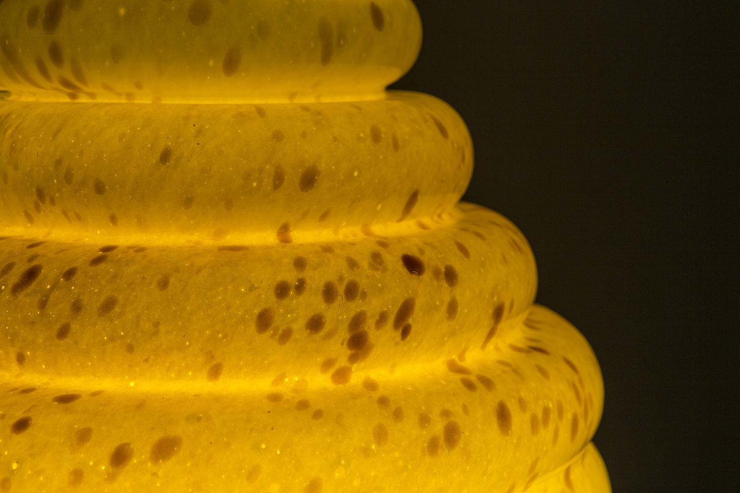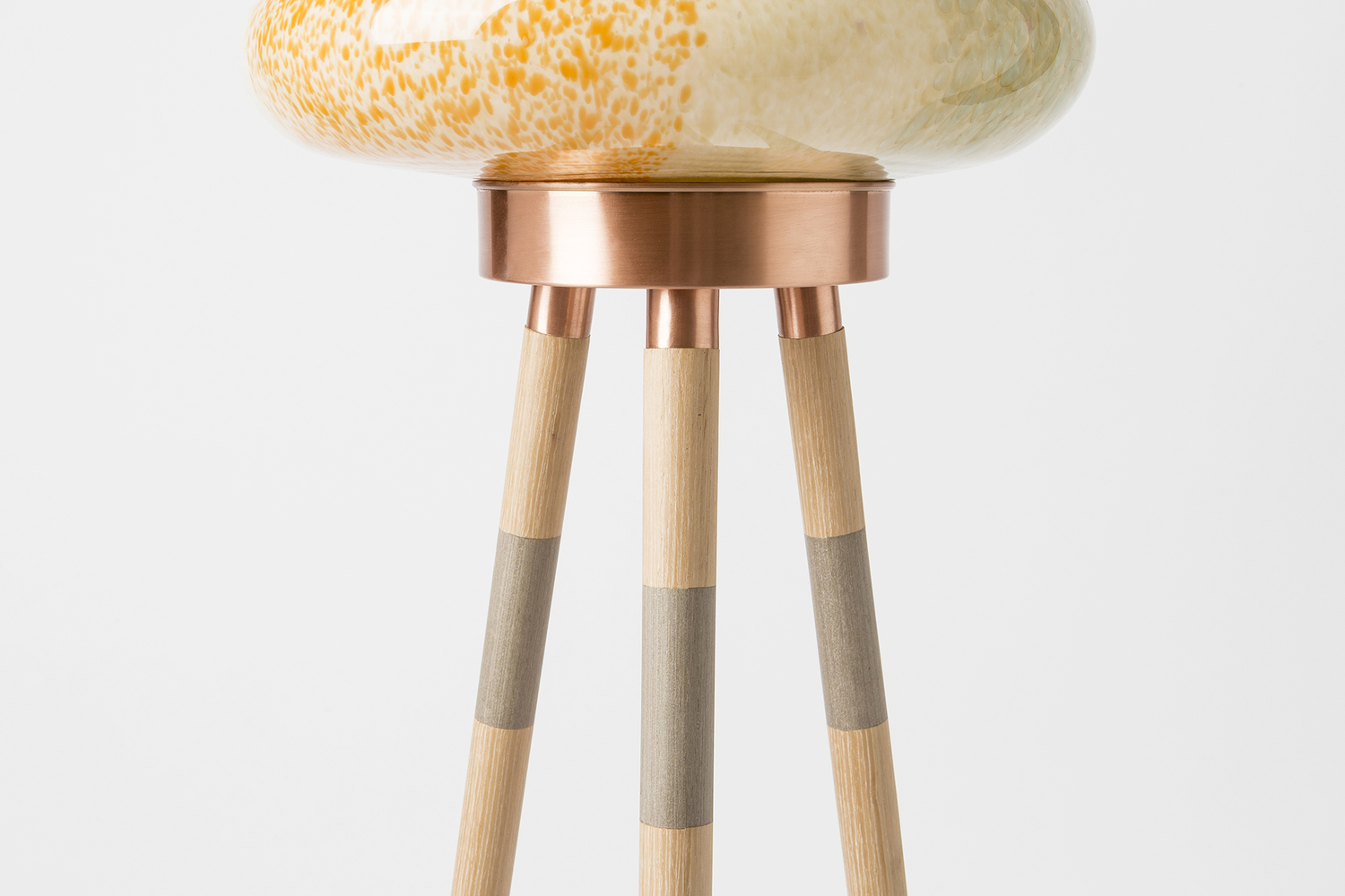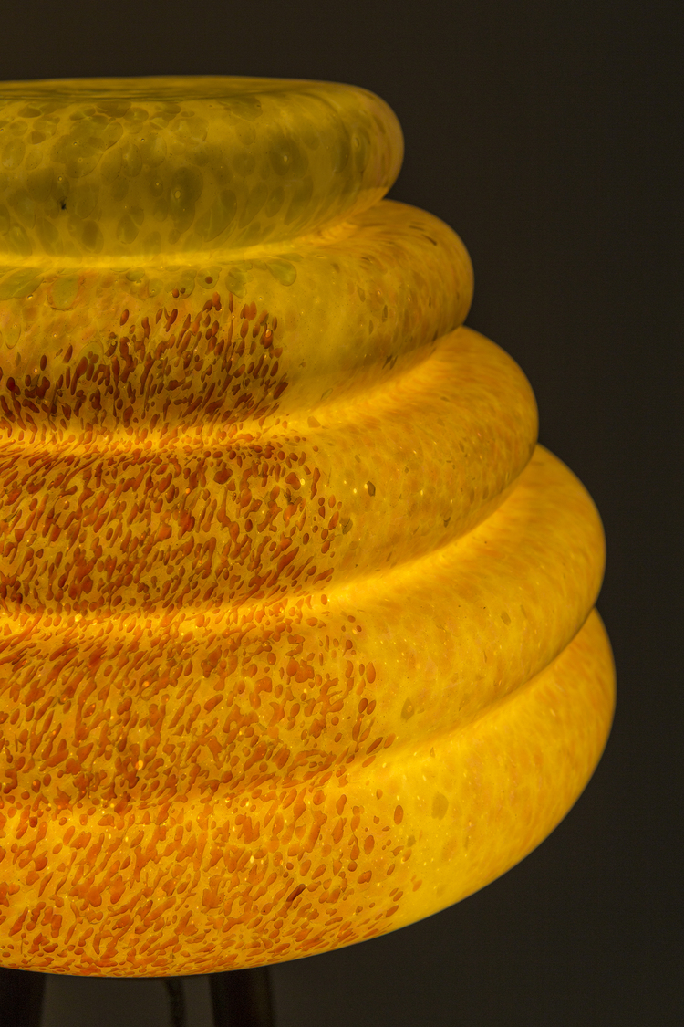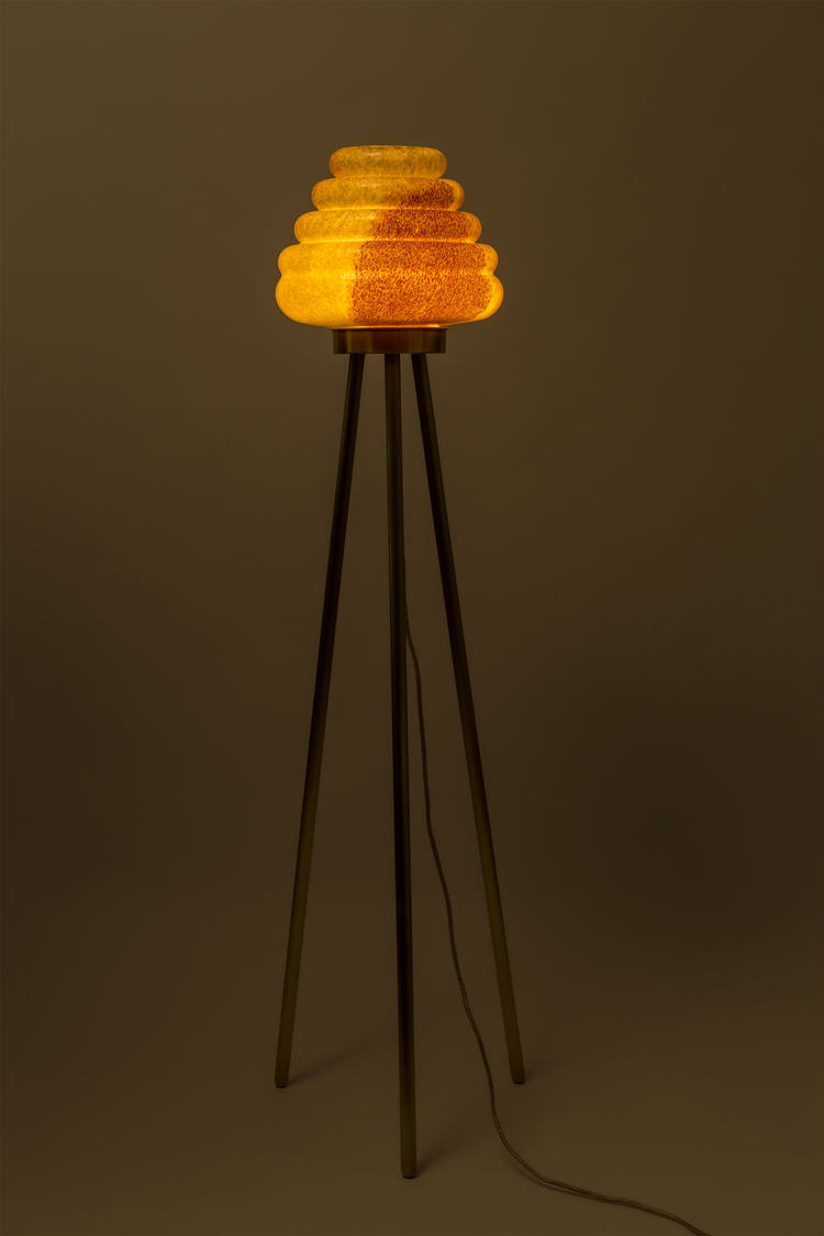 这款蜂巢式落地灯包括混合彩色手工吹制玻璃灯罩以及木质贴面腿和铜的不同组合。 第二个版本的Colmena有点缀图案的玻璃罩和哑光黄铜腿。 灯可通过调光器调节。 每件作品都是独一无二的,并定制。