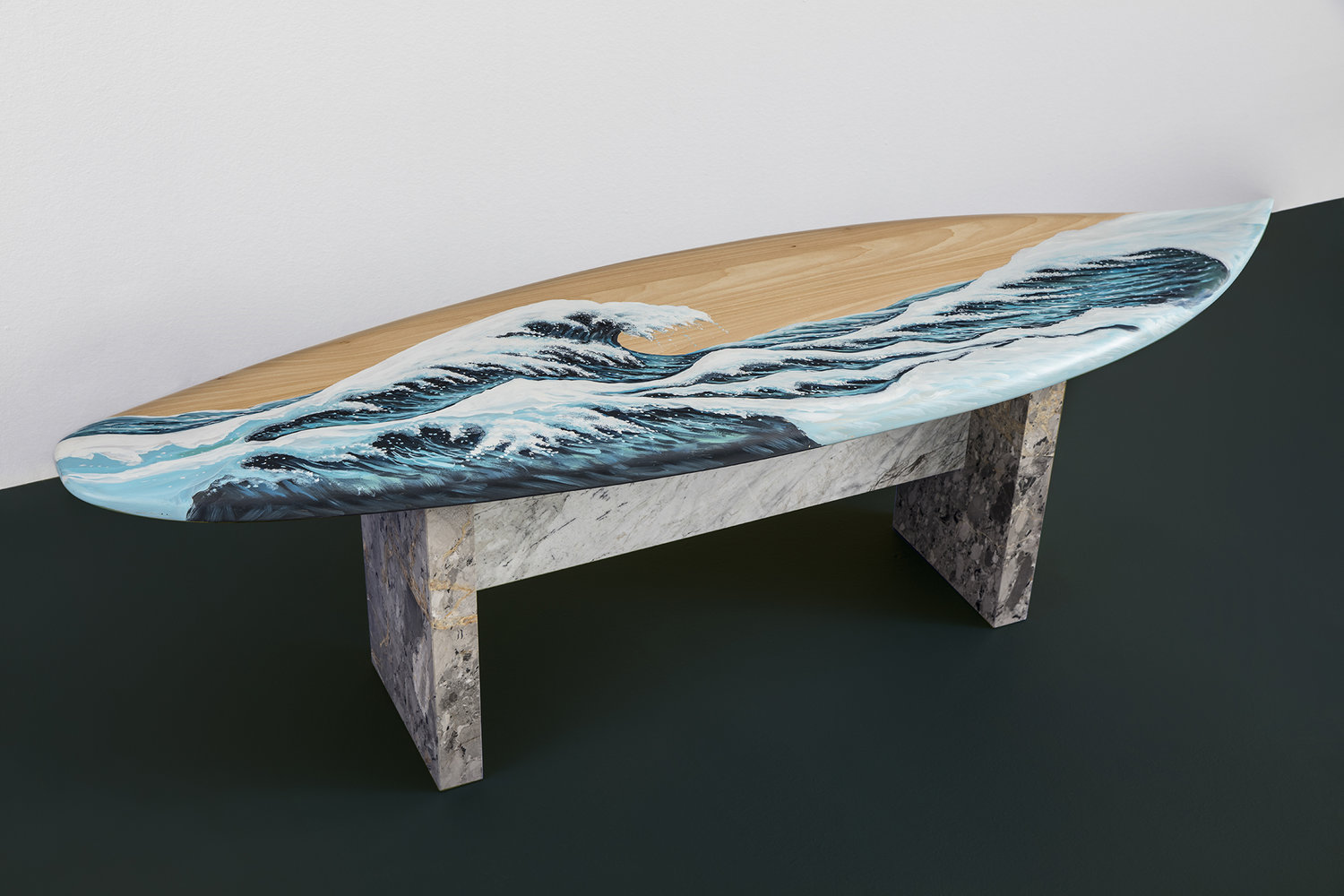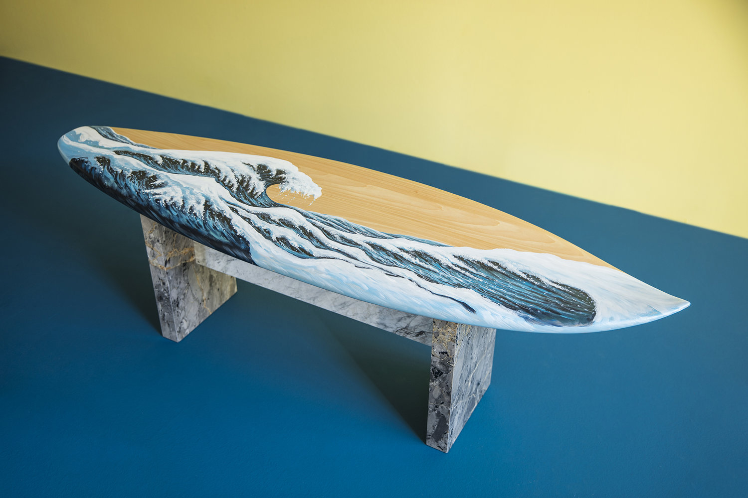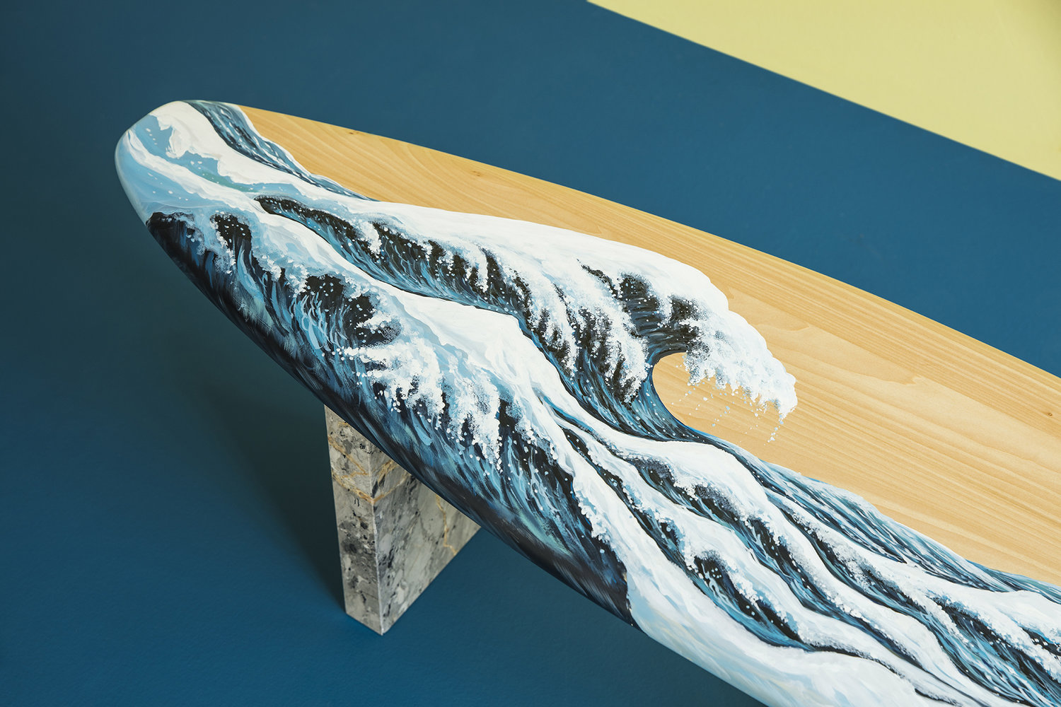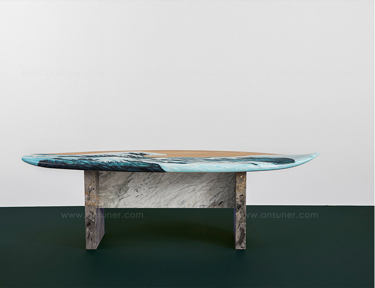 这条长凳的设计理念是:即使固定在固定的地方,也要不断移动。它结合了手工制作的石灰木和对比鲜明的大理石腿。座位是手绘的,让人想起神奈川的巨浪。
