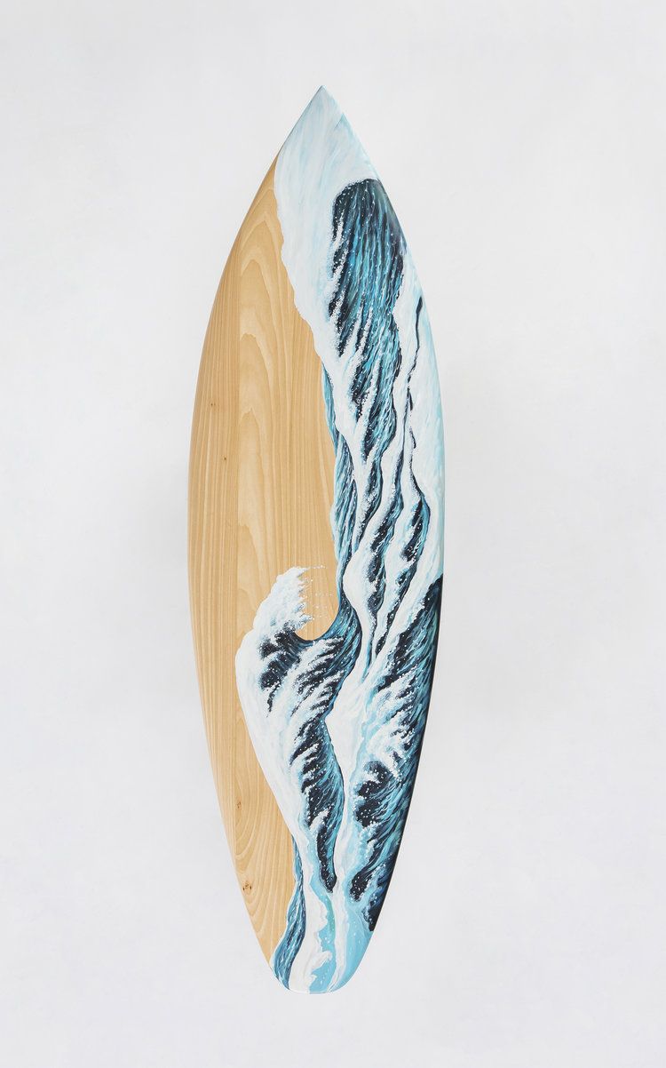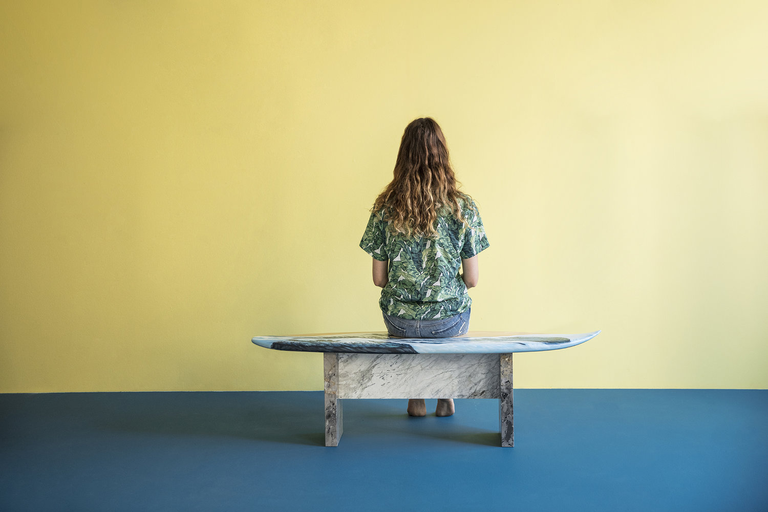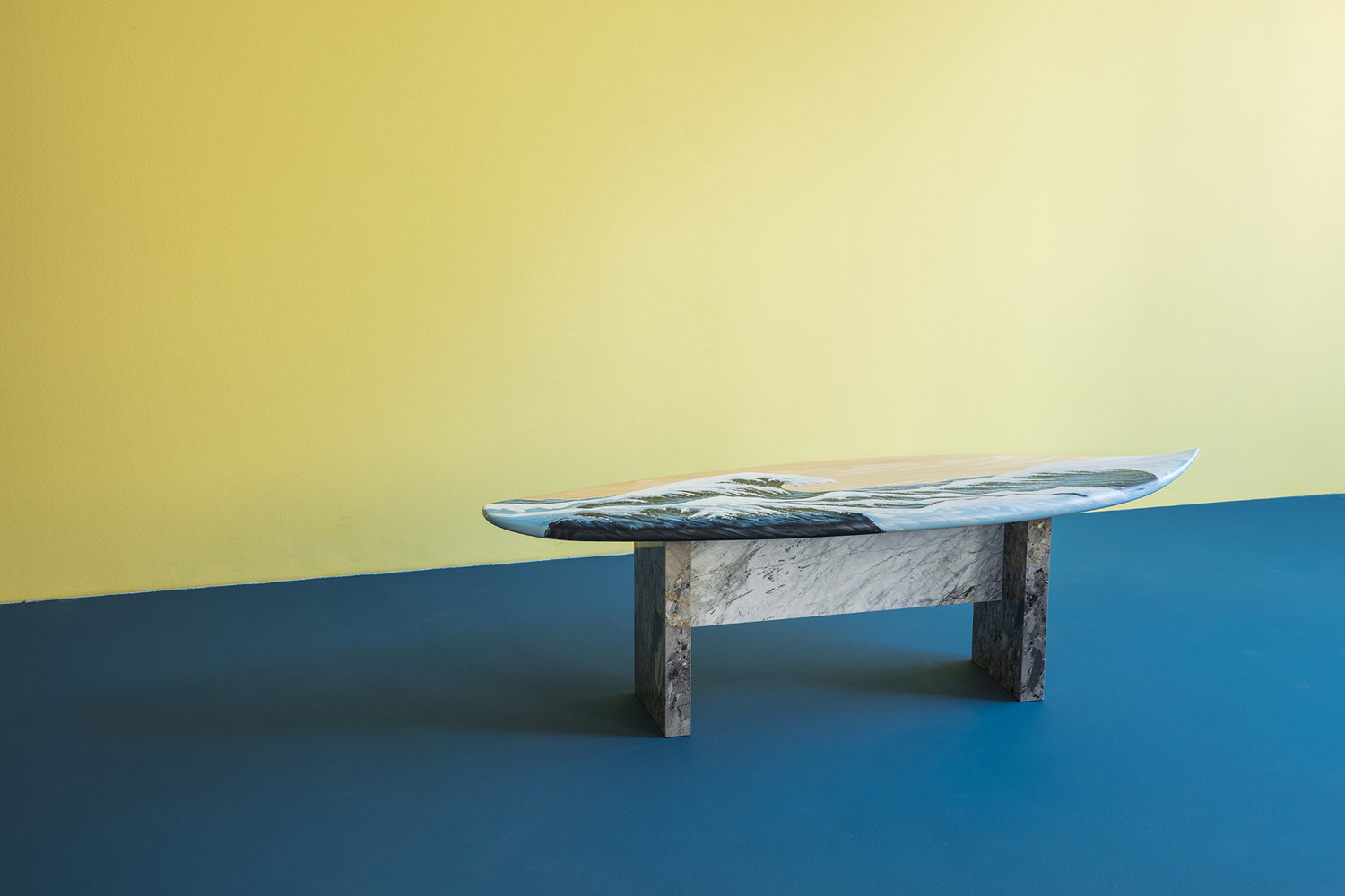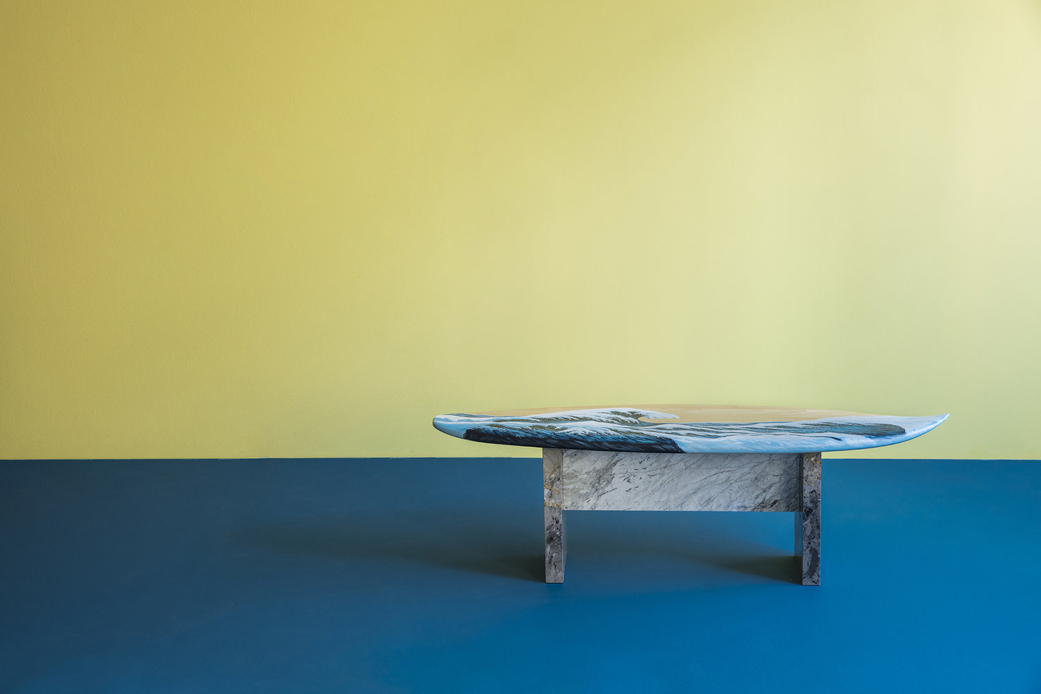 这条长凳的设计理念是:即使固定在固定的地方,也要不断移动。它结合了手工制作的石灰木和对比鲜明的大理石腿。座位是手绘的,让人想起神奈川的巨浪。