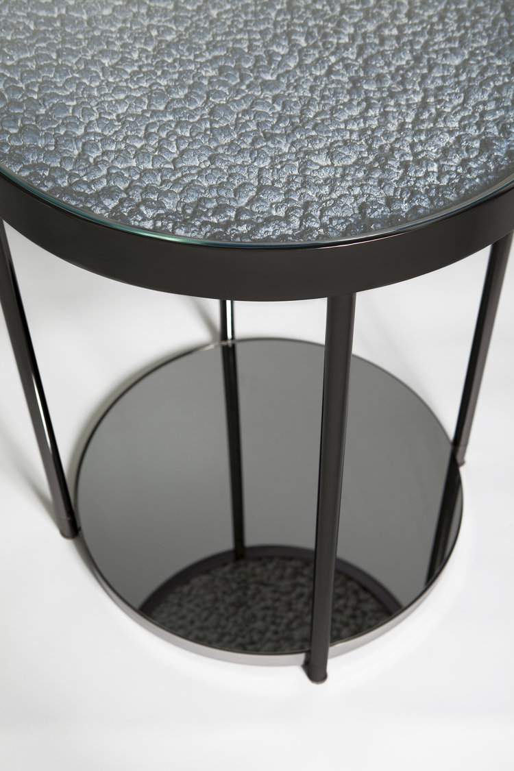 这款Hemlock设计的第二个版本具有更加男性化的感觉,抛光的黑色镍面和深色的镜面玻璃底。 月球状聚氨酯顶部采用靛蓝色调手工喷涂,以突出深度变化。原始白色顶部的照片固定在桌面的下侧,并在底座的镜子中反射。 这造成了同时看到白天和黑夜的错觉。