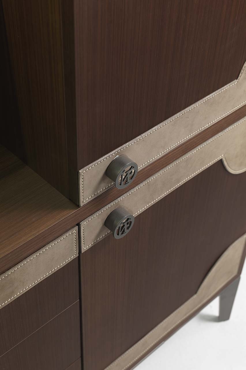 客厅集合项目的特点是精致的牛皮插入,几乎嵌在乌木