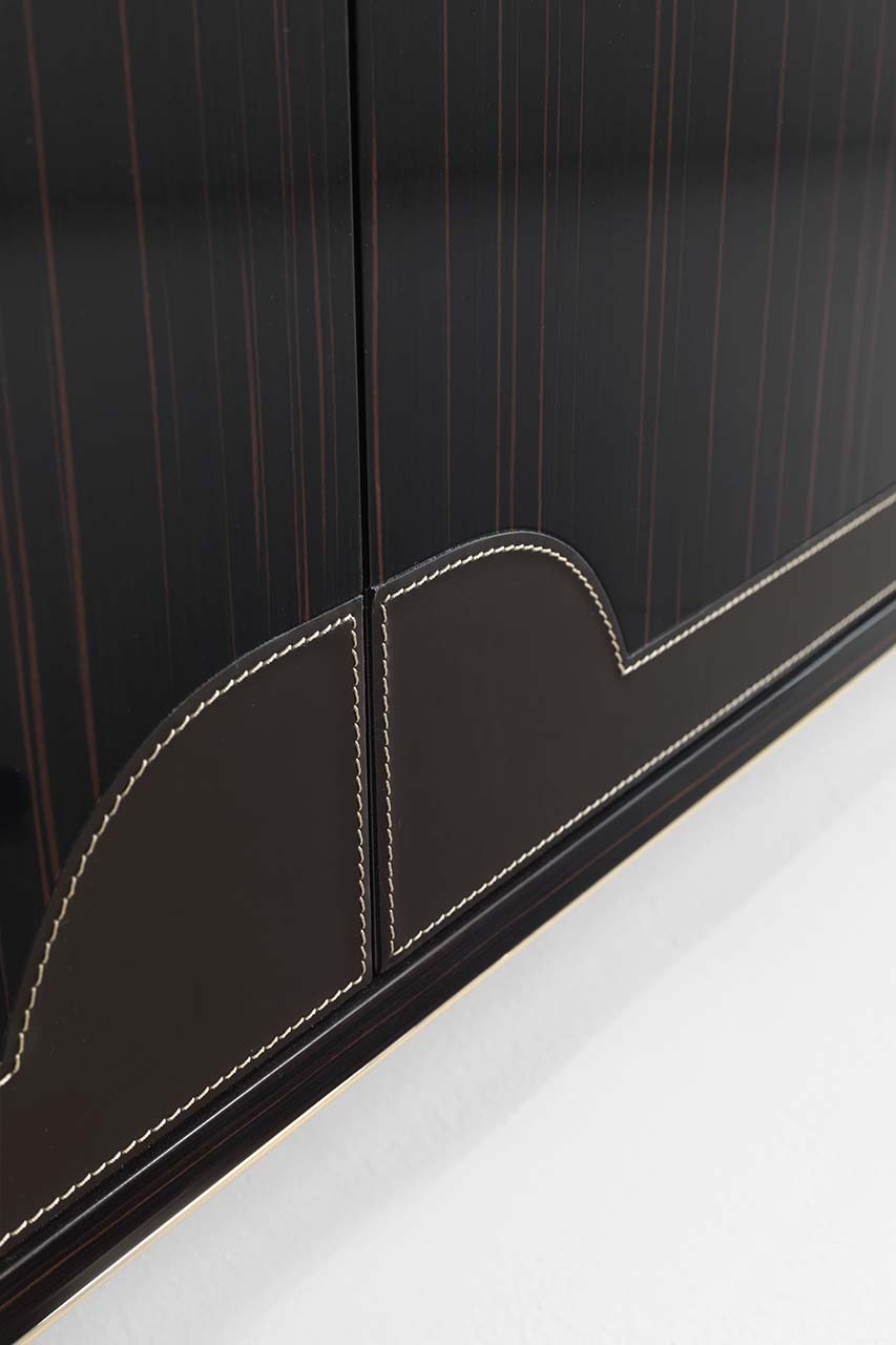 客厅集合项目的特点是精致的牛皮插入,几乎嵌在乌木