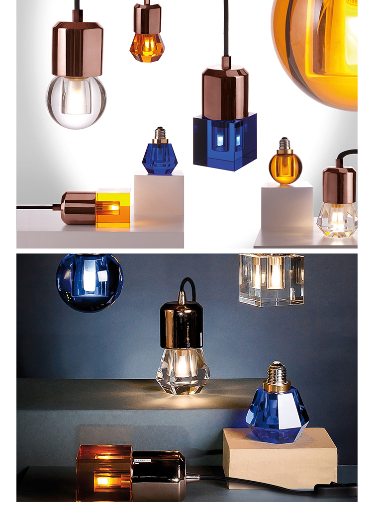 一个新的灯泡概念,在水晶,技术和复杂的透明度之间的对话,经过刻面手工处理.灯泡被重新解读为闪闪发光的宝石,三款灯泡由三种不同水晶形状和三种颜色组成.