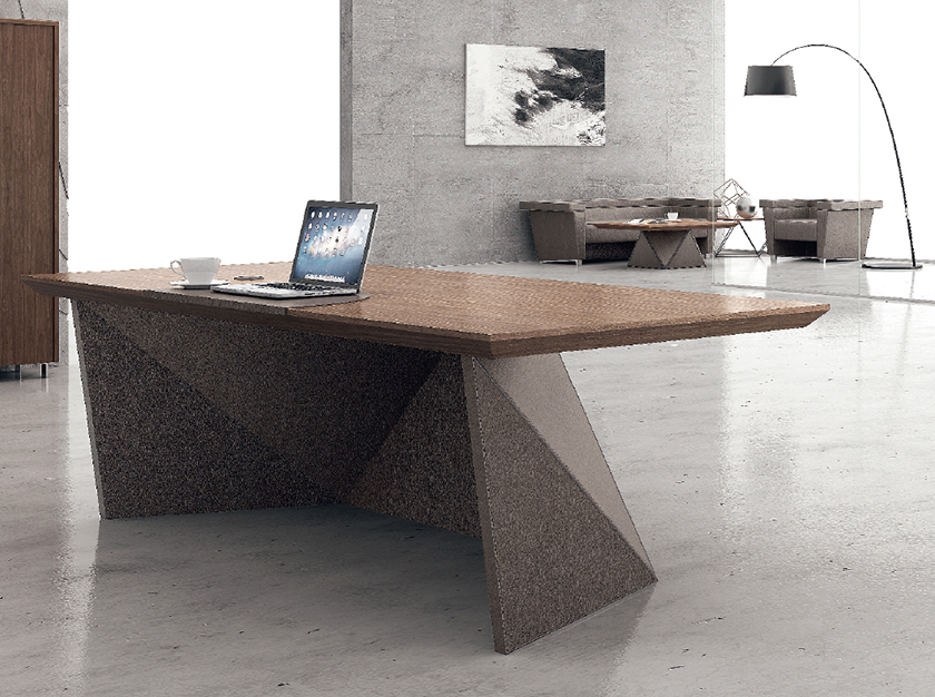 威睿系列,最大的亮点是独特的切割面。打破整体划一的家具造型模式,采用几何体构造设计手法,大尺度楔形宽体切面造型,如钻石的刻面与腰面错落有致,造出流畅的线条感。将现代建筑设计元素融入现代办公空间,结合整体布局配套延展,打造办公家具时尚前沿。主桌采用皮木覆膜工艺,机车缝合明线效果处理,浅胡桃皮木与皮椅搭配,整个空间充斥着个性化对比,金属材质简洁明快,流露出一种低调的奢华与睿智,配合银灰色的空间墙面,使得办公家具与整体的风格一脉相承。"