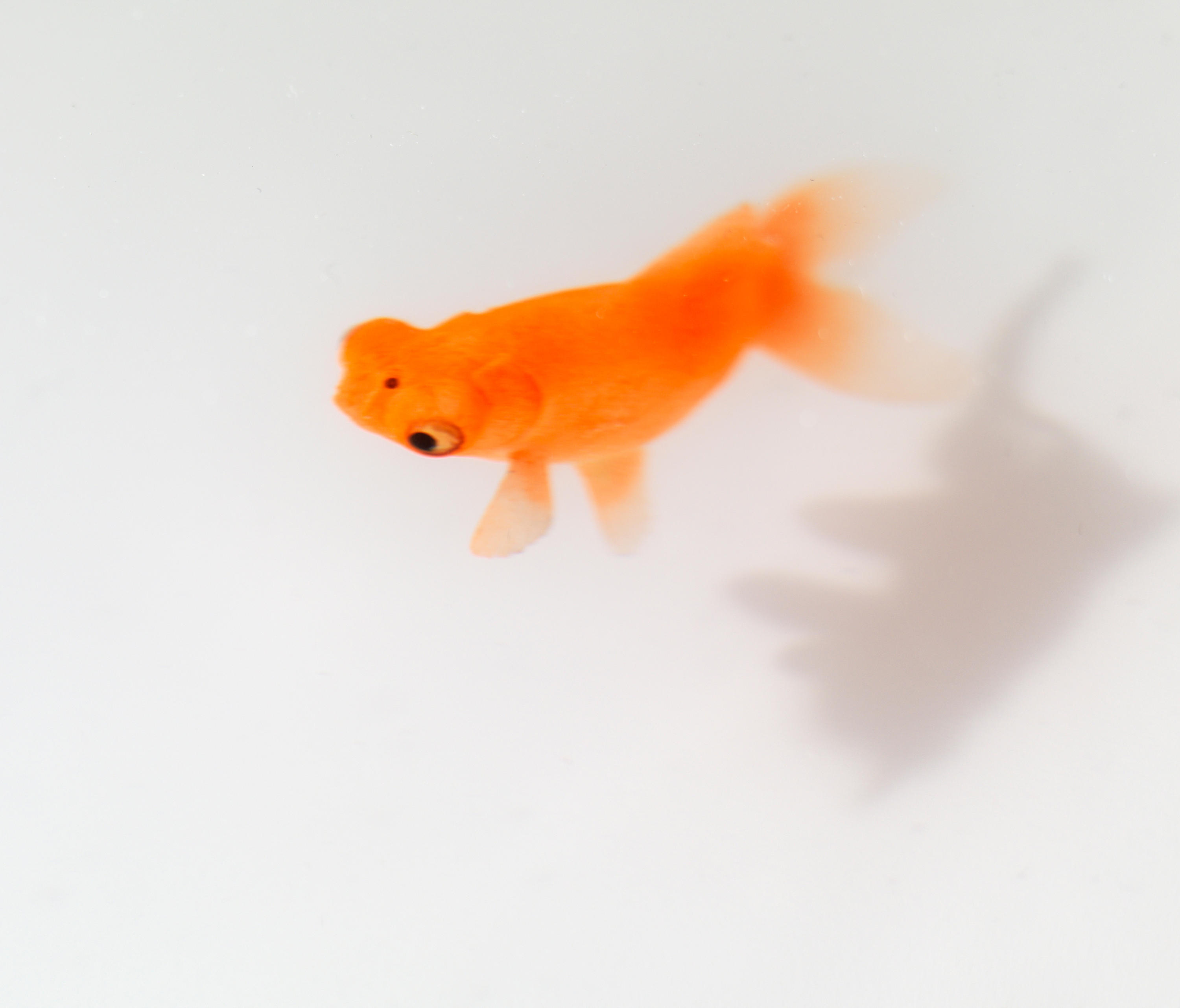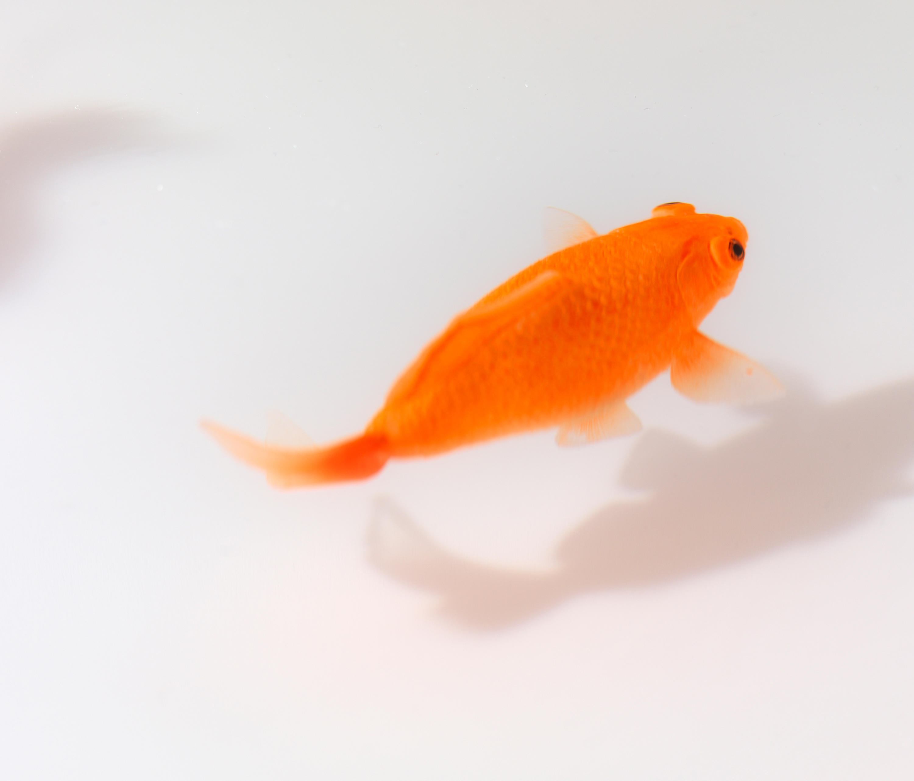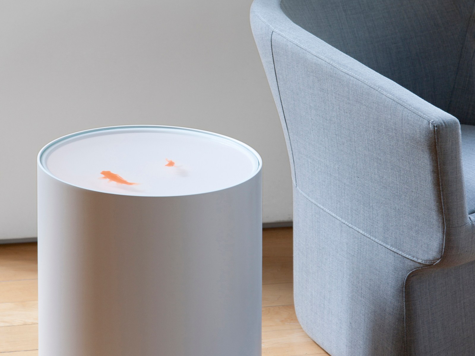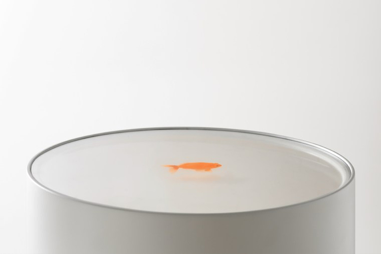 奇异空间的微妙选择,鱼漂浮在漆成的圆柱体中,除了自身外没有其他装饰。