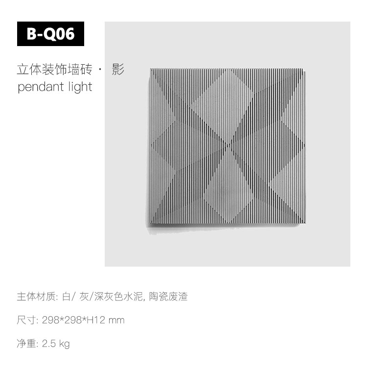 墙砖采用混凝土材料与陶瓷边角料混合灌注,一体脱模而成; 以50%的废弃瓷砖搅碎,充当骨料混合到混凝土材料中; 获红点奖评语: “影”墙砖会因应人视线角度变化,持续地为感官带来令人惊叹的新鲜感。它不断呈现出新的影像,强化作为装饰墙砖的视觉效果。 这些墙砖背后的创新设计理念,乃至成品的耐用性和性价比都令人印象深刻。此外,这产品更是可持续发展理念的一个完美实践。