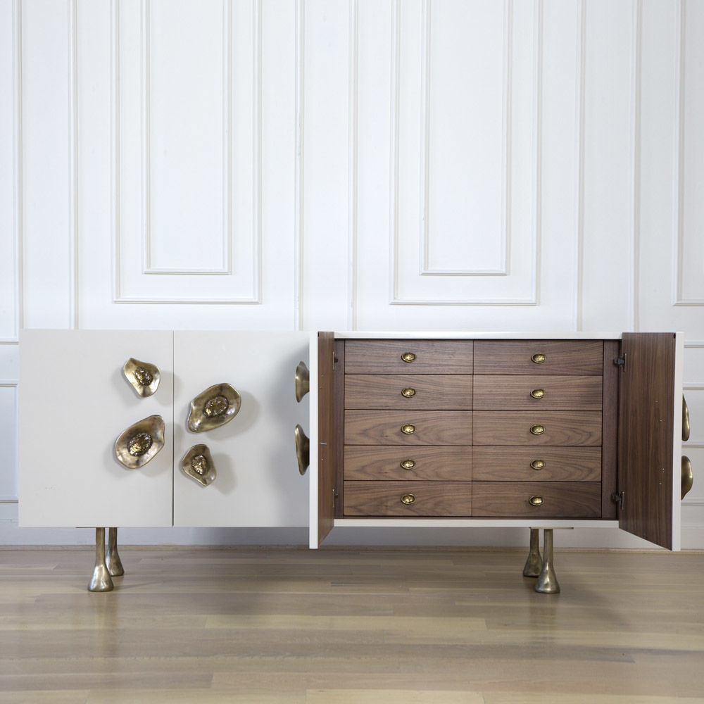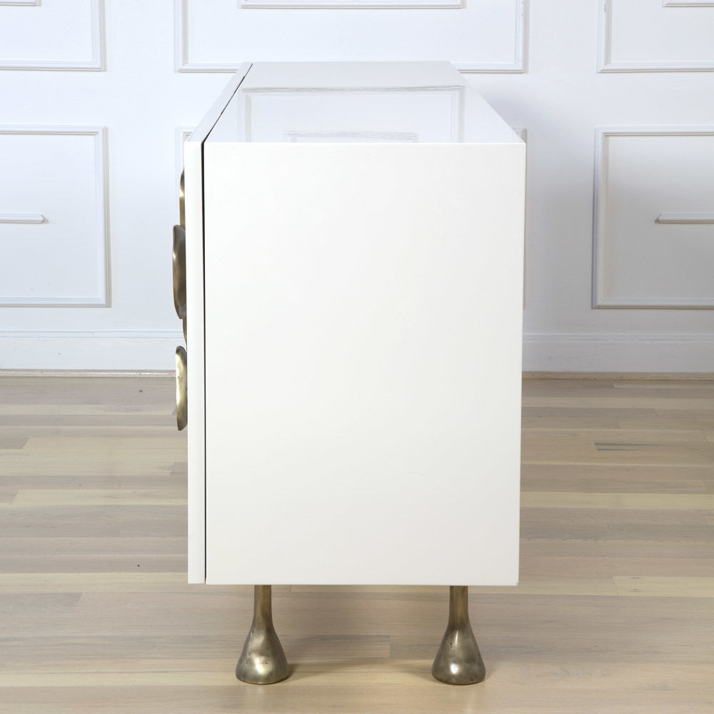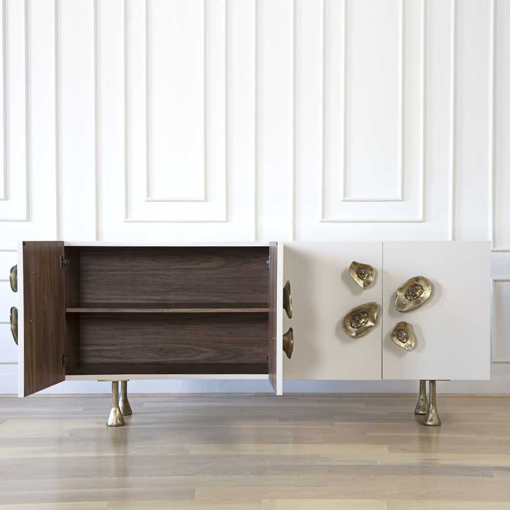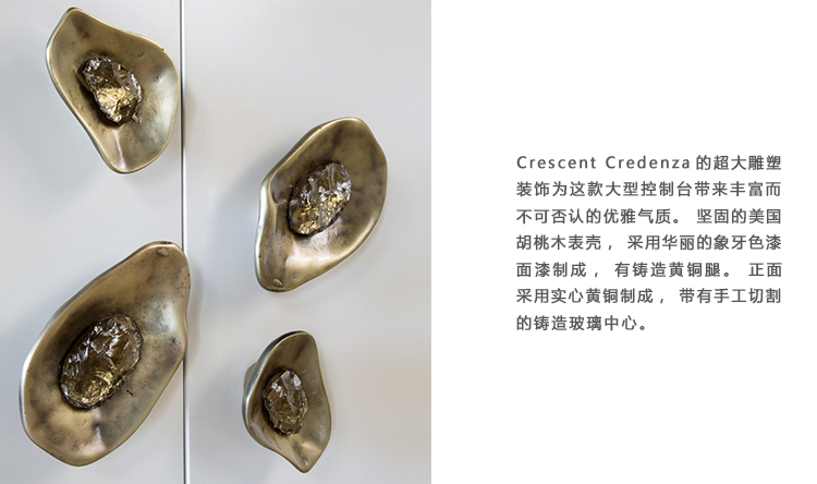 Crescent书橱的超大雕塑装饰为这款大型控制台带来丰富而不可否认的优雅气质。 坚固的美国胡桃木表壳,采用华丽的象牙色漆面漆制成,有铸造黄铜腿。 正面采用实心黄铜制成,带有手工切割的铸造玻璃中心。 内部设有四个浅抽屉,带有柔软的紧密硬件和手工雕刻的黄铜拉手,以及两个内部坚固的切割胡桃木架子。 天然胡桃木内饰,抛光黄铜抽屉拉,黄铜门拉和腿,碎玻璃。