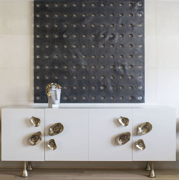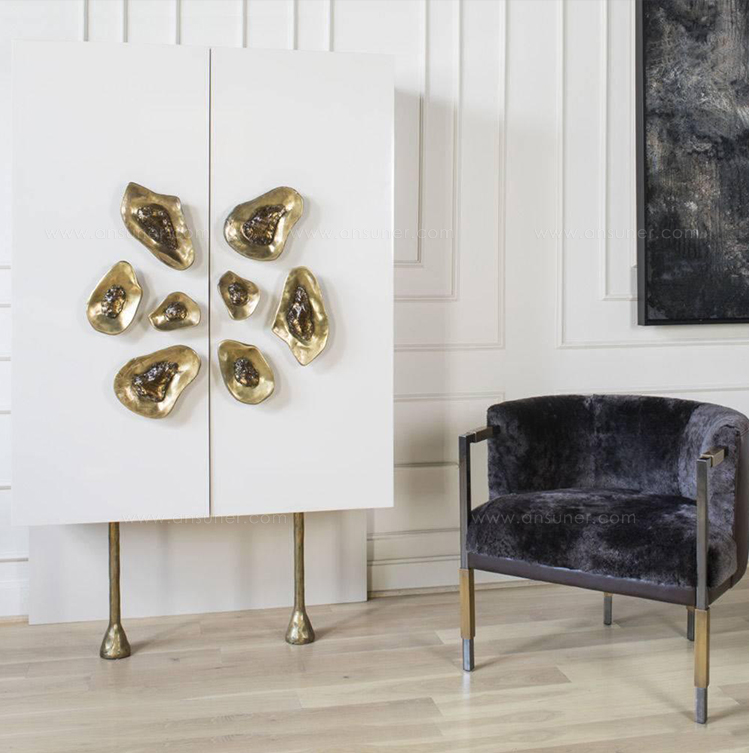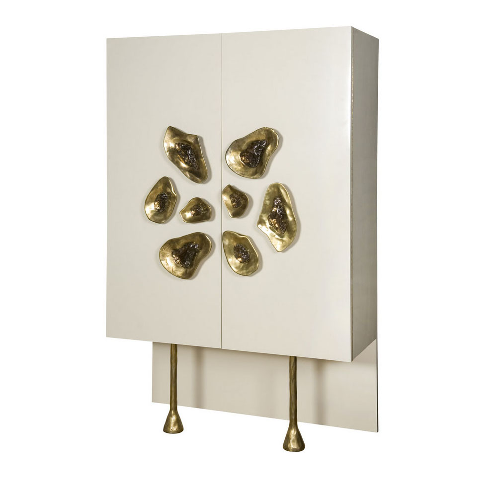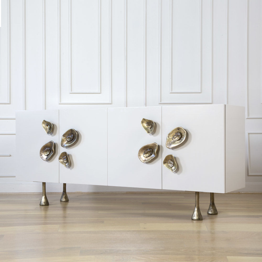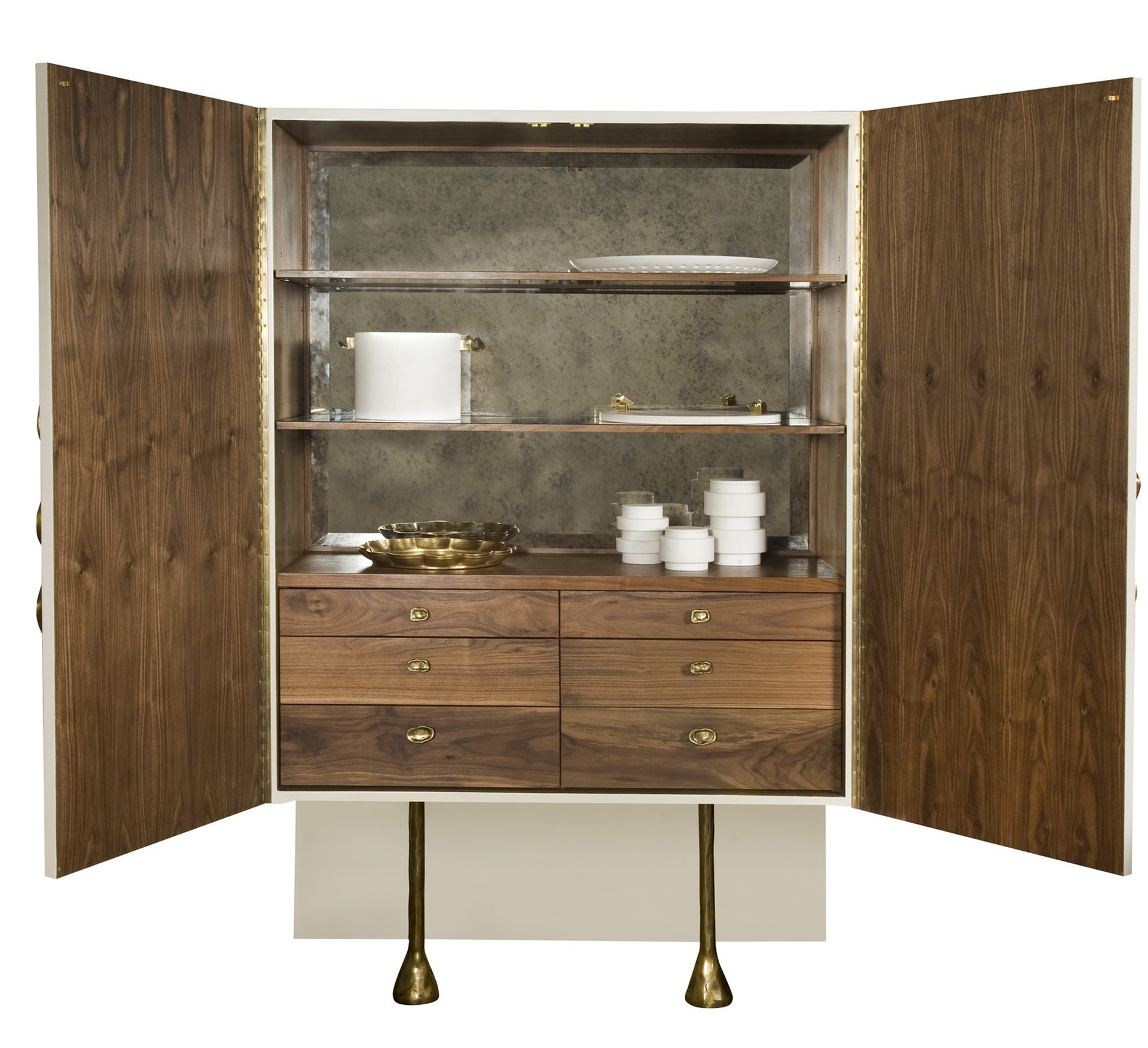 Crescent书橱的超大雕塑装饰为这款大型控制台带来丰富而不可否认的优雅气质。 坚固的美国胡桃木表壳,采用华丽的象牙色漆面漆制成,有铸造黄铜腿。 正面采用实心黄铜制成,带有手工切割的铸造玻璃中心。 内部设有四个浅抽屉,带有柔软的紧密硬件和手工雕刻的黄铜拉手,以及两个内部坚固的切割胡桃木架子。 天然胡桃木内饰,抛光黄铜抽屉拉,黄铜门拉和腿,碎玻璃。