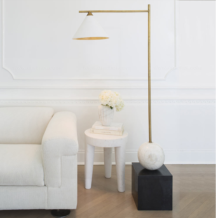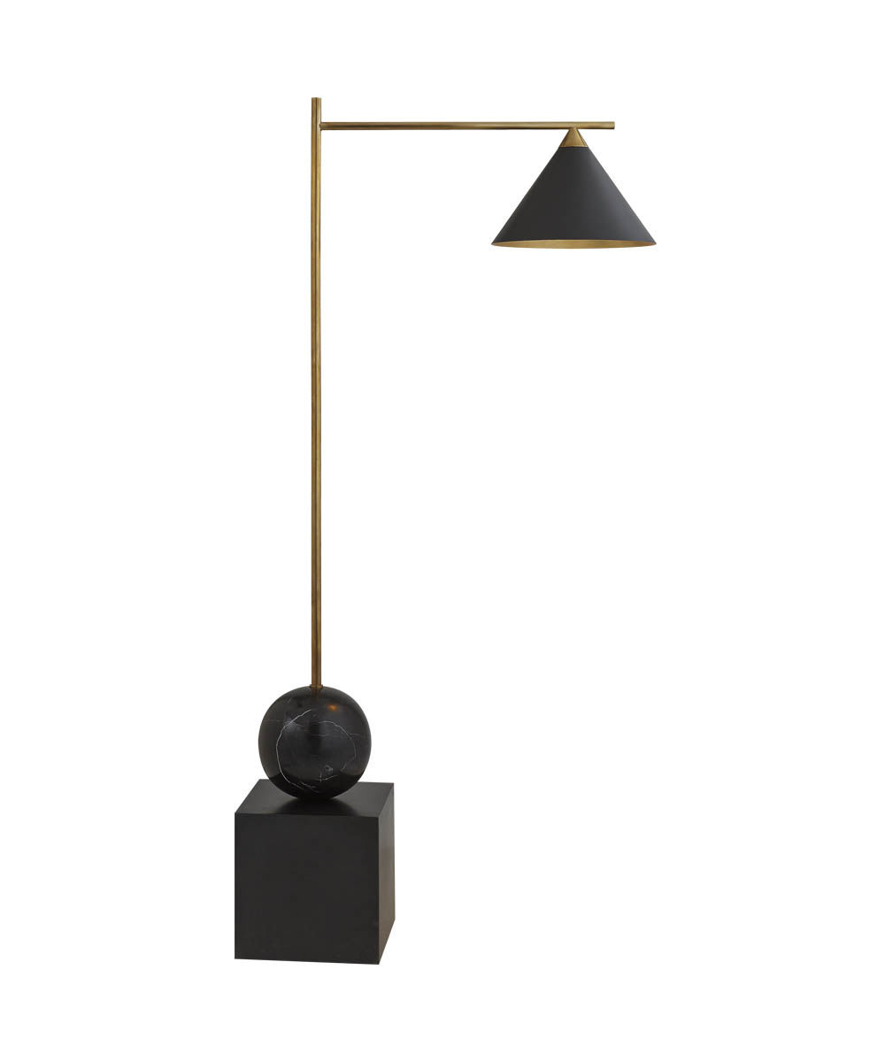 Cleo落地灯以大胆的几何形式突出了混合材料的美感。 这款落地灯采用古董抛光黄铜和青铜细节,镀金色罩内饰,可选择白色大理石底座的古董白色灯罩或黑色大理石底座黑色灯罩。