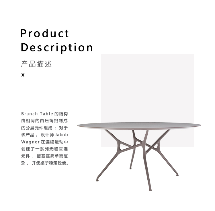 Branch Table的结构由相同的由压铸铝制成的分层元件组成:对于该产品,设计师Jakob Wagner在连续运动中创建了一系列无缝互连元件,使基座简单而复杂,并使桌子稳定轻便。