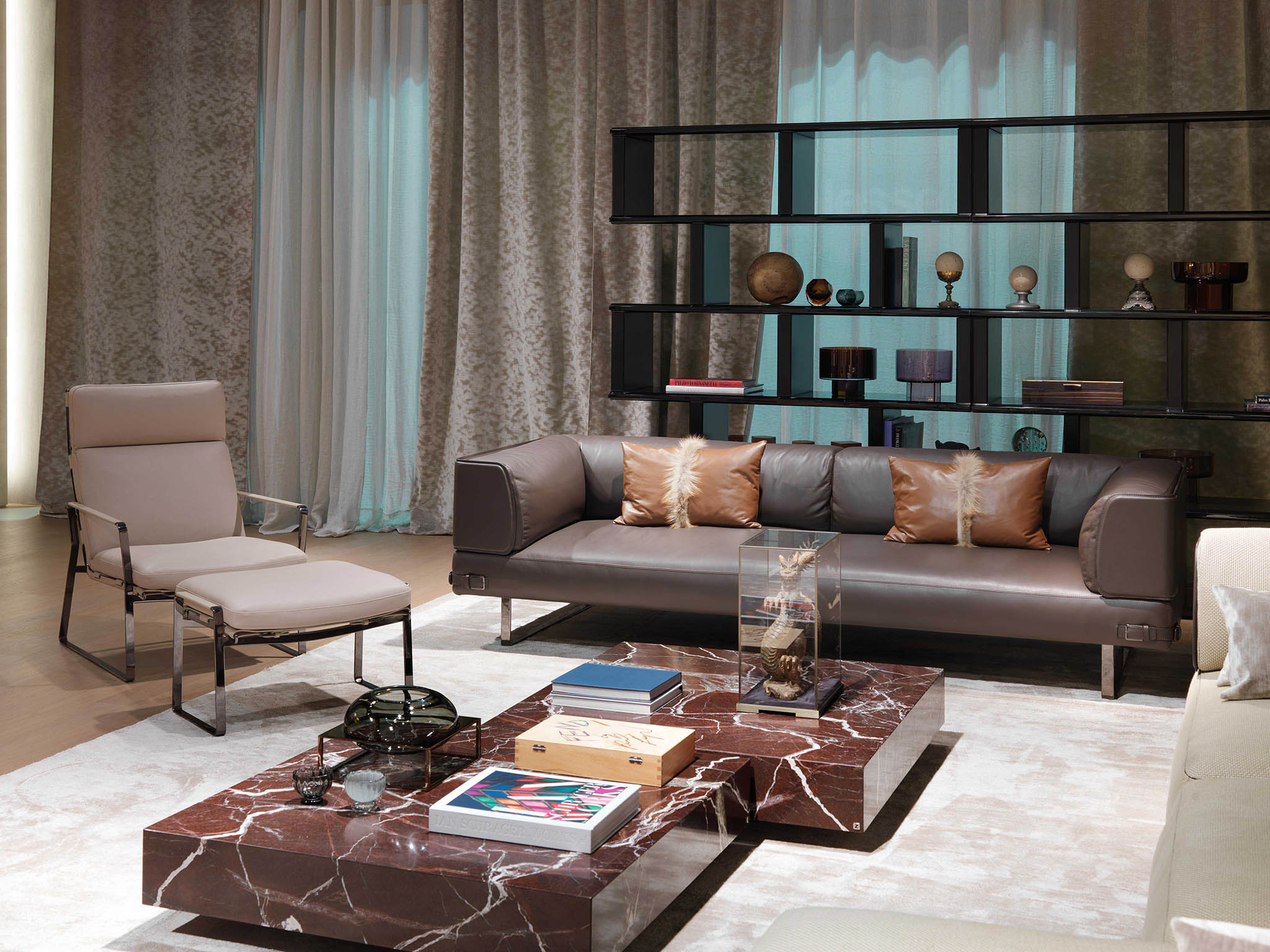 Soho Lite沙发是用钢的线性支撑元件重新塑造的。由于皮革装饰的中性色调,线性结构呈现出新的特点,而在技术面料版本中,精细材质的性能保证了柔软性和舒适性。buckles对芬迪的美学代码表示敬意,成为吸引人的细节和功能的连接器。