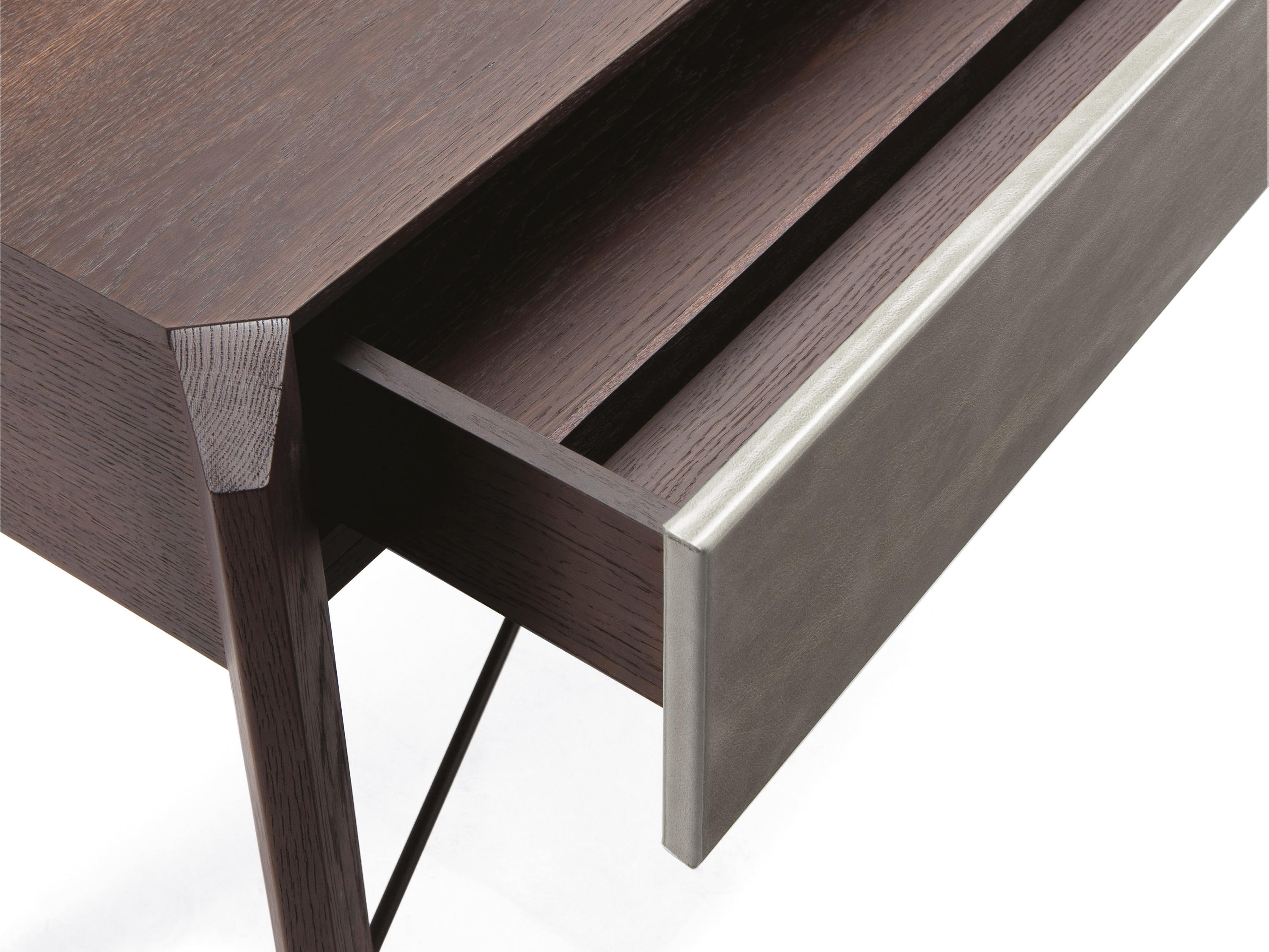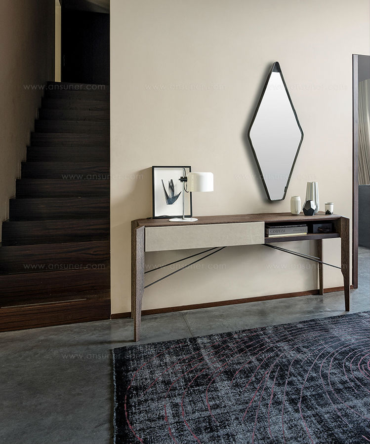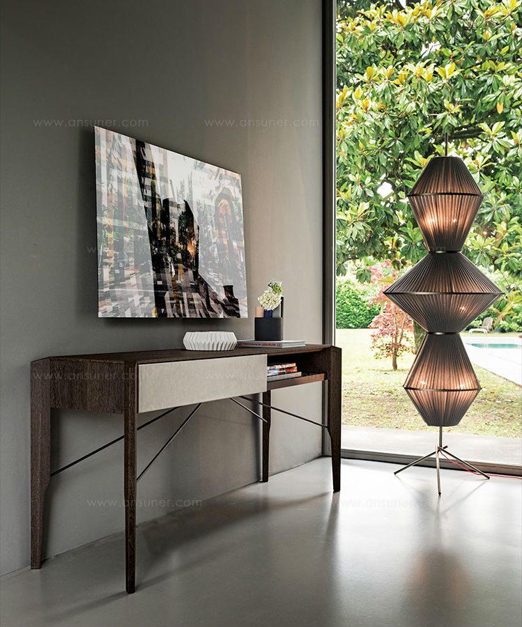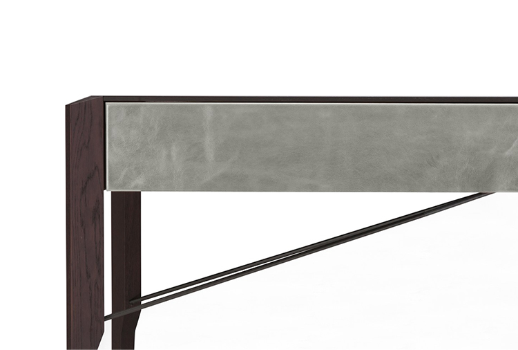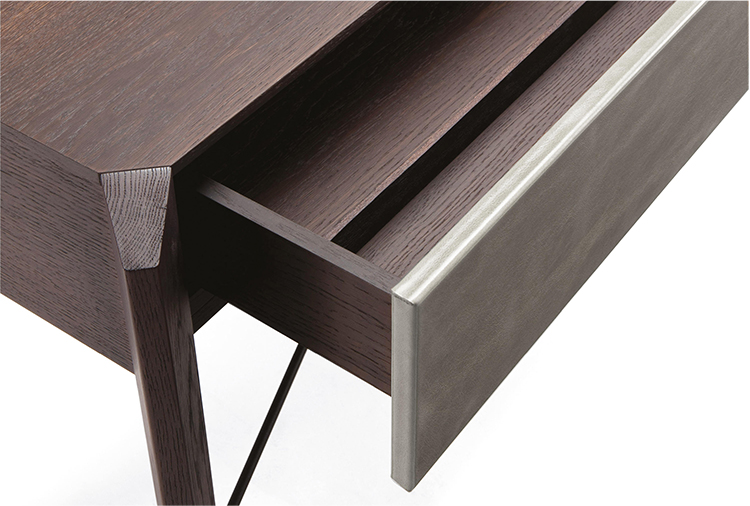 Manzoni & Tapinassi装饰柜的侧板可以在摩卡橡木、卡纳莱托胡桃木或苏皮亚木上选择制作,金属框架由云母褐色或镀锌钛制成。虽然它的结构看起来很薄,却起到了很好的支撑作用。