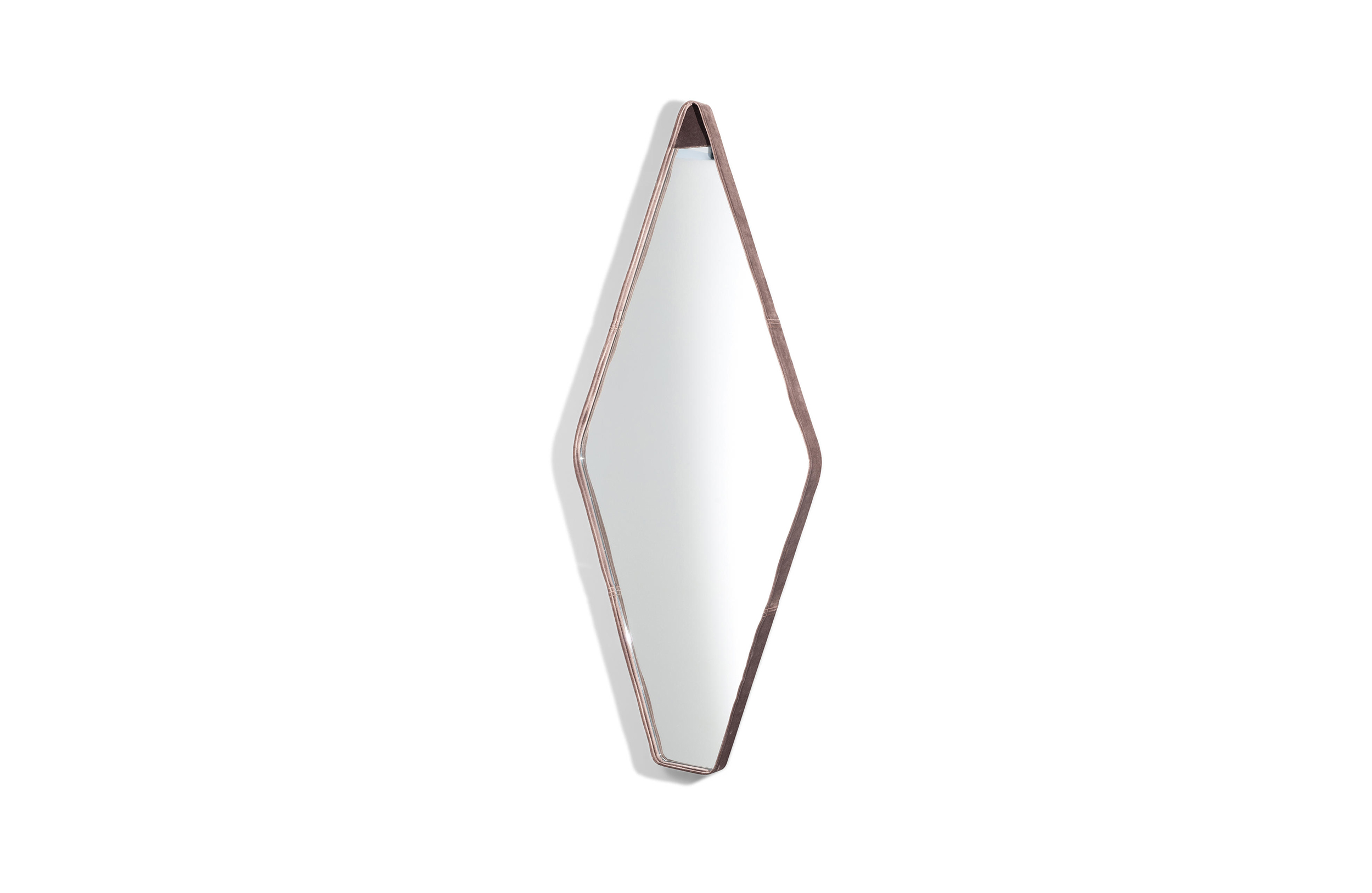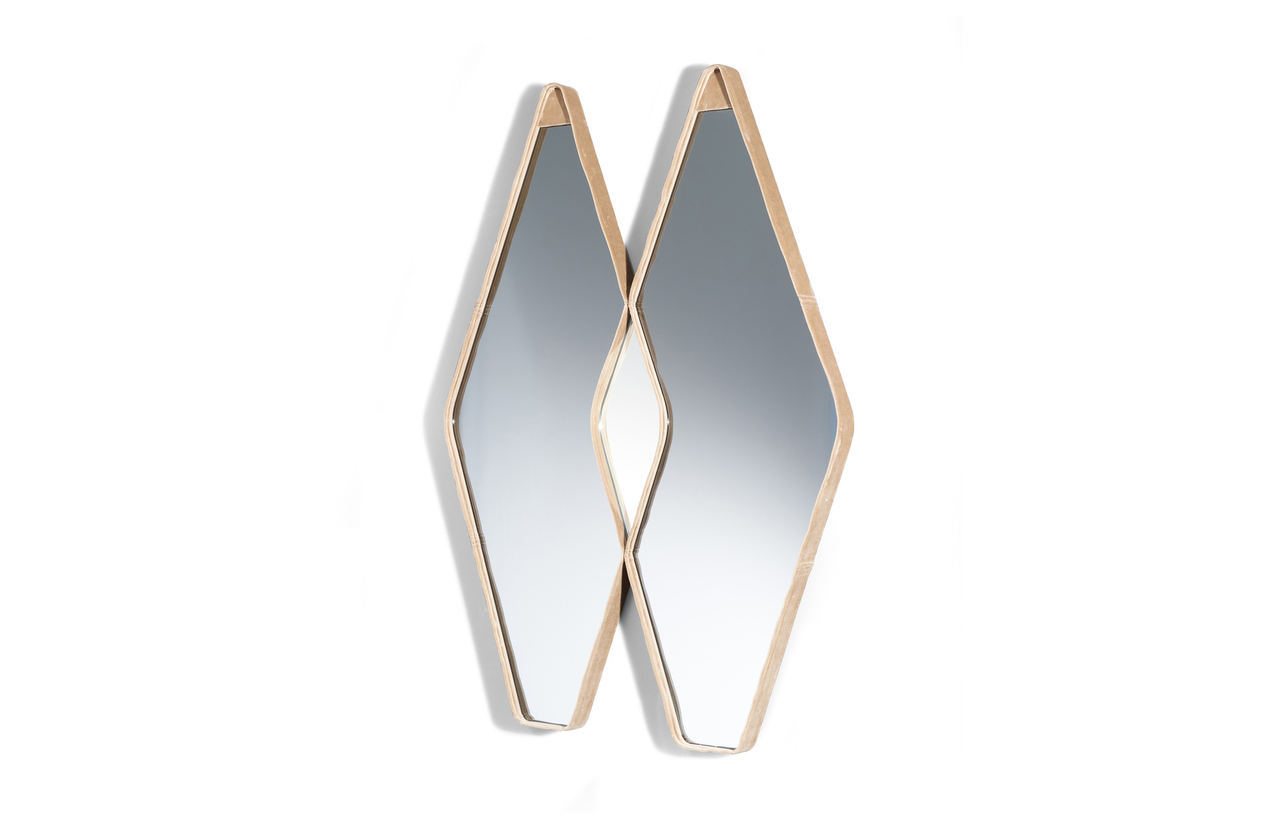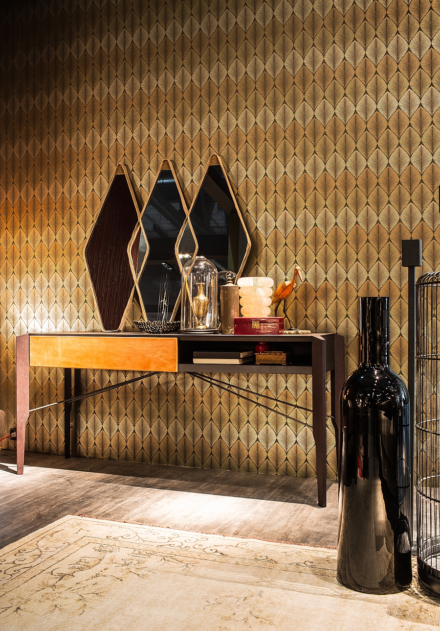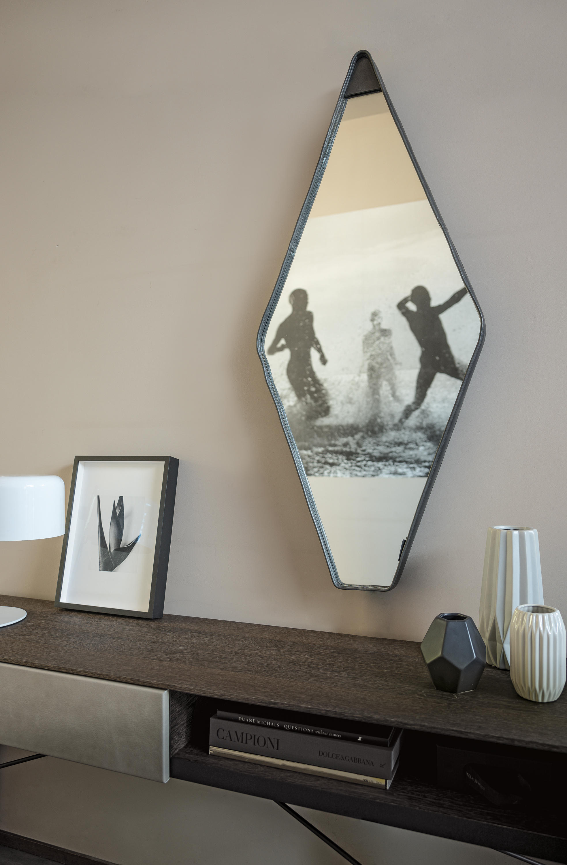 Gino Carollo设计的《名利场》(Vanity Fair)由镜子或烟熏玻璃制成。它以丝绒或皮革制成罩盖提供了一种严谨的精度和美感的效果,并与简单的菱形线形成对比。镜子可以是单、双、三、甚至是将模块并排放置在墙上。