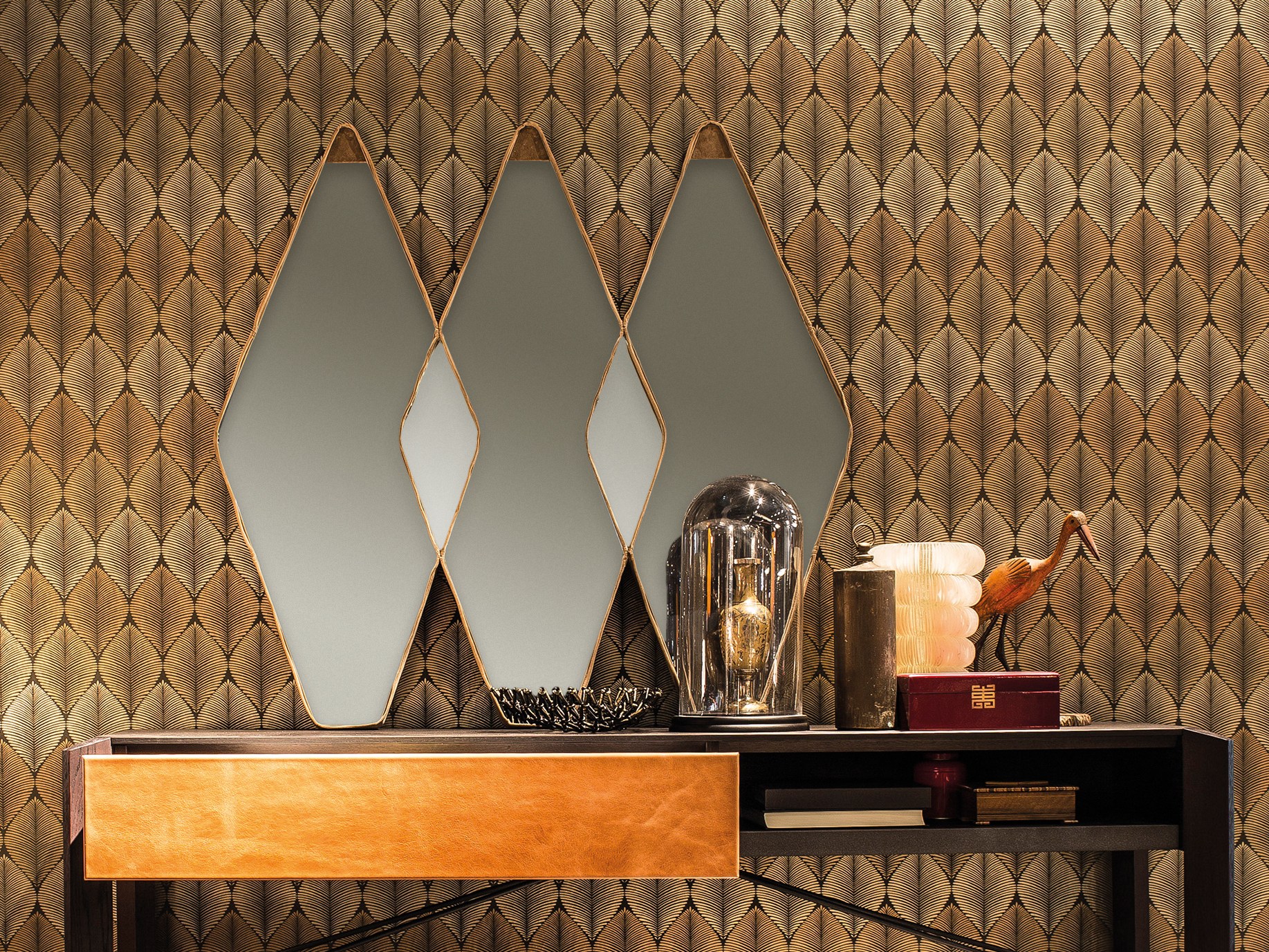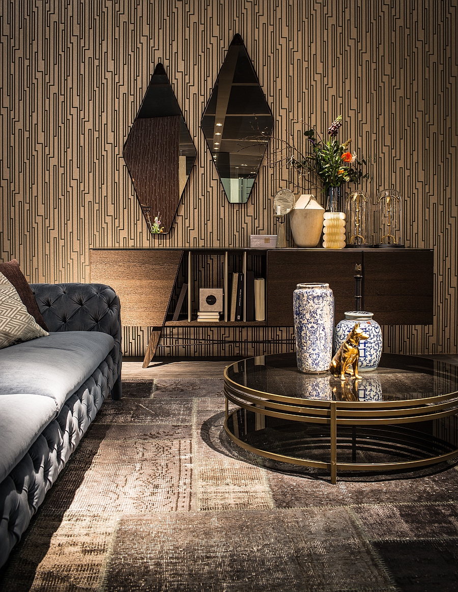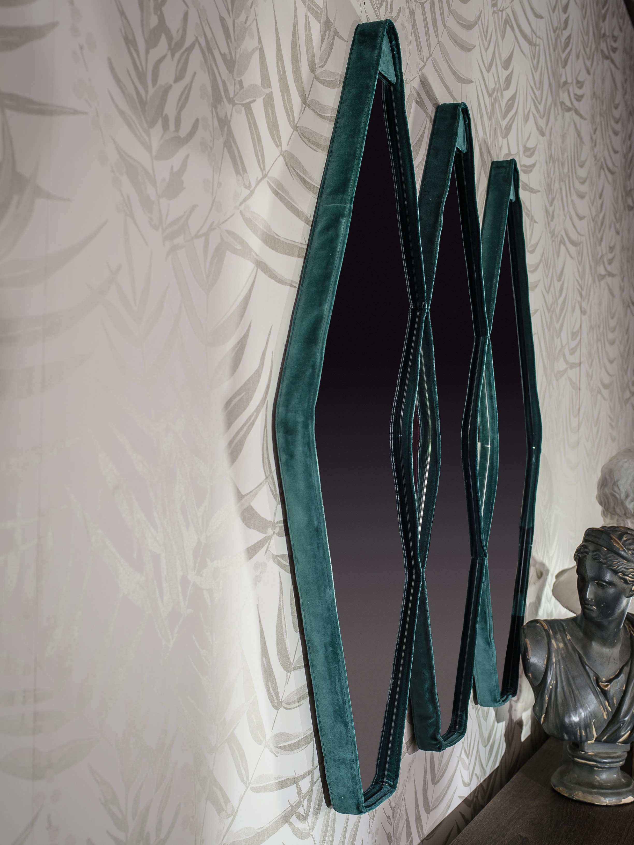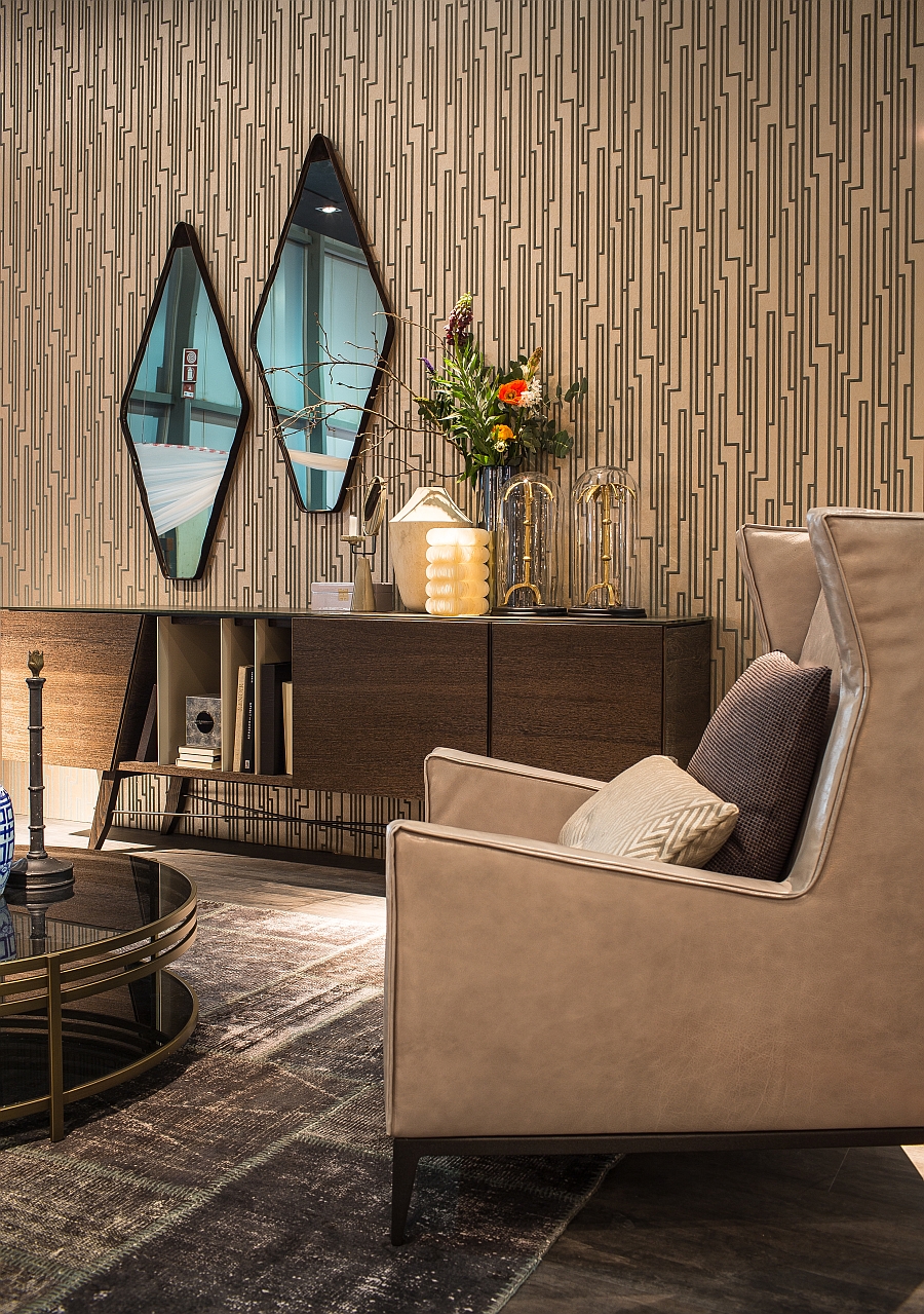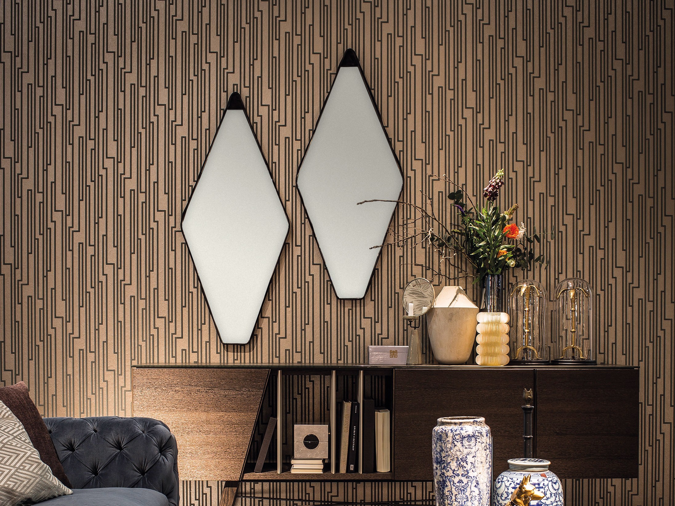 Gino Carollo设计的《名利场》(Vanity Fair)由镜子或烟熏玻璃制成。它以丝绒或皮革制成罩盖提供了一种严谨的精度和美感的效果,并与简单的菱形线形成对比。镜子可以是单、双、三、甚至是将模块并排放置在墙上。