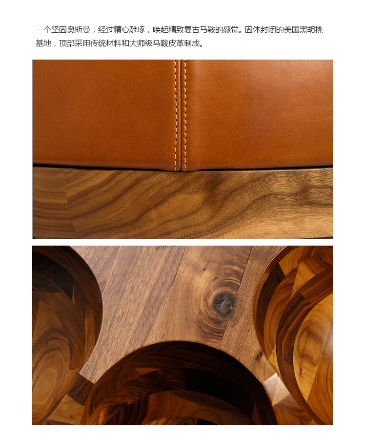 一个坚固的奥斯曼,经过精心雕琢,唤起精致复古马鞍的感觉。 固体封闭的美国黑胡桃木基地。 顶部采用传统材料和大师级马鞍皮革制成。