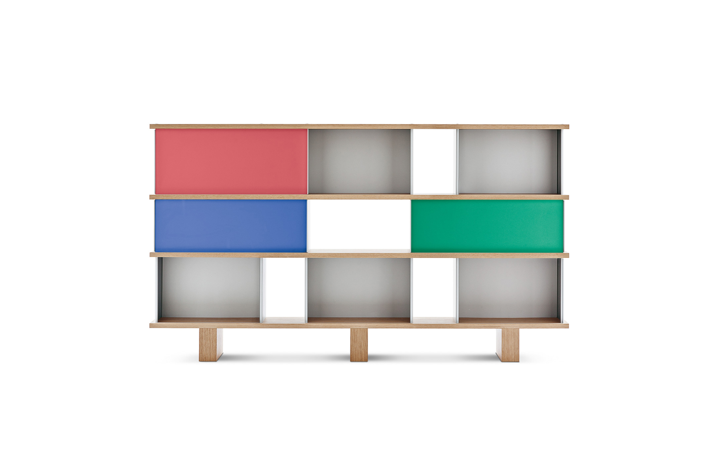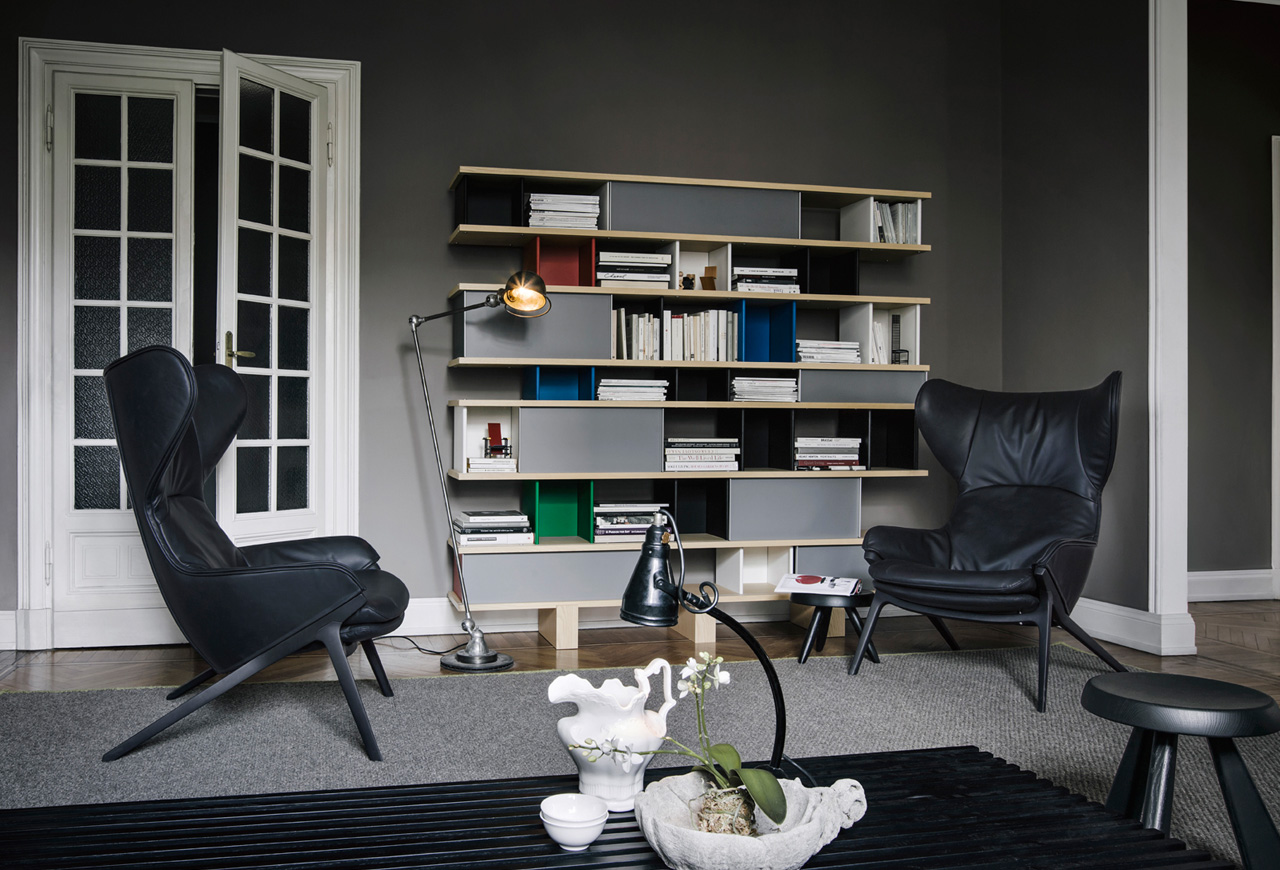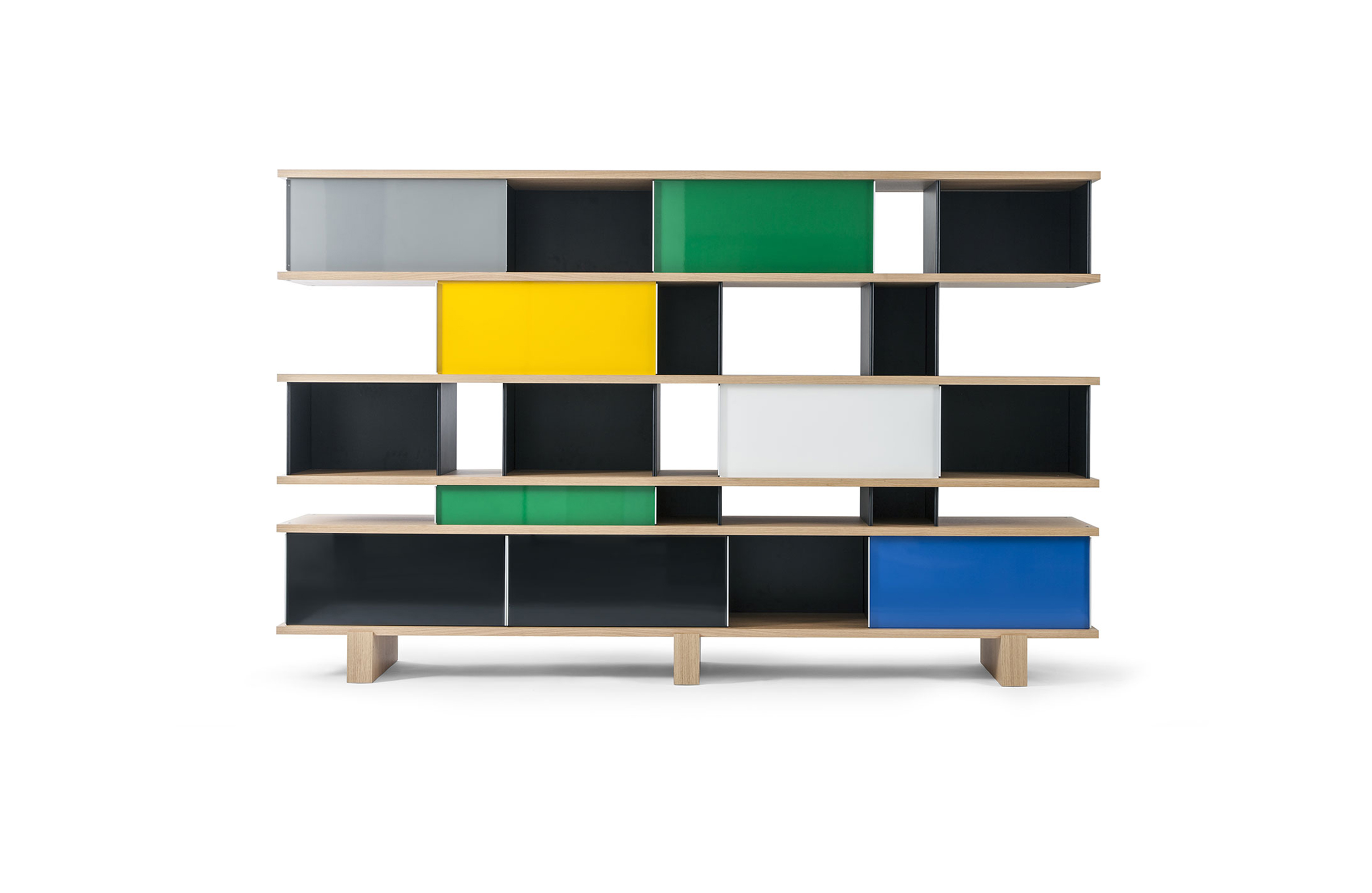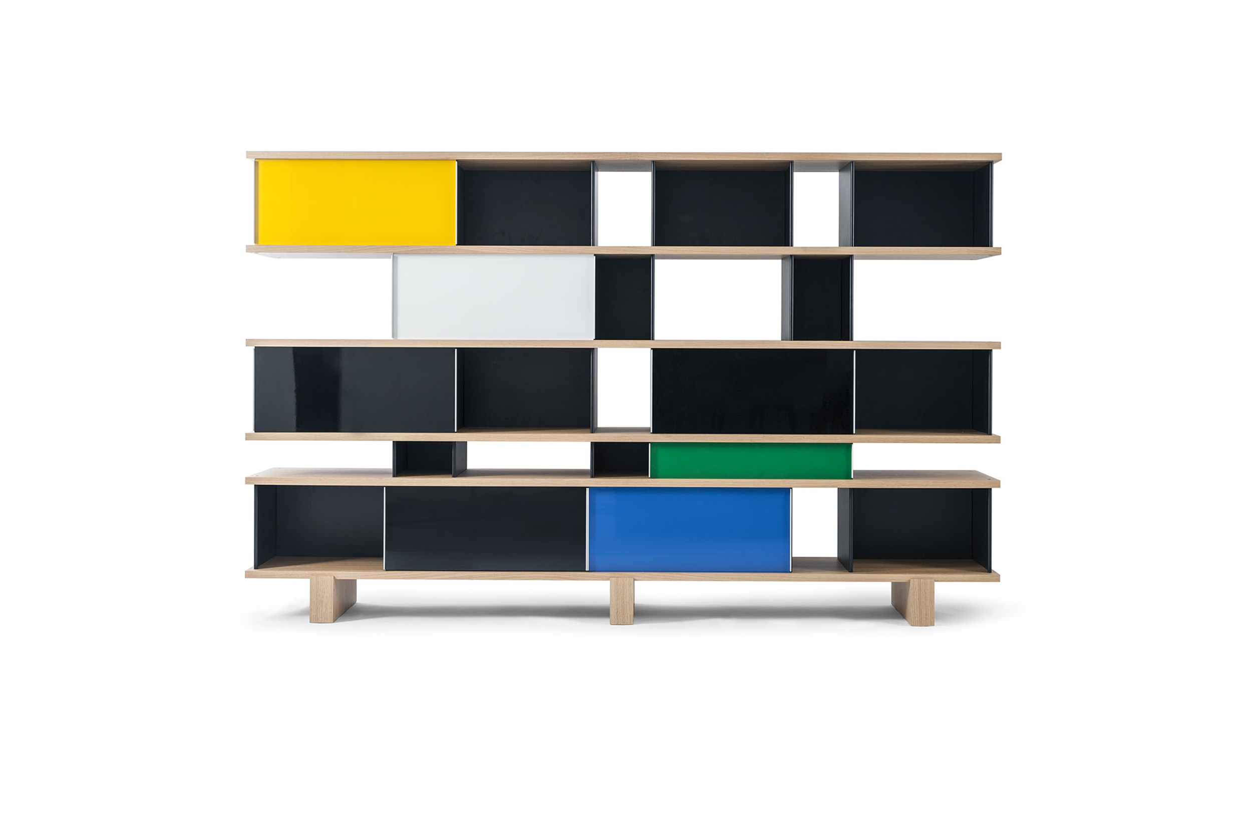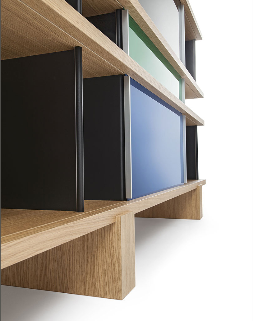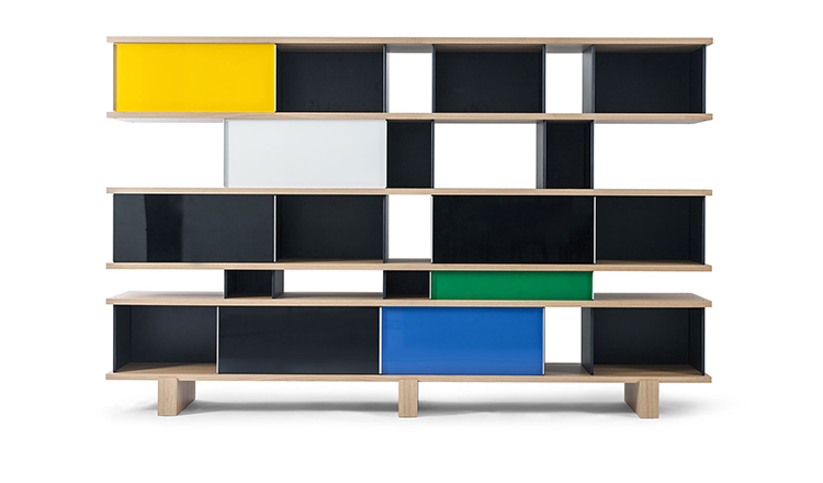 该系列包括餐边柜、碗柜和书架等,采用地面支撑或对称及非对称悬架,还包括与空间建筑风格相匹配的独立式书柜。基本单元组件为橡木搁架,阳极处理或黑色漆面的铝质单元。包括5种不同的高度,以实现物品和书籍不同风格的最佳布置。每种家具都配有附件,如铝盘等。书架滑轨采用阳极氧化铝、红色、蓝色、绿色、黄色、灰色、白色或黑色漆面。这款模块化书架由Charlotte Perriand设计,结构化处理运用巧能生精。对女设计师来说,每个模块结构并非一个单纯的块面,经过玩味地组合能有让人欣喜的效果。这件作品高度表现了Perriand在家具设计上的先锋精神,其对建筑艺术性、居住性,生活的信仰。