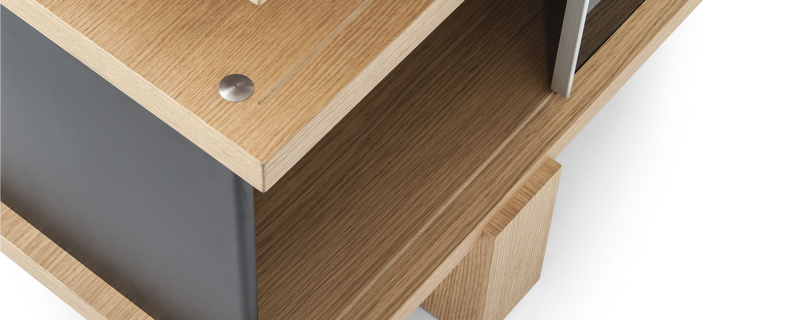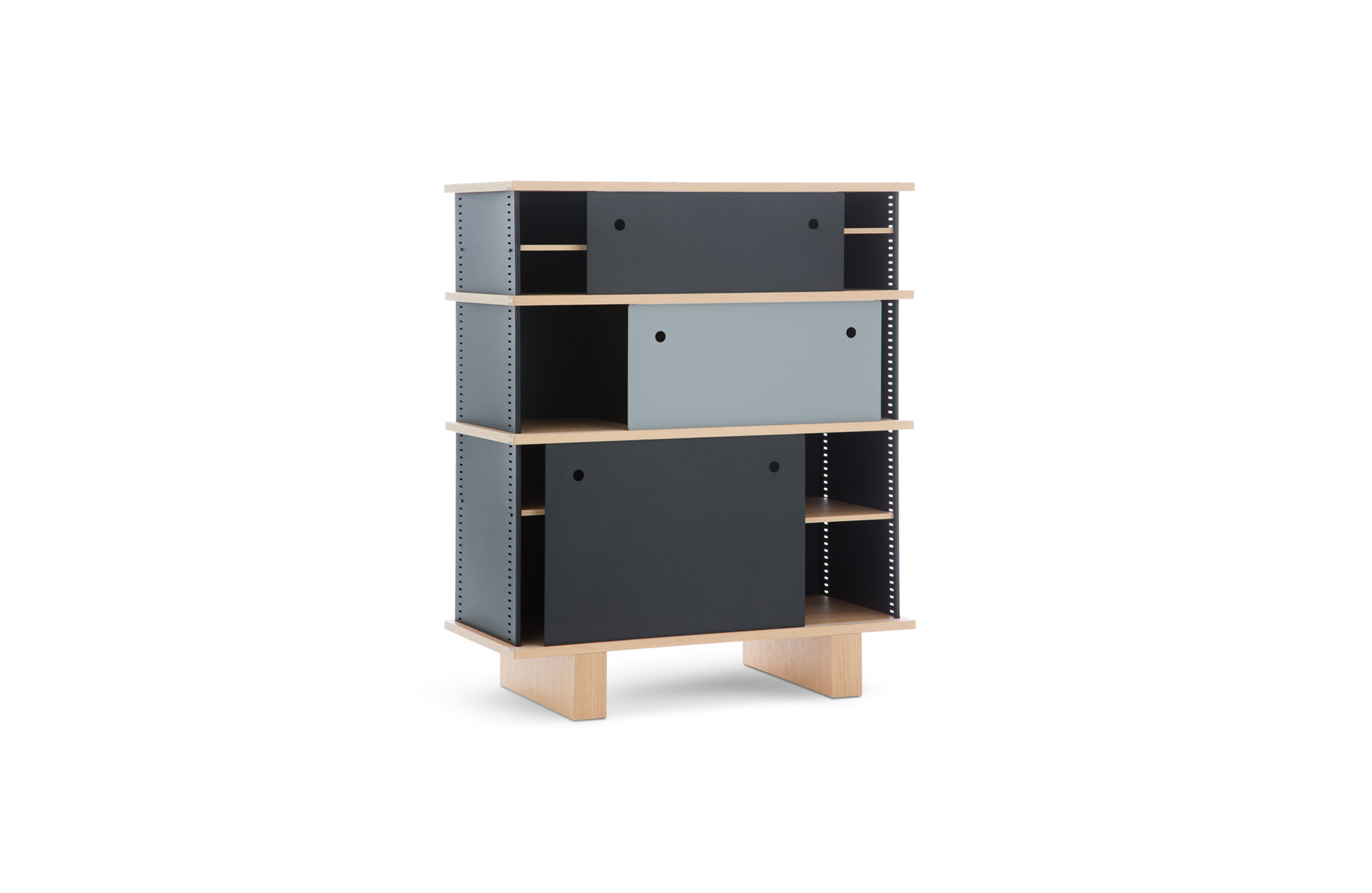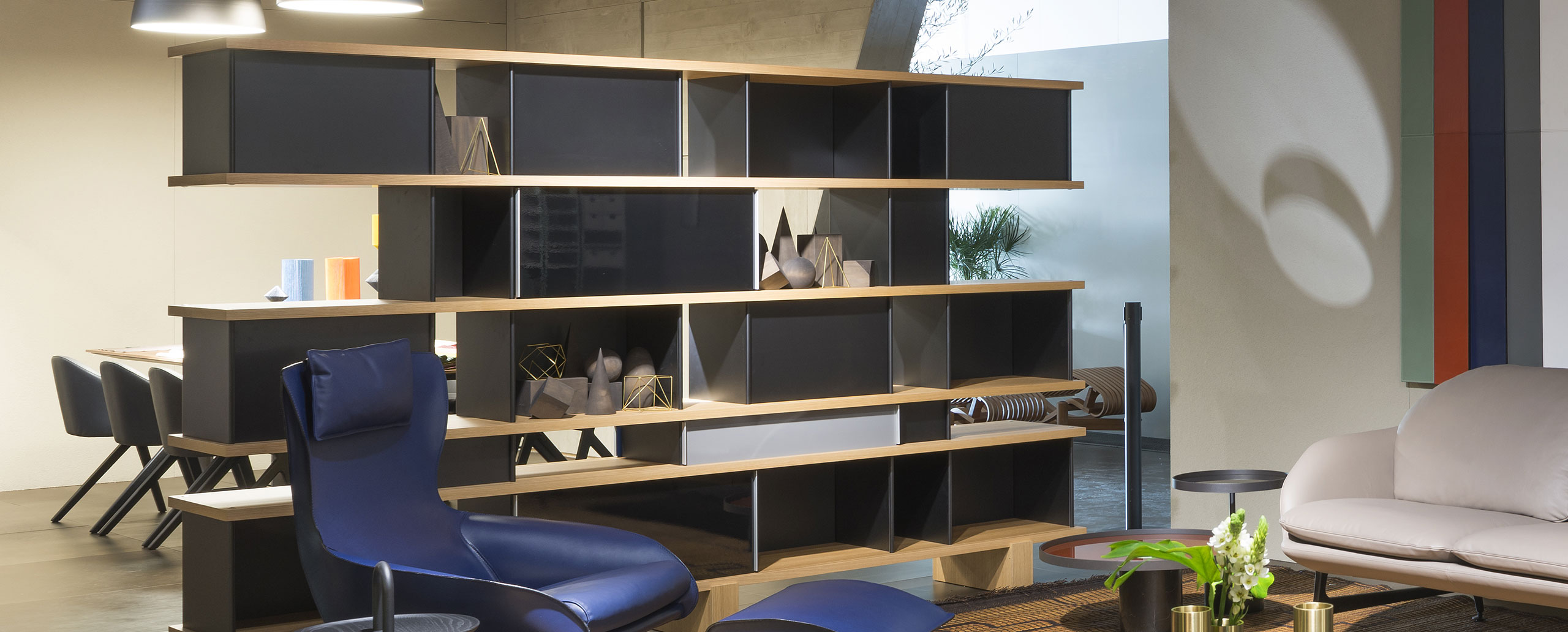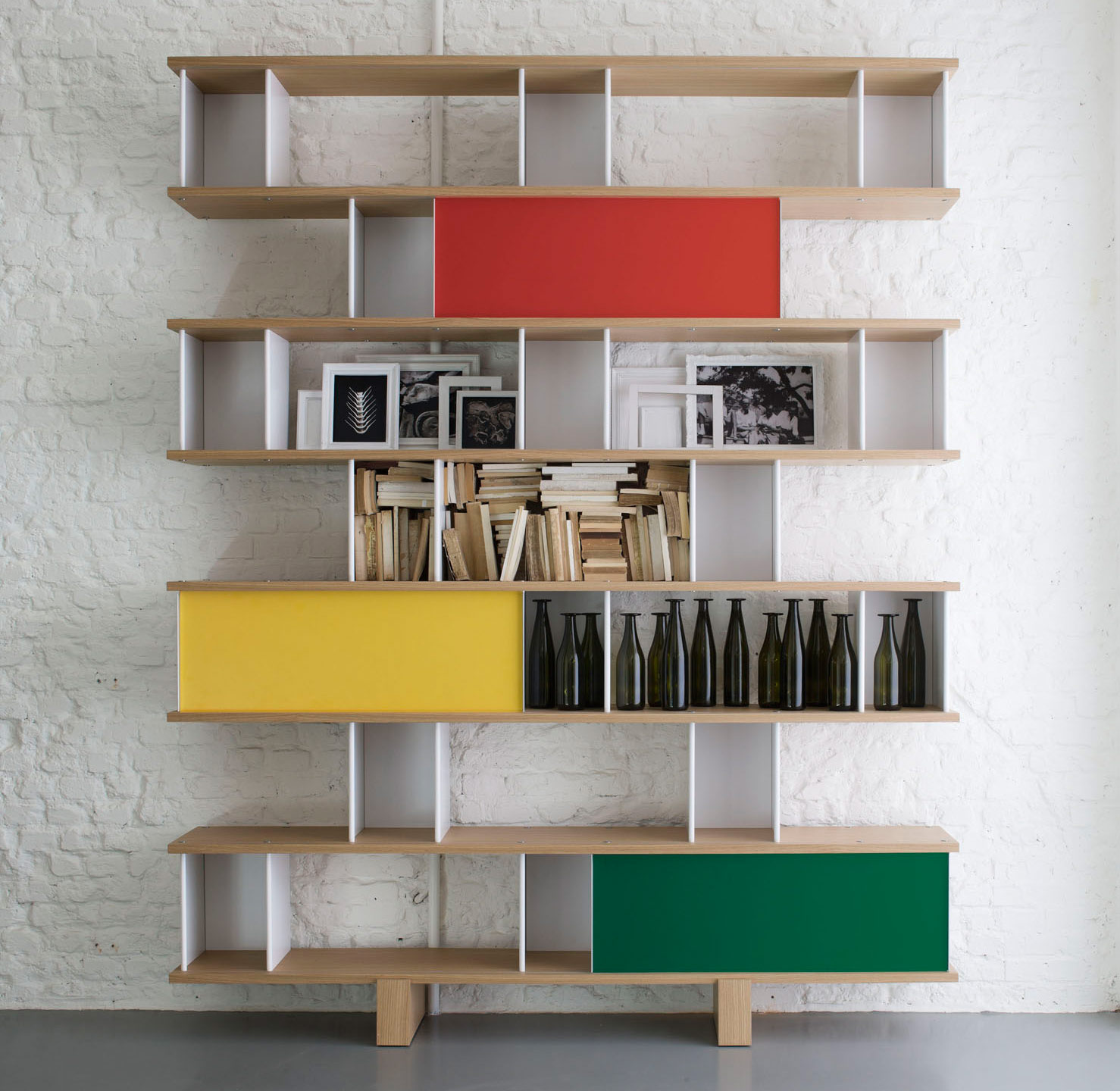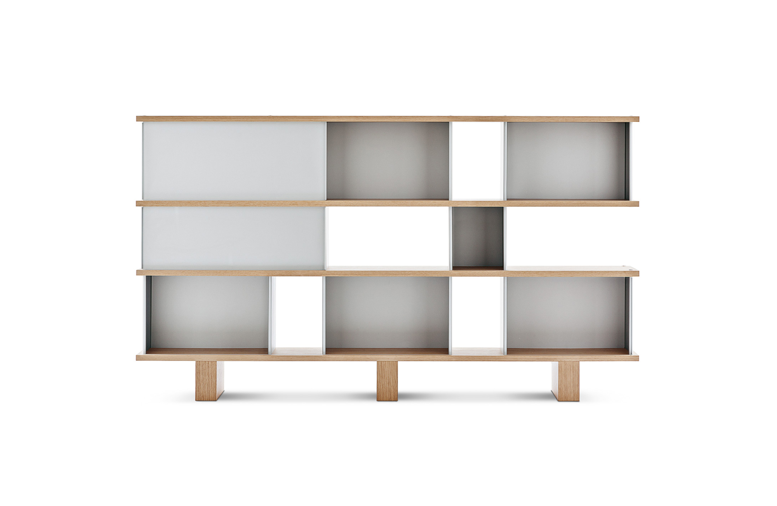 该系列包括餐边柜、碗柜和书架等,采用地面支撑或对称及非对称悬架,还包括与空间建筑风格相匹配的独立式书柜。基本单元组件为橡木搁架,阳极处理或黑色漆面的铝质单元。包括5种不同的高度,以实现物品和书籍不同风格的最佳布置。每种家具都配有附件,如铝盘等。书架滑轨采用阳极氧化铝、红色、蓝色、绿色、黄色、灰色、白色或黑色漆面。这款模块化书架由Charlotte Perriand设计,结构化处理运用巧能生精。对女设计师来说,每个模块结构并非一个单纯的块面,经过玩味地组合能有让人欣喜的效果。这件作品高度表现了Perriand在家具设计上的先锋精神,其对建筑艺术性、居住性,生活的信仰。