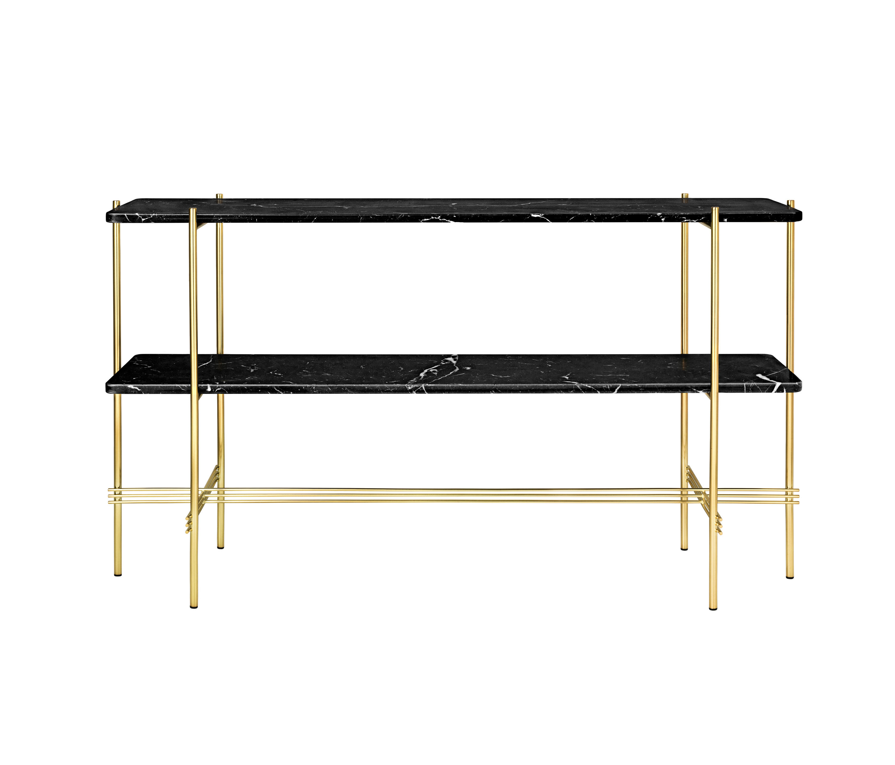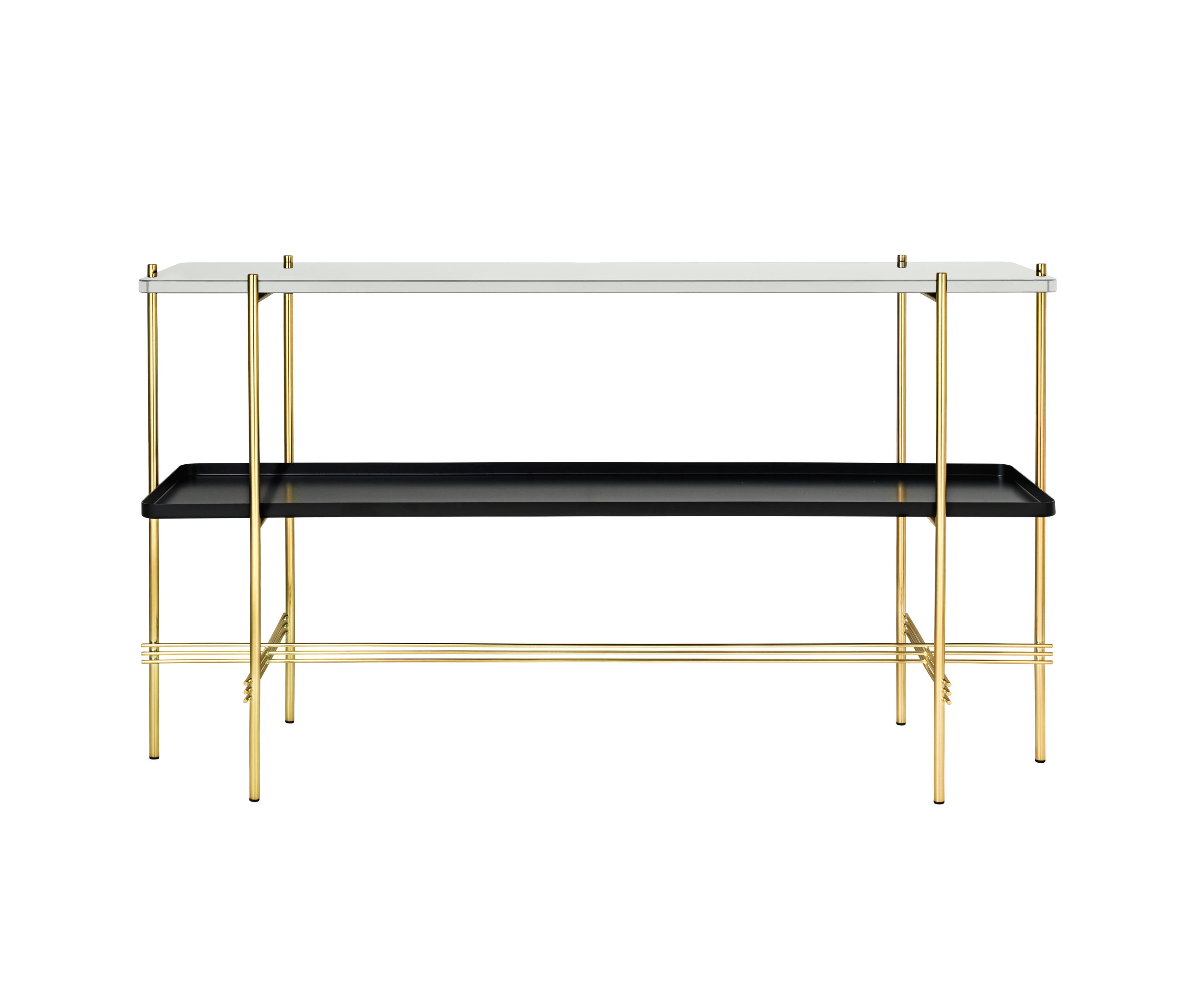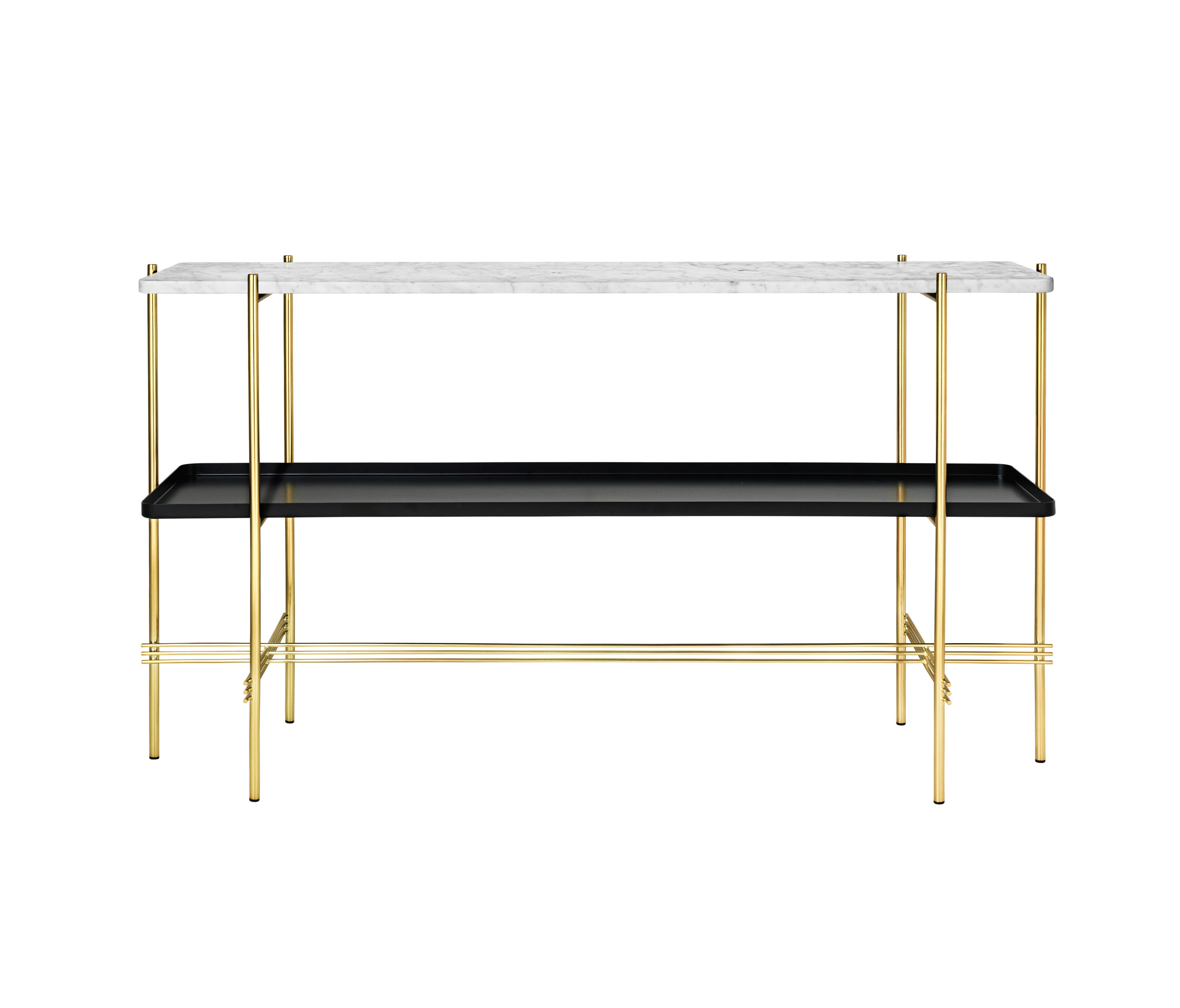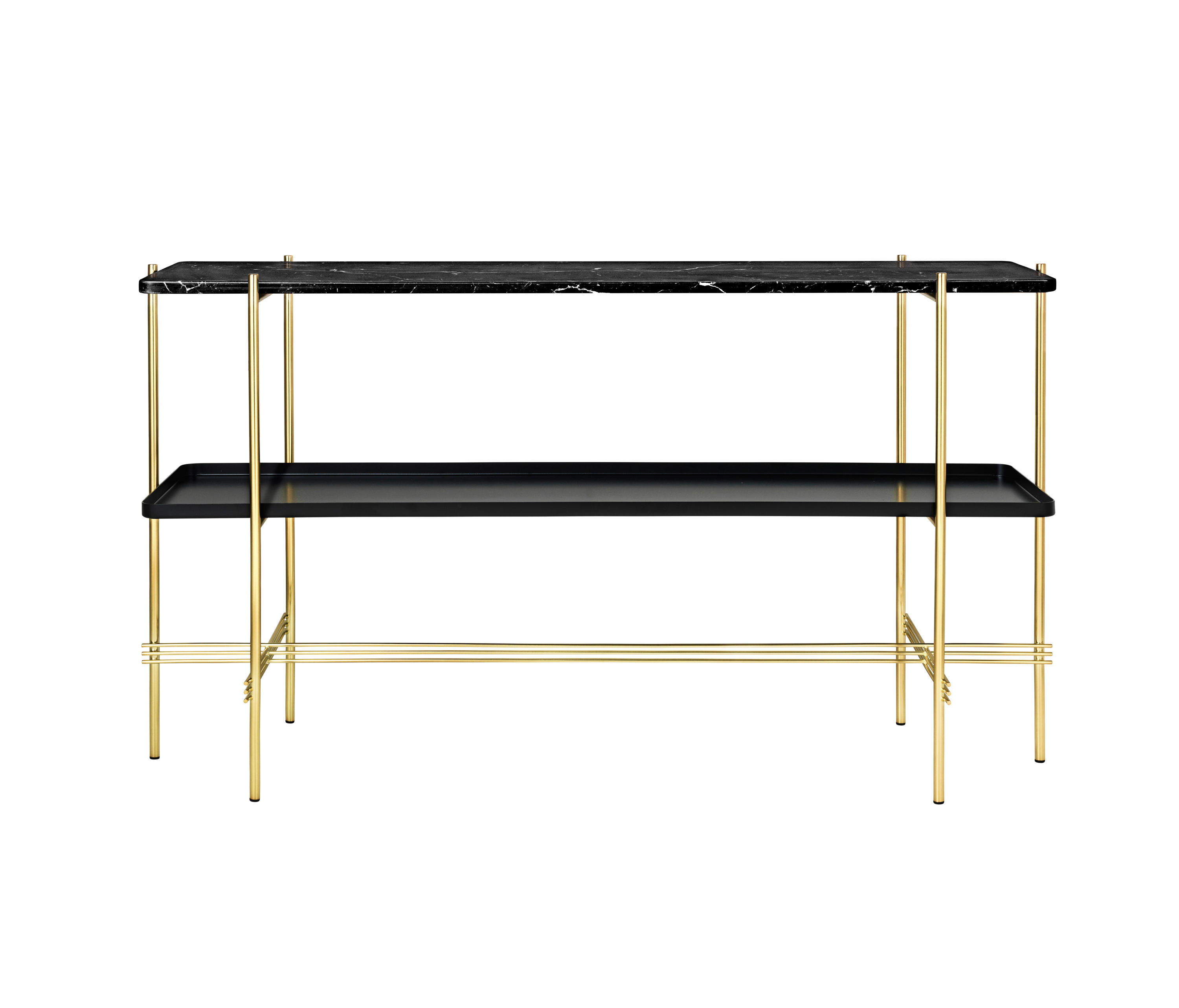 TS装饰架有两个版本——TS装饰架1和TS装饰架2。TS装饰架1有一个大理石托盘和TS装饰架2有两个大理石托盘,或一个大理石托盘和一个金属托盘。在两者上,一个黑漆框架是对比大理石顶部。