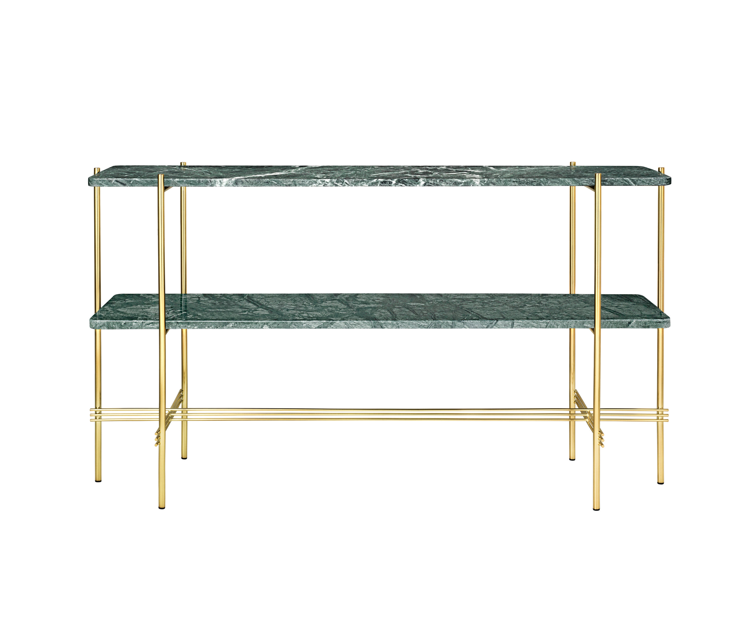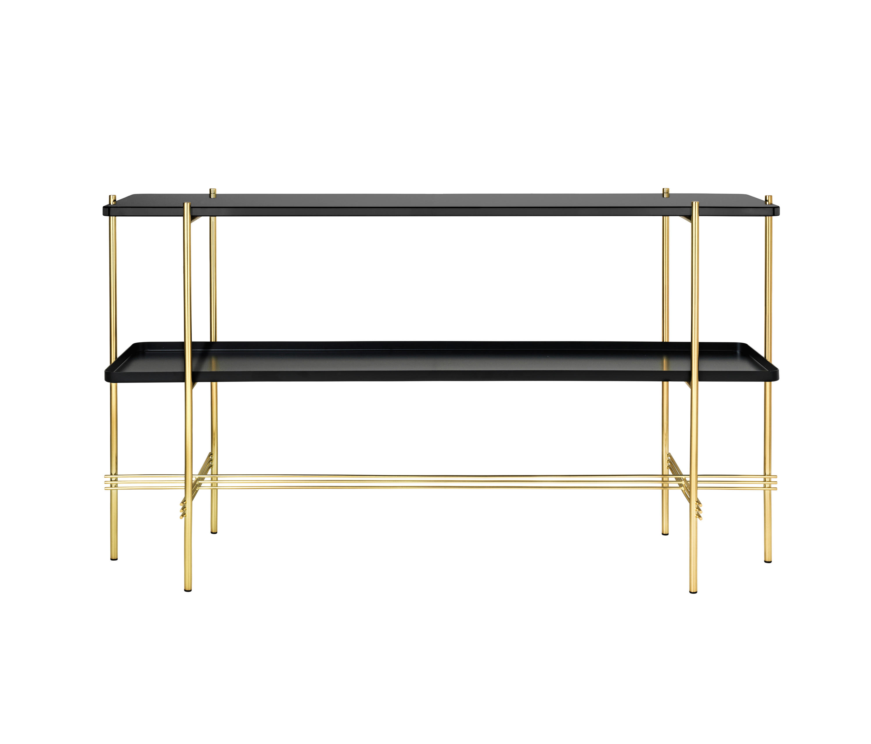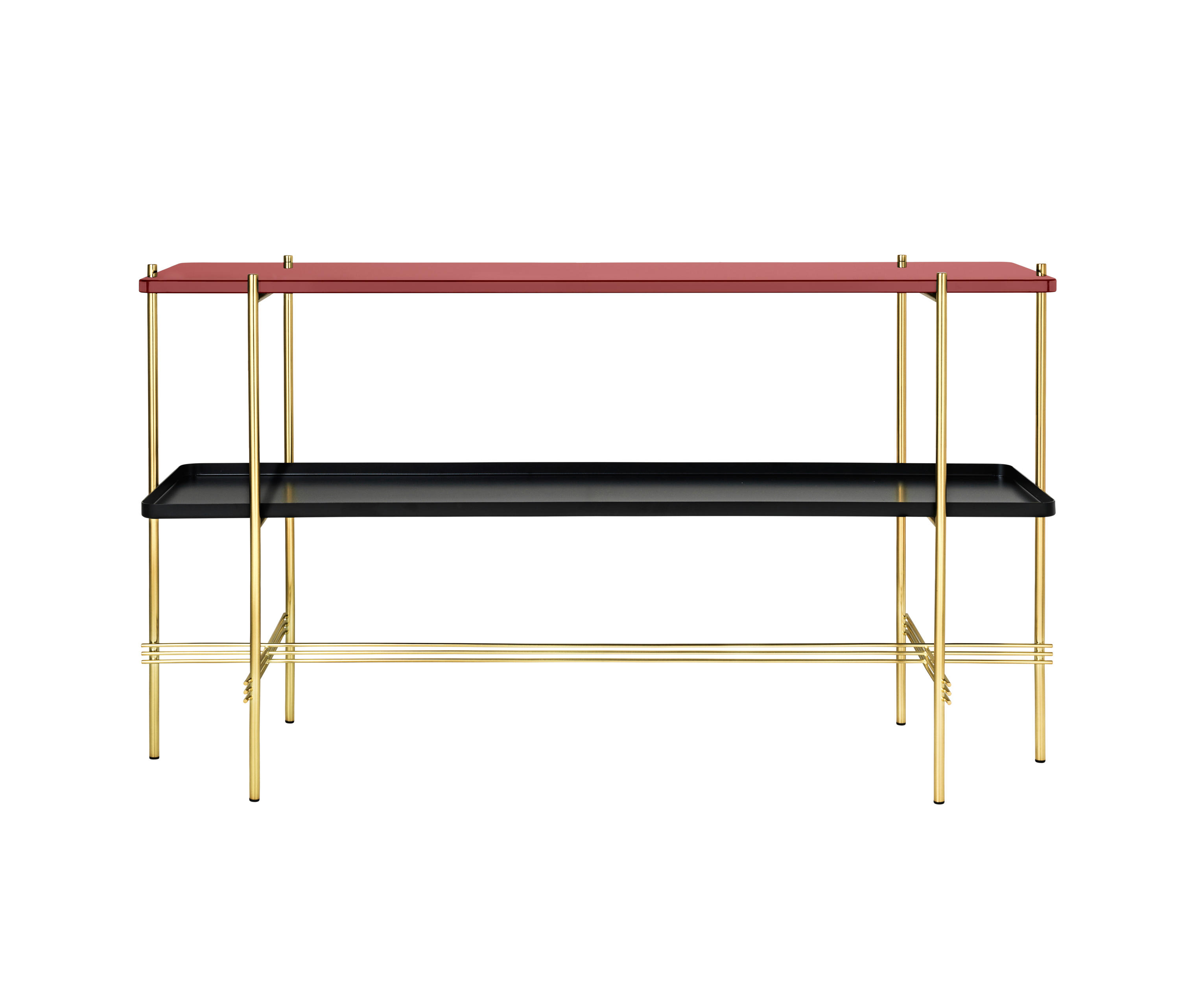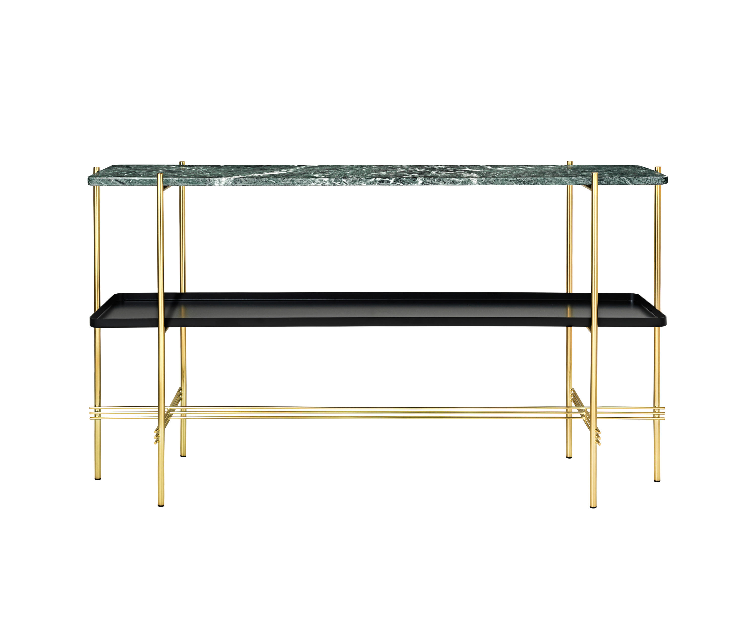 TS装饰架有两个版本——TS装饰架1和TS装饰架2。TS装饰架1有一个大理石托盘和TS装饰架2有两个大理石托盘,或一个大理石托盘和一个金属托盘。在两者上,一个黑漆框架是对比大理石顶部。