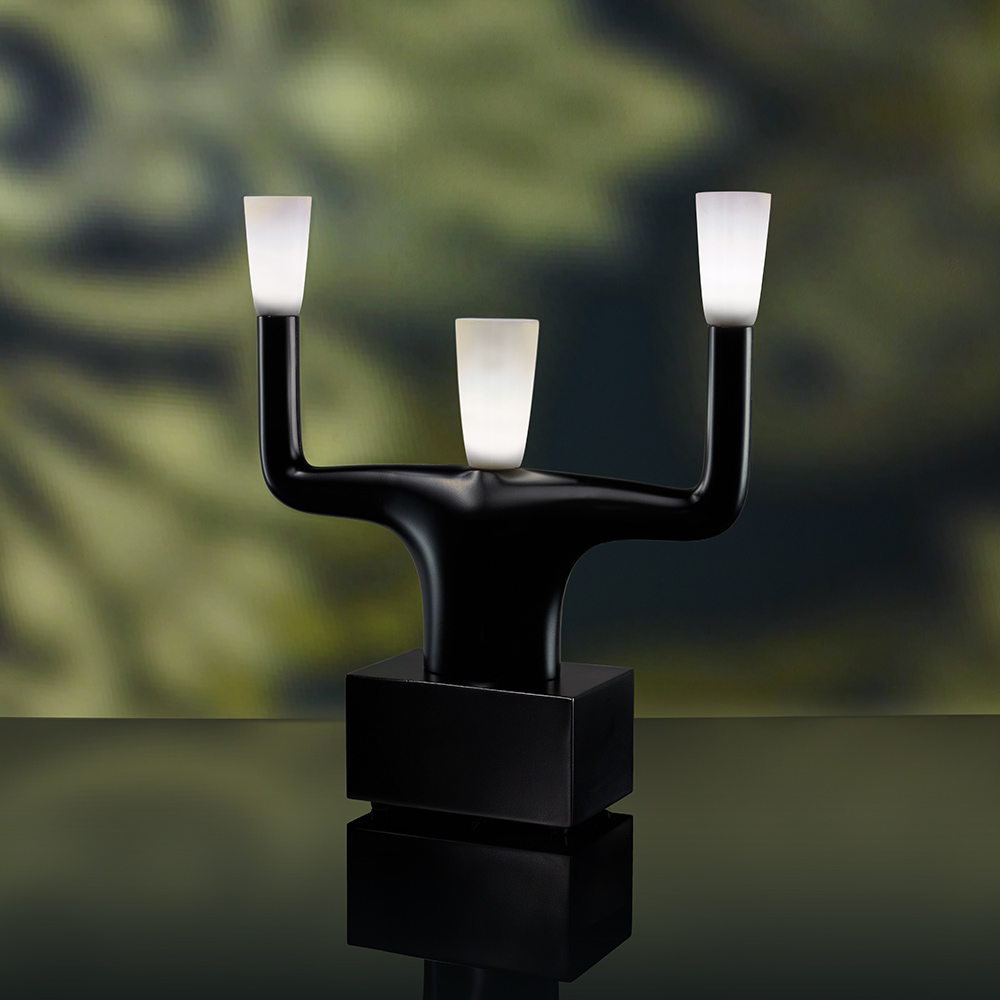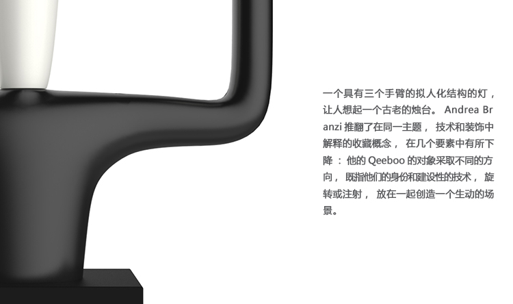 一个具有三个手臂的拟人化结构的灯,让人想起一个古老的烛台。 Andrea Branzi推翻了在同一主题,技术和装饰中解释的收藏概念,在几个要素中有所下降:他的Qeeboo的对象采取不同的方向,既指他们的身份和建设性的技术,旋转或注射,放在一起创造一个生动的场景。
