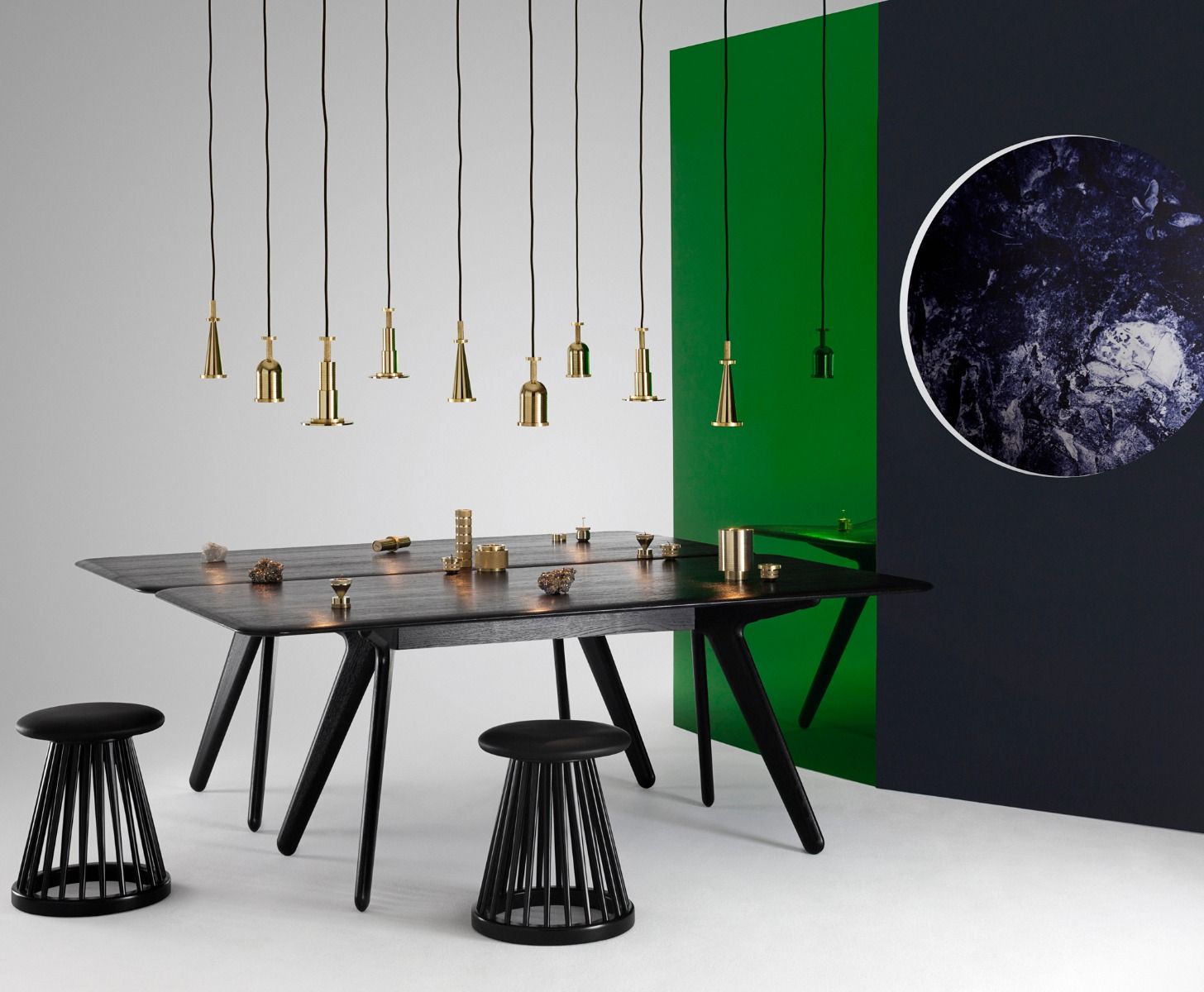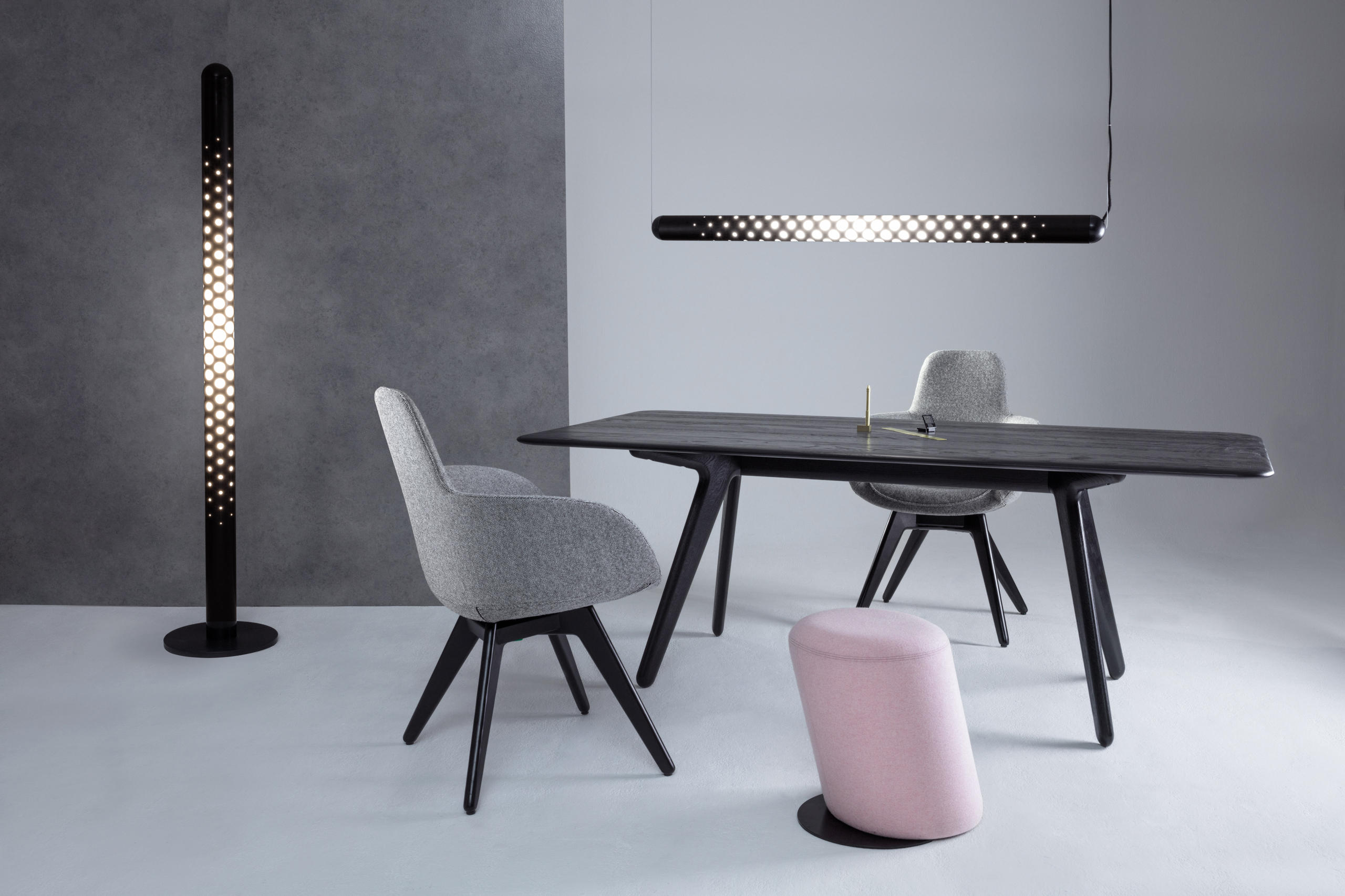 板形餐桌可使用自然漆或黑色漆完成。保留橡木的自然美,板坯收集是一系列以诱人的简洁的角度形式建造坚固的作品。表面被刷得很深,露出了颗粒。用黑色或天然漆完成。板坯收集包括一个酒吧凳子,椅子和桌子。