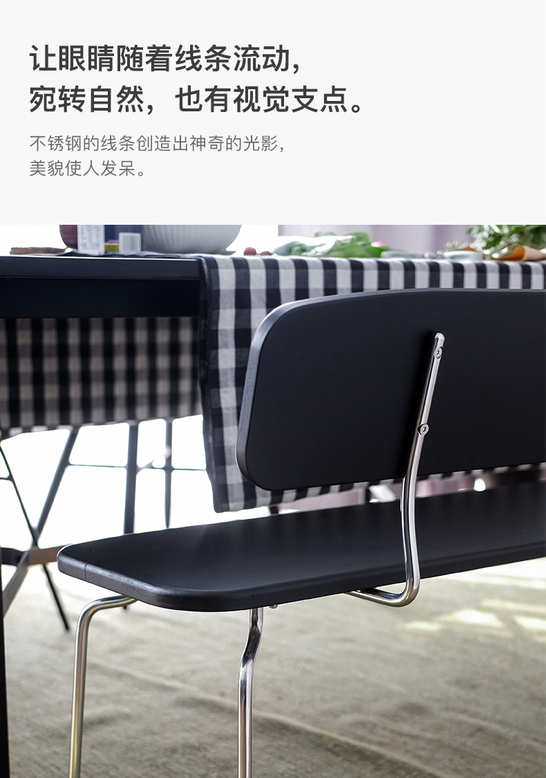 经典蚂蚁椅的设计师ARNE JACOBSEN说,美丽的线条带有微笑。我们不断调整, 直到它又舒服、又美貌。不锈钢的线条创造出神奇的光影,让眼睛随着线条流动, 宛转自然,也有视觉支点。背面同样精心设计,好看的角度一键全选。 使用实心的304不锈钢,坐下时,可能感受到小的缓冲,是金属特有的韧性和弹性。